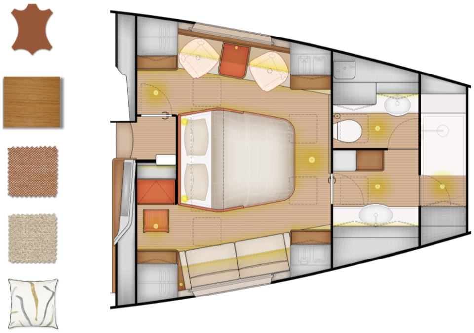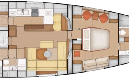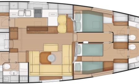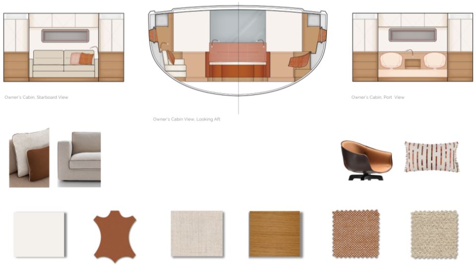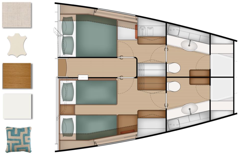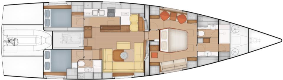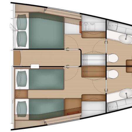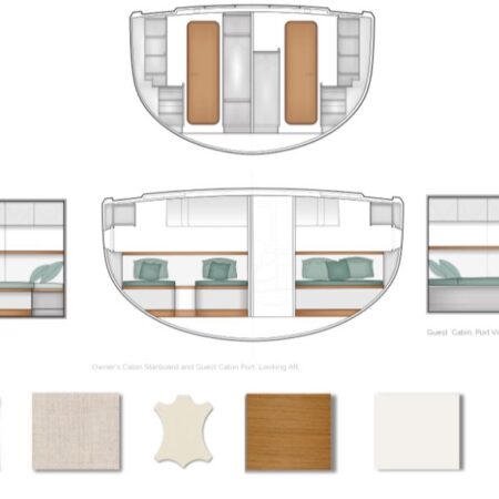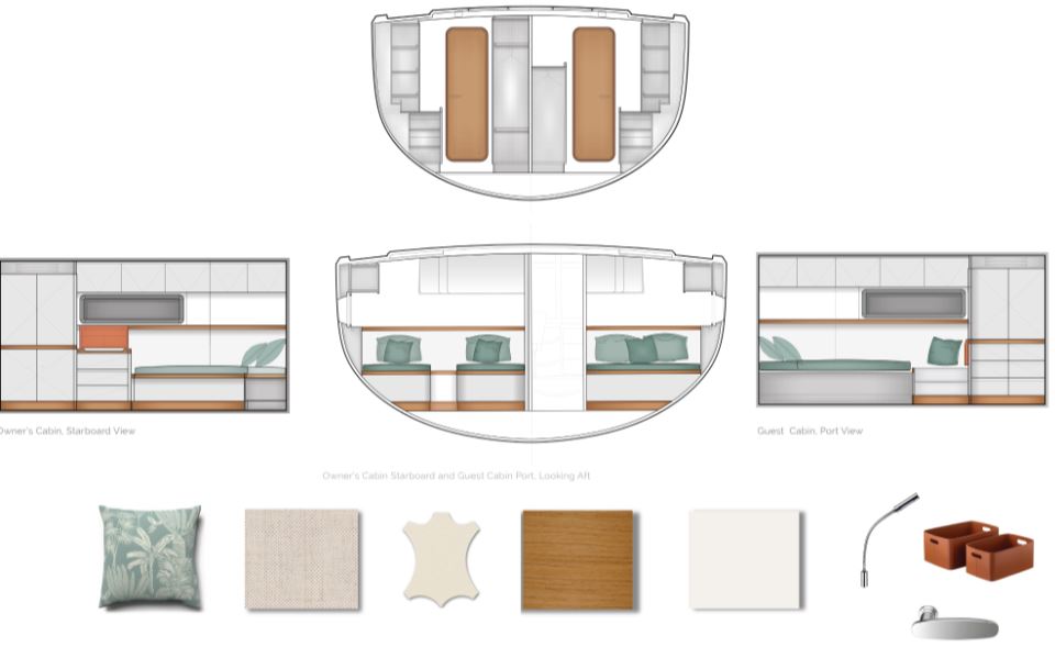 Comfort is another major USP. There is an initial choice between layouts with three or four cabins, and two or three bathrooms. In the three-cabin layout, the forward section is reserved for an owner’s suite, while guest cabins sit aft, separated by a central living space. One standout feature is the seamless connection between cockpit and saloon via sliding glass doors, creating a single indoor–outdoor living area. Large windows provide panoramic views and natural light, enhancing the sense of space in the same DNA as the Pegasus 50.