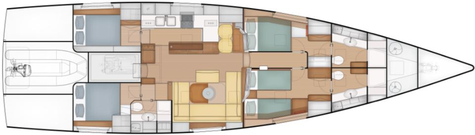A key design philosophy behind the Pegasus 67 is easy short-handed sailing, as well as safety. The hull and sail plan are optimized so that two people can realistically operate the yacht without needing a full crew, which is unusual for a boat of this size. Features like twin rudders and retractable thrusters as standard improve handling both offshore and in tight marina spaces. The relatively light displacement also helps reduce sail loads, making manoeuvres easier and safer, while the higher righting moment allows later reefing and increased stability without compromising performance, as many of her peers are guilty of doing.