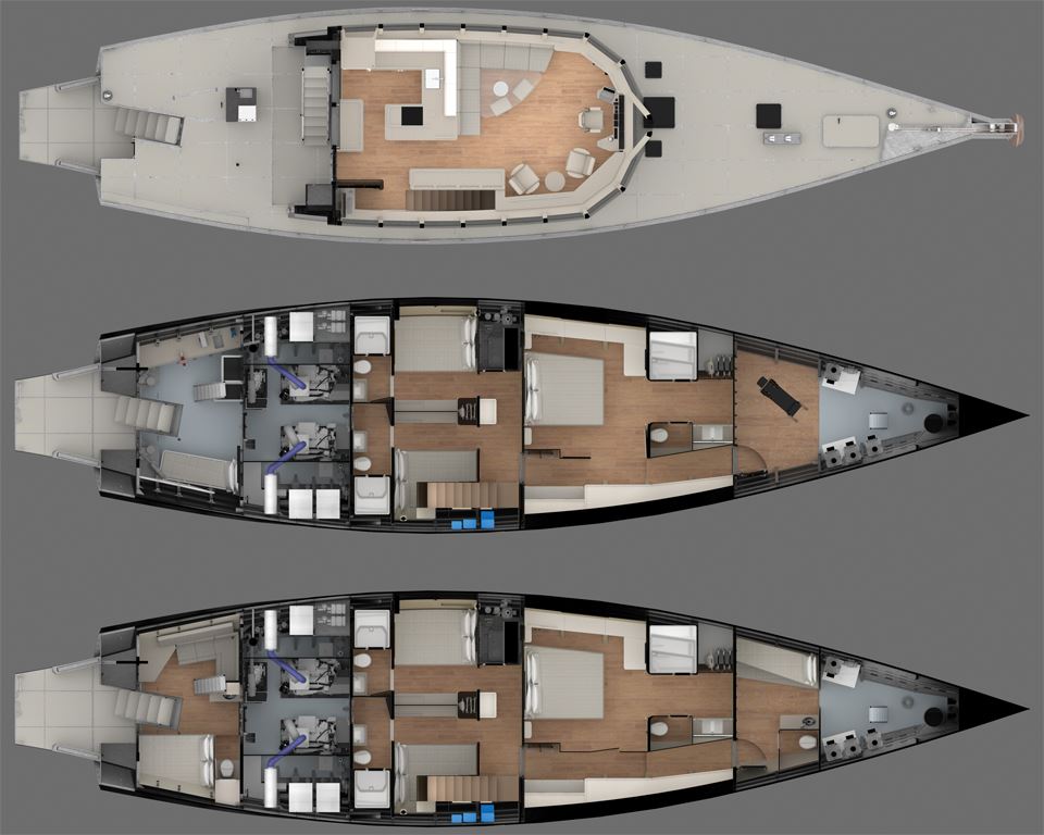 Forward of this are 2 generous double cabins each with ensuite heads. A lower deck corridor then provides access to a lower deck office and large owners’ stateroom with a large forward lazarette beyond which can also be used to create a further double berth cabin with en-suite and still have room enough for storage forward of this.