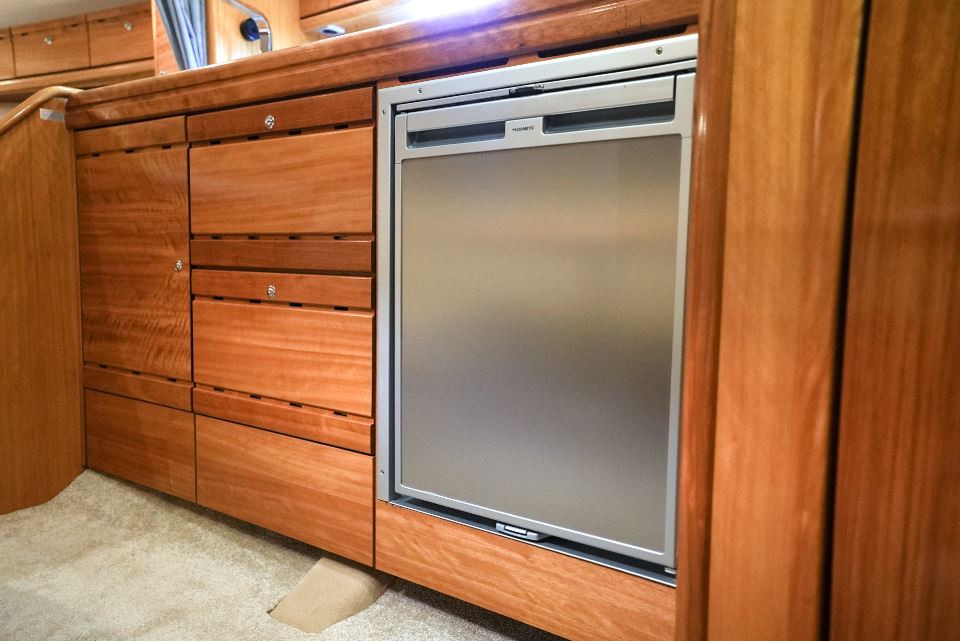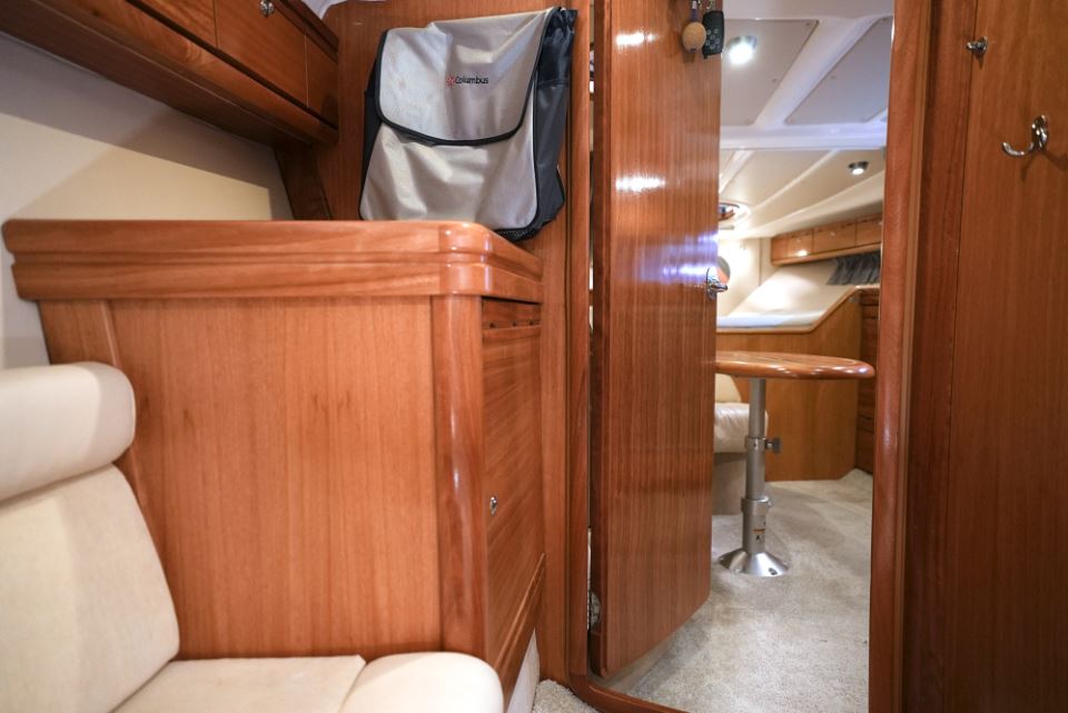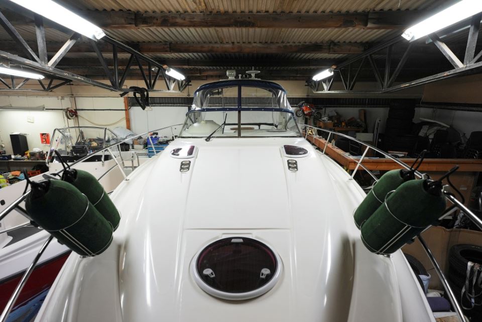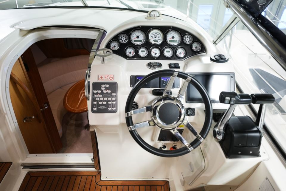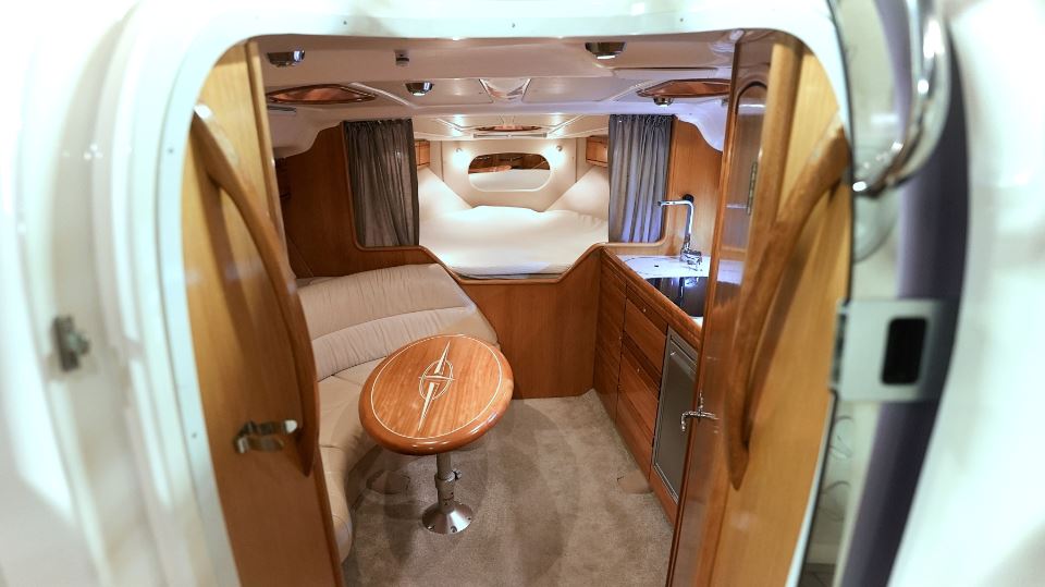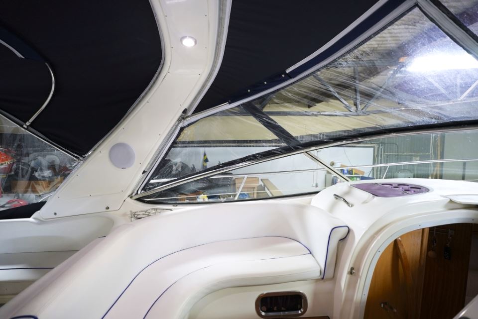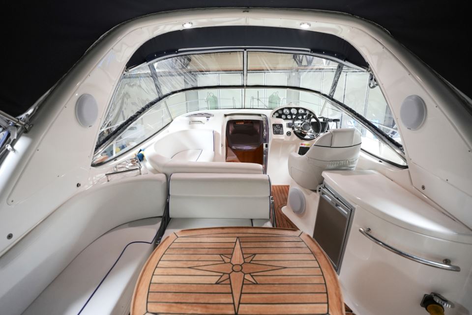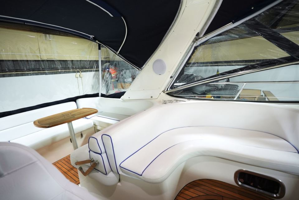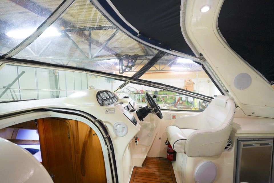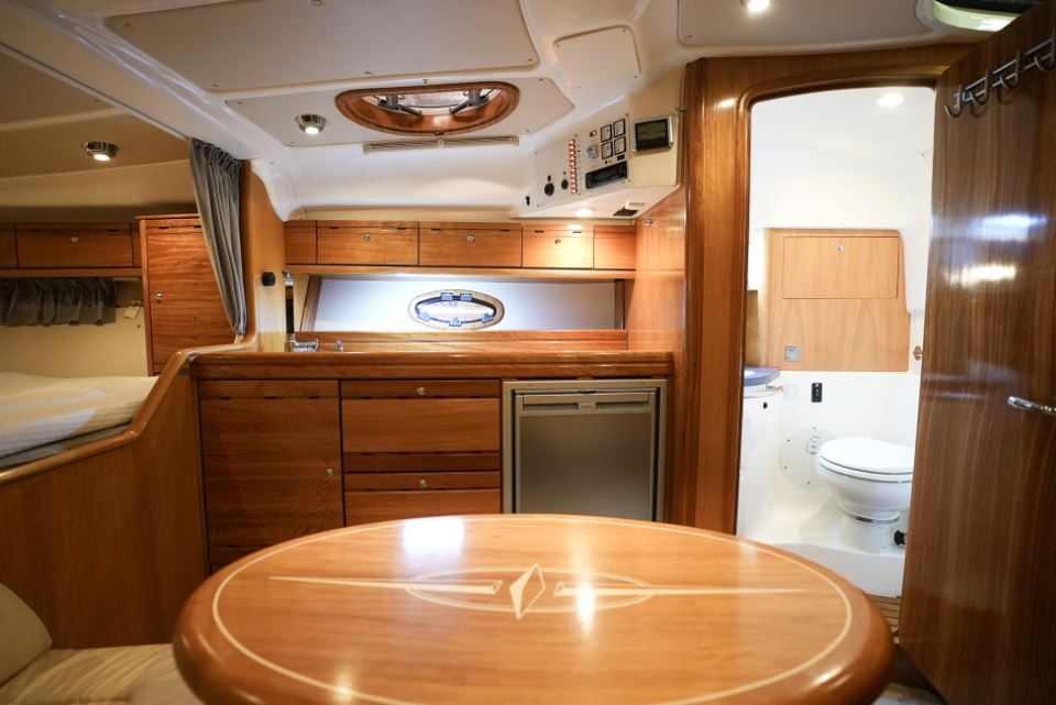 This 2006 example is in good condition for its age. The underwater hull was blasted and rebuilt in 2023 and the canopy from the same year gives the cockpit a fresh overall impression. The galley and wet bar have been improved with two new stainless refrigerators and a newer stove, and at the helm the seat and wheel have been upgraded. A newer stereo and sound system together with the oiled teak in the cockpit create a modern and well-kept appearance. The boat has been stored indoors in a heated hall during winter, which has helped maintain its excellent condition.