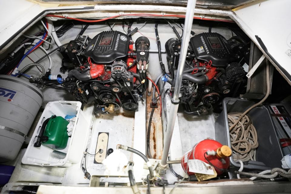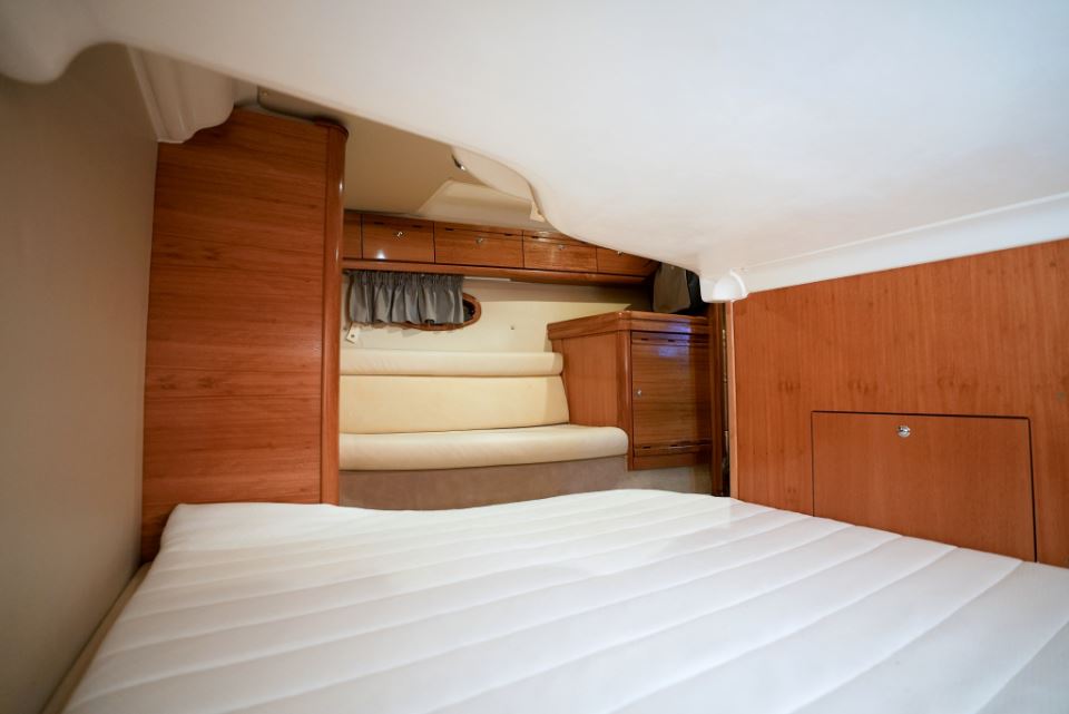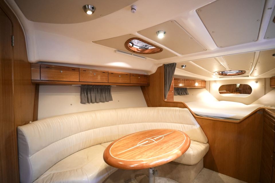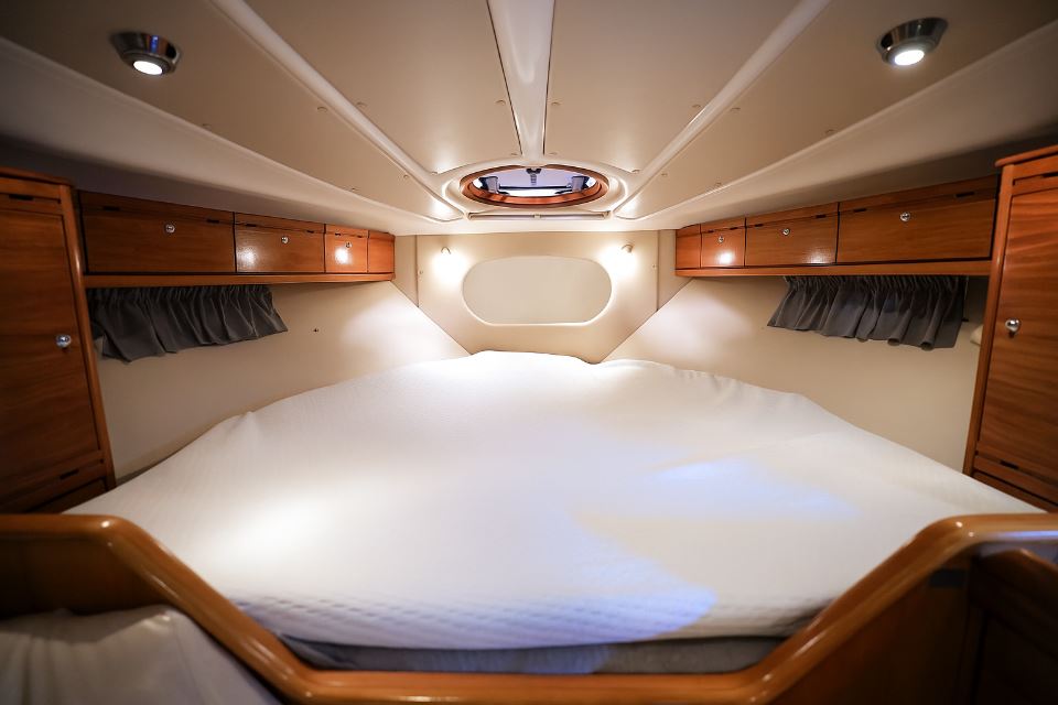 The boat is easy to handle, and the twin Volvo Penta 4.3 GXI engines provide smooth acceleration and stable running. Manoeuvring is assisted by the bow thruster, trim tabs and electric windlass installations both forward and aft, making the boat easy to dock even in tighter harbours.