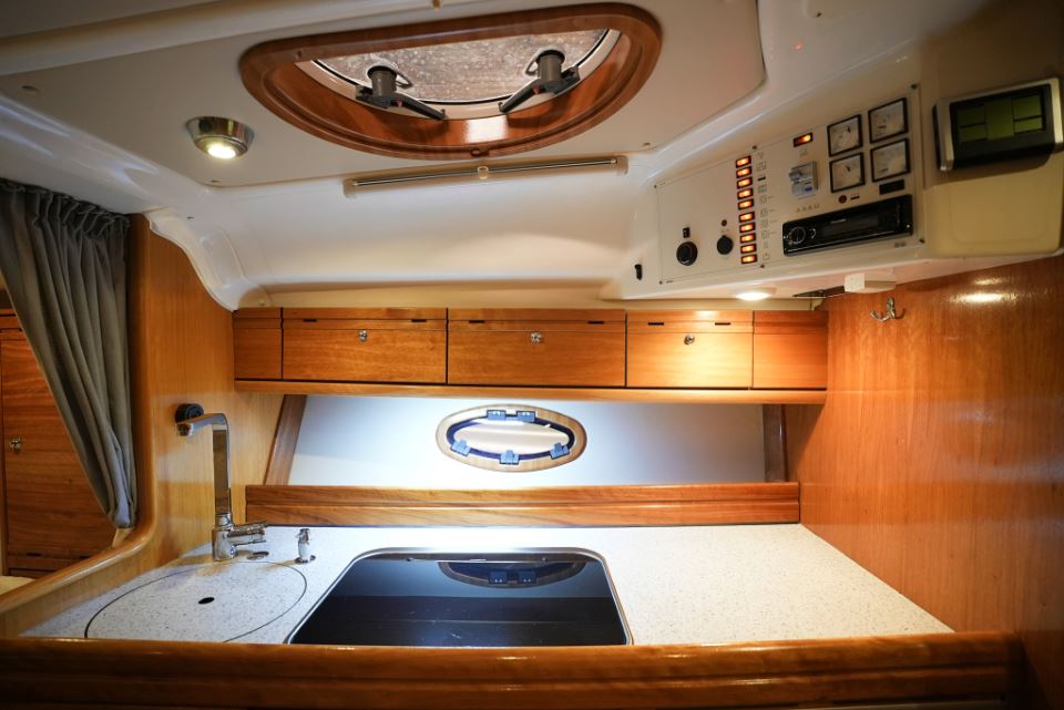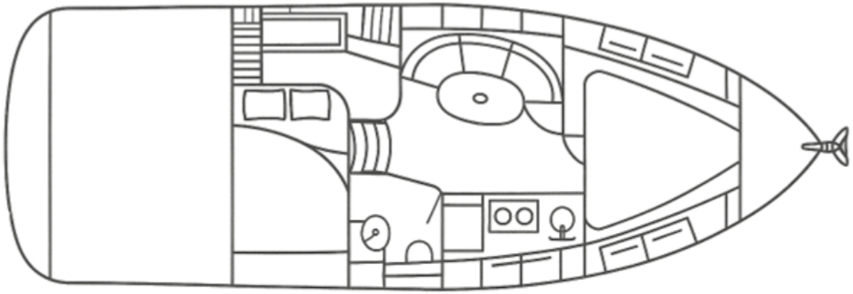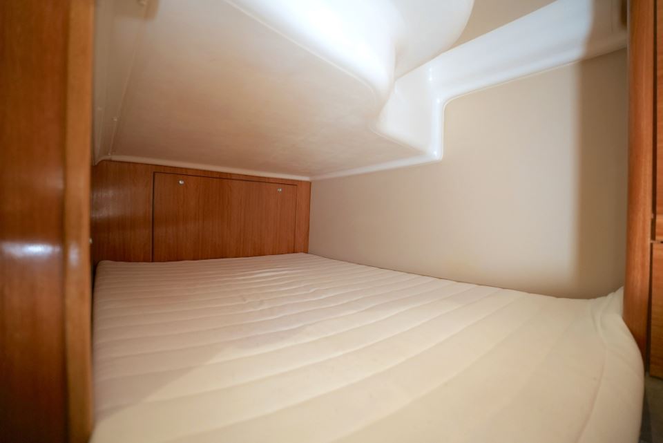 The cockpit serves as the natural meeting point on board, with teak flooring, a wide bathing platform and an aft seating area that creates a pleasant and social space with good access to the water. Below deck you are met by a bright and spacious saloon with galley, heads compartment and a roomy forward berth. Aft there is a separate cabin with a wide double berth, wardrobe and small sofa. The layout makes longer stays on board possible and comfortable for a smaller family, despite the boat’s size.