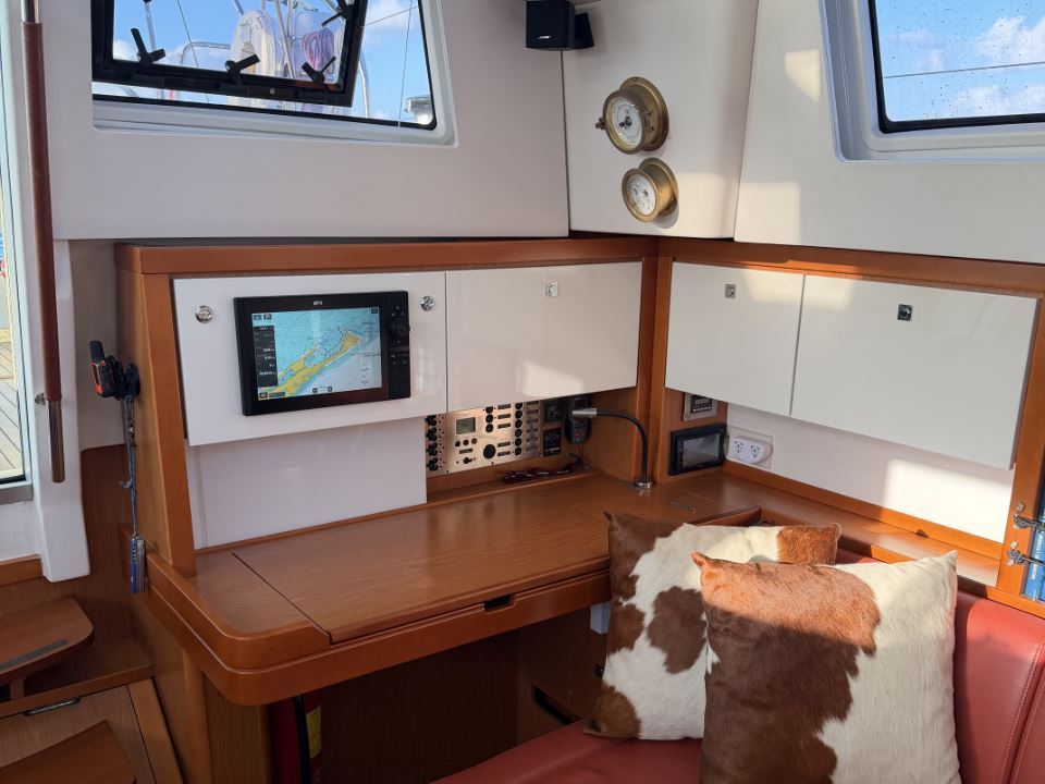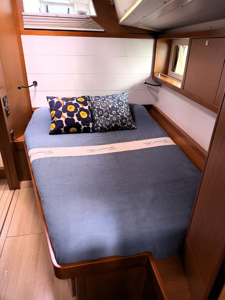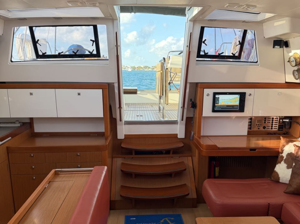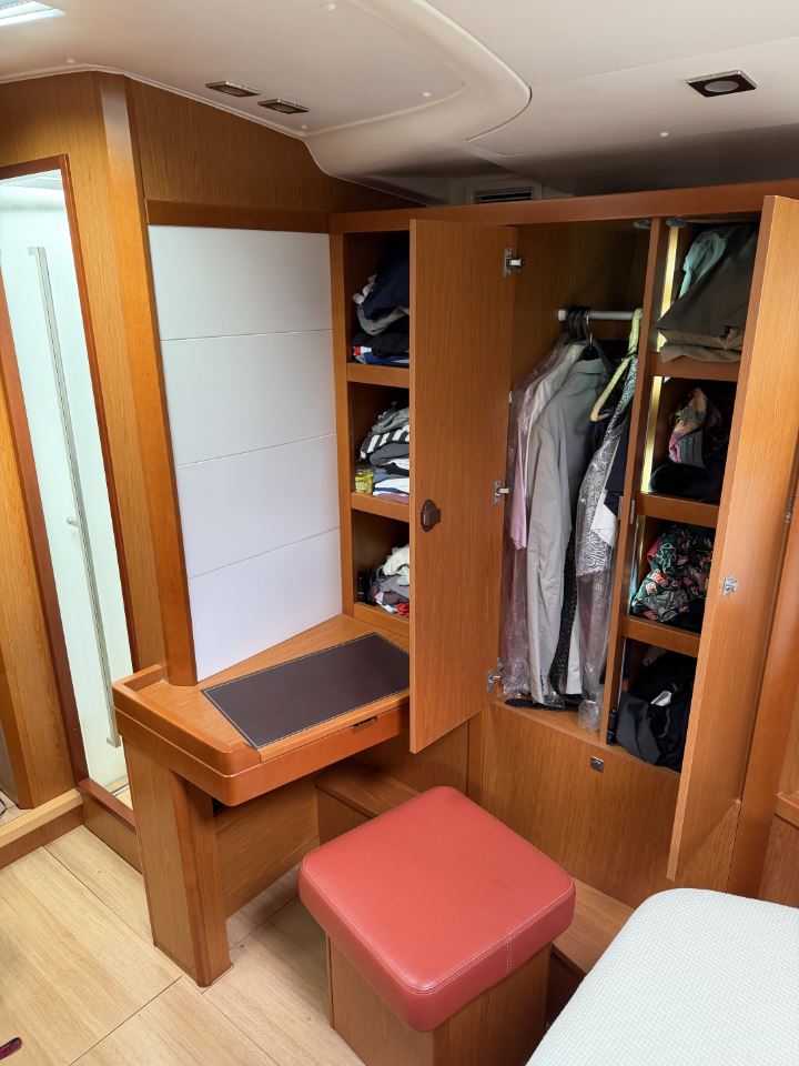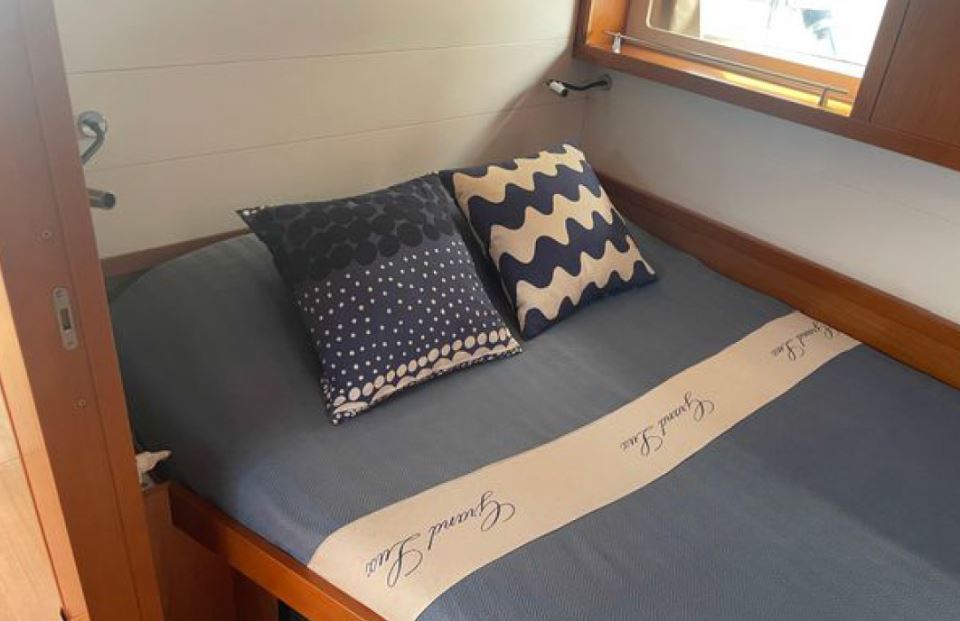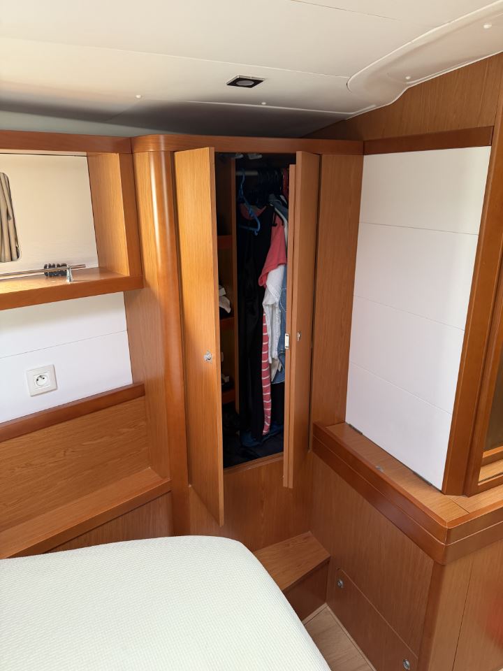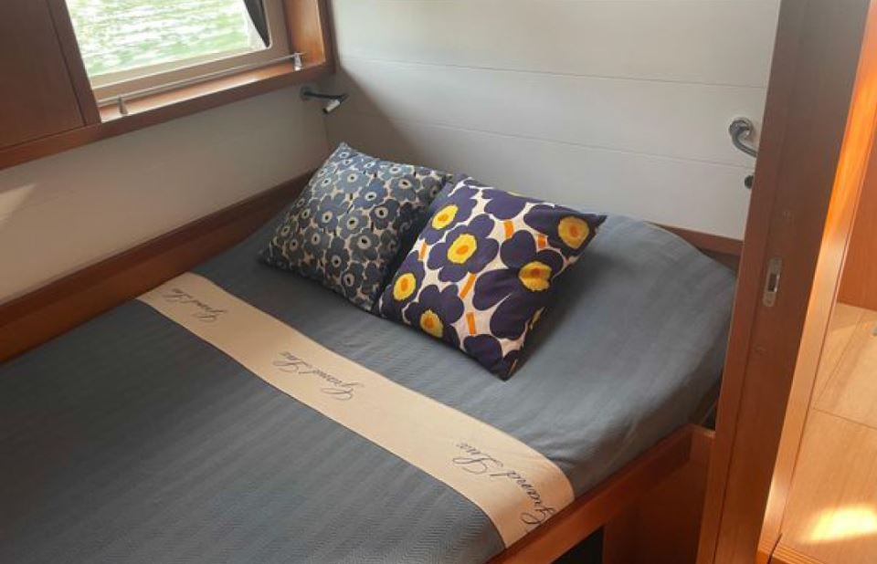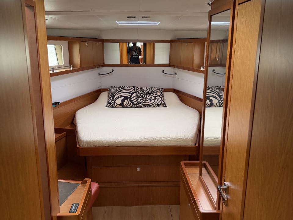 The many factory options on GRAND LUX include air-conditioning and heating, a Onan 7KW generator, microwave, washer/dryer, electrically lifting saloon and cockpit dinettes, electrically lifting saloon TV, an extensive sail inventory, an upgraded Dock & Go joystick docking system, electric winches, a captain’s cabin in the port cockpit cabin, custom bedding, and an extensive assortment of spare parts and tools.