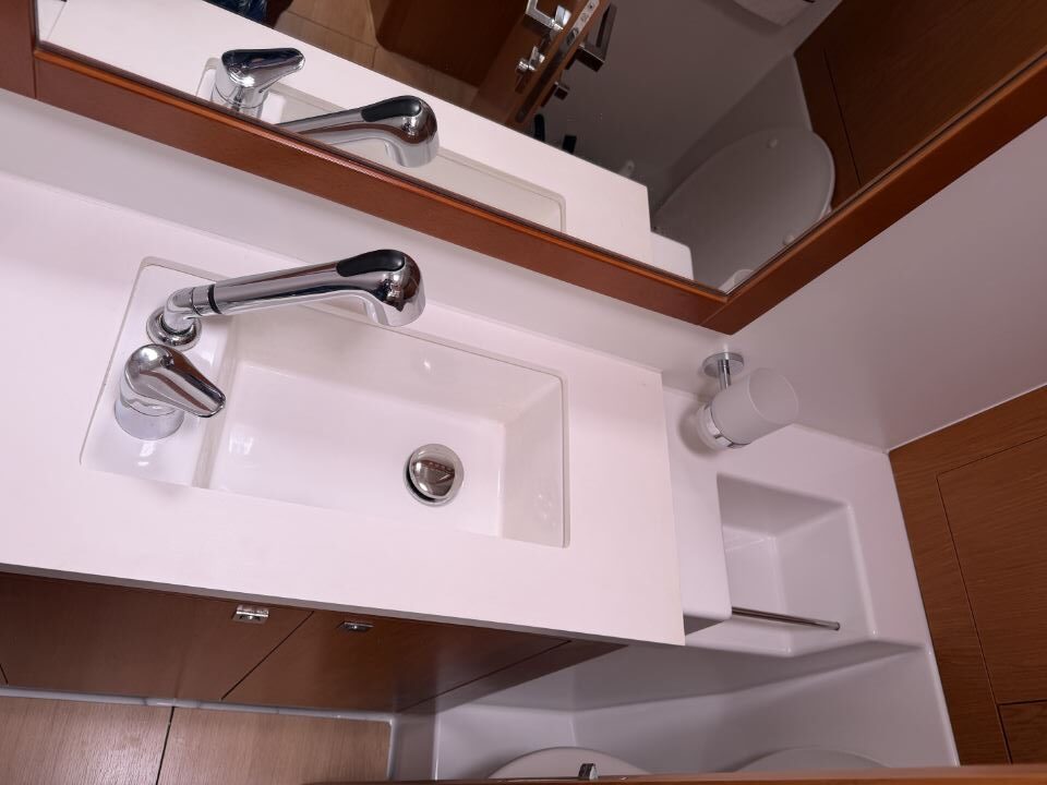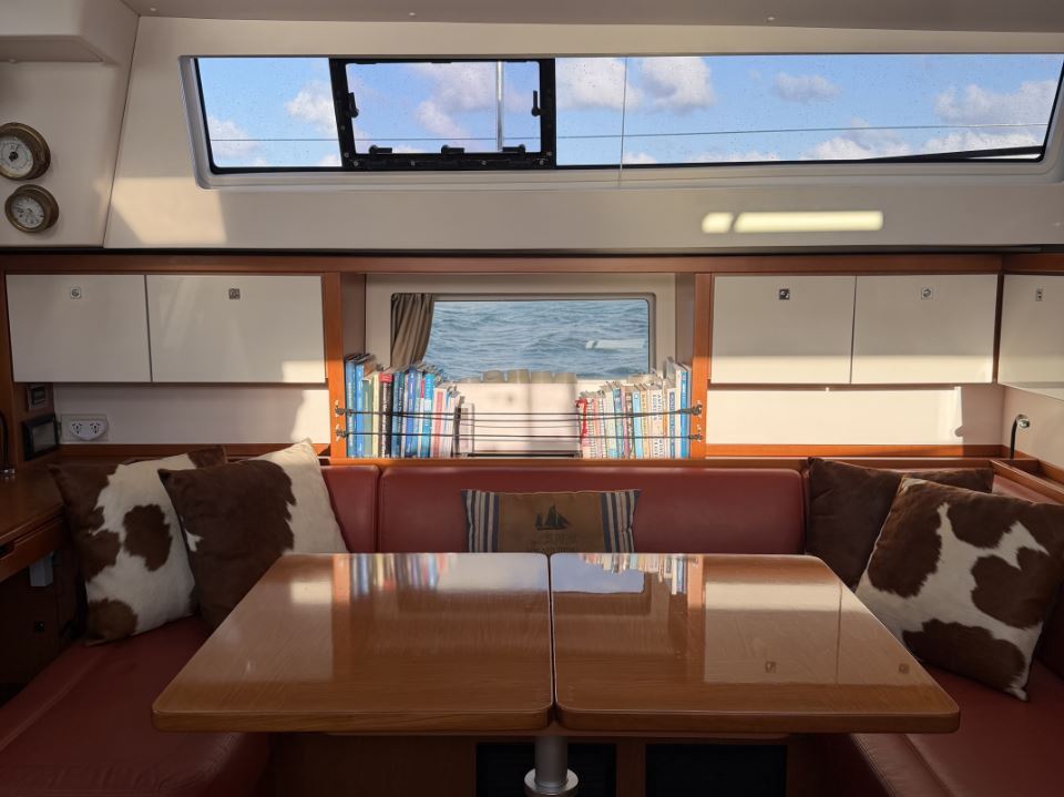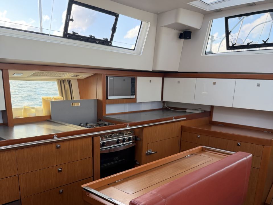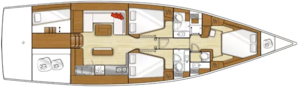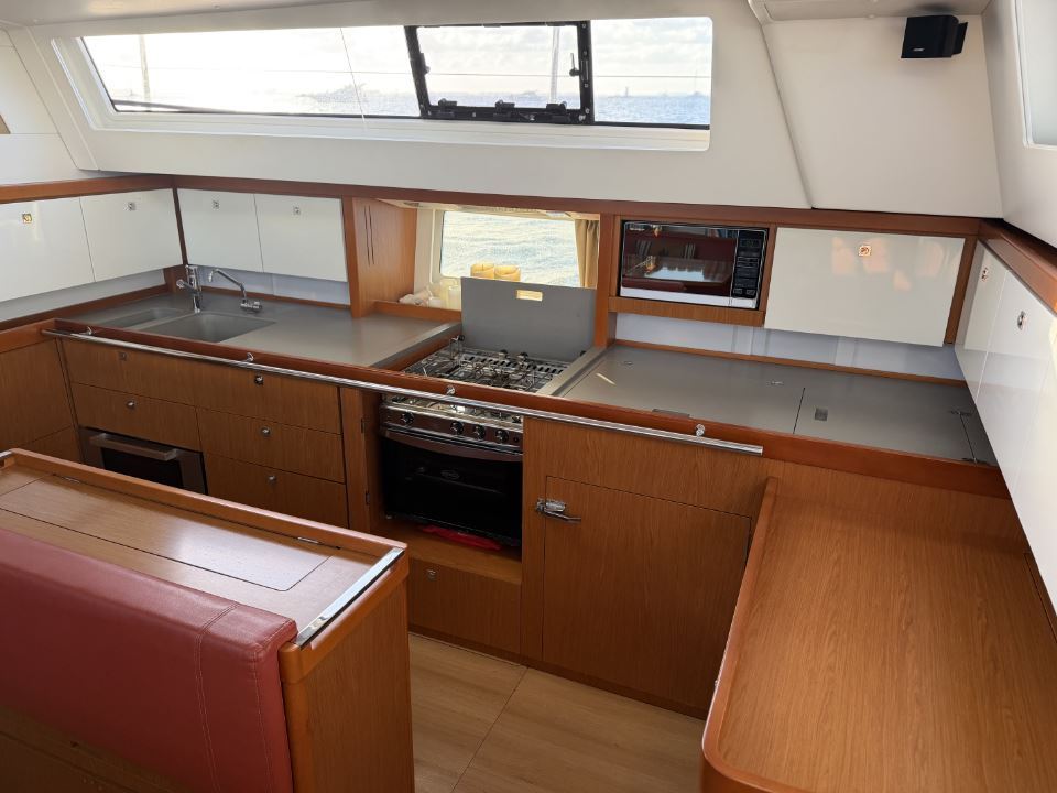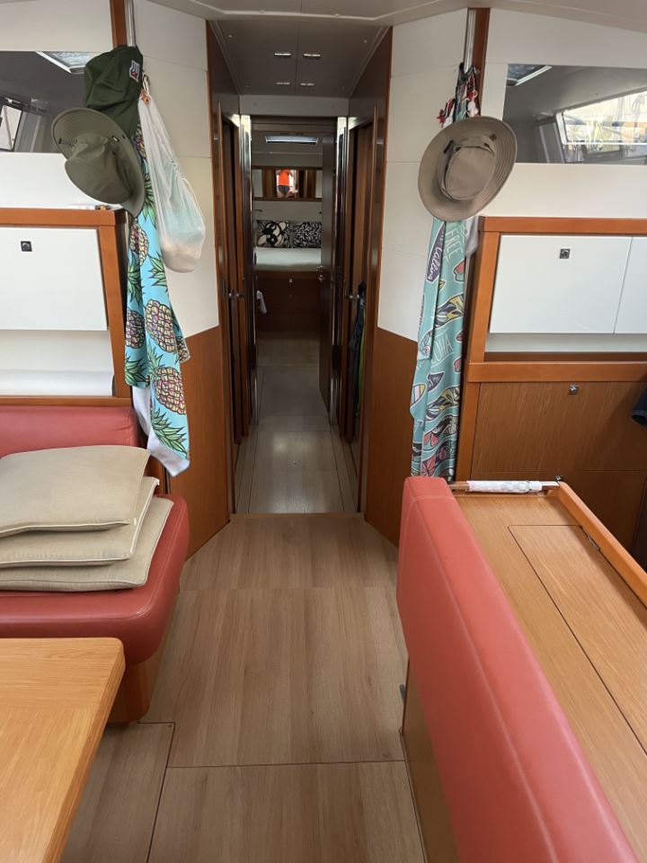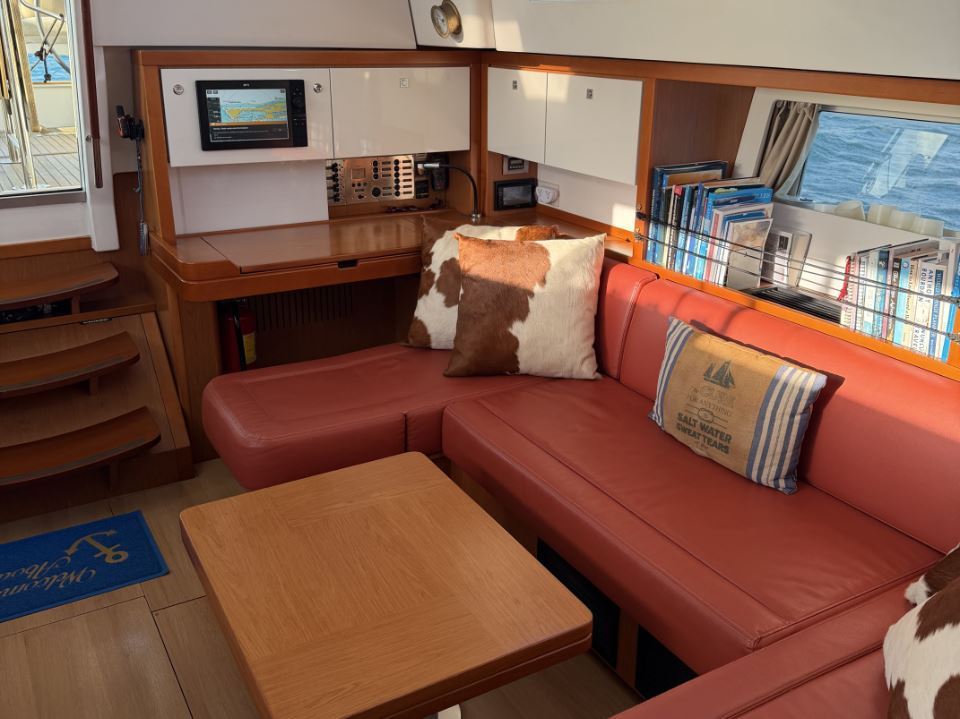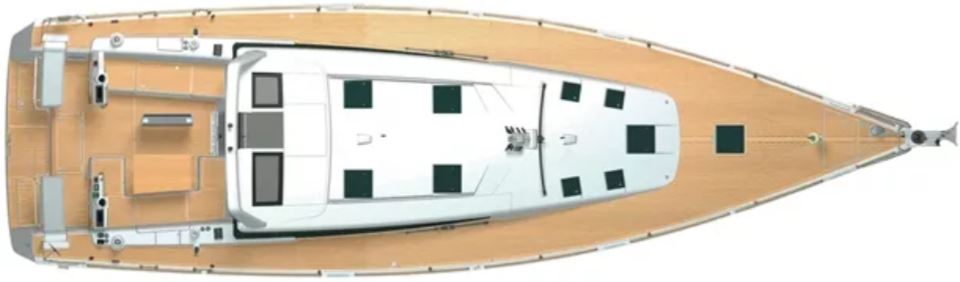 On deck, the Sense 55 features a huge aft cockpit with twin wheels, excellent visibility, and a large seating/dining area that easily converts to a lounging sunbathing space. Twin rudders and a beamy, powerful hull deliver control and comfort under sail, while the efficient fractional rig and modern sail plan make passagemaking fast and manageable for a short-handed crew.