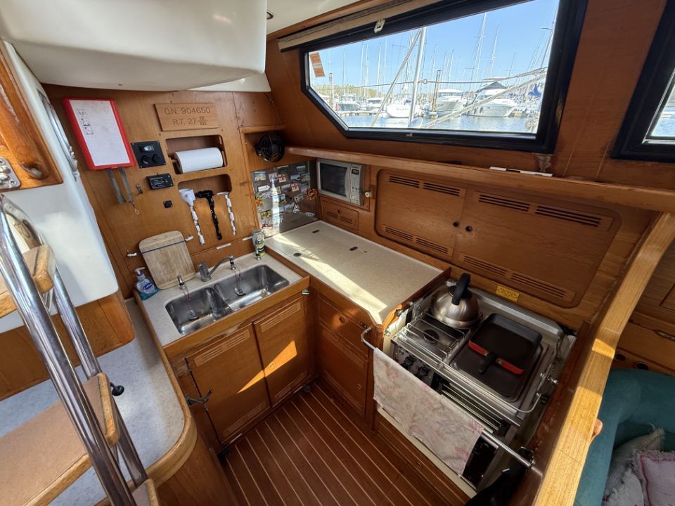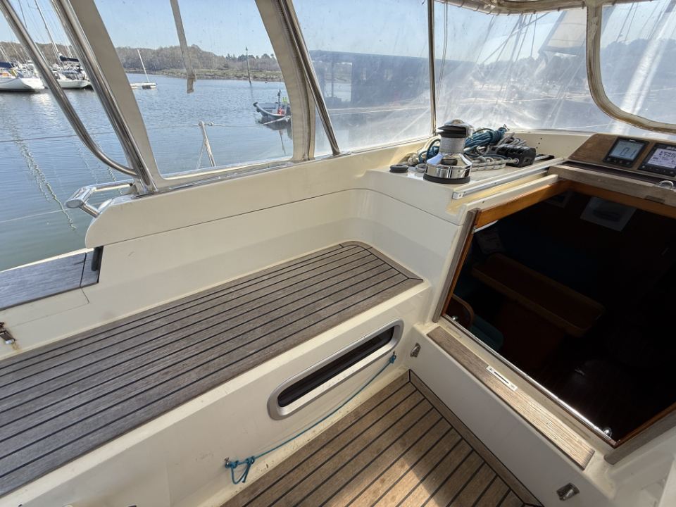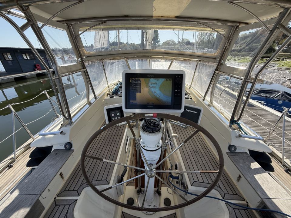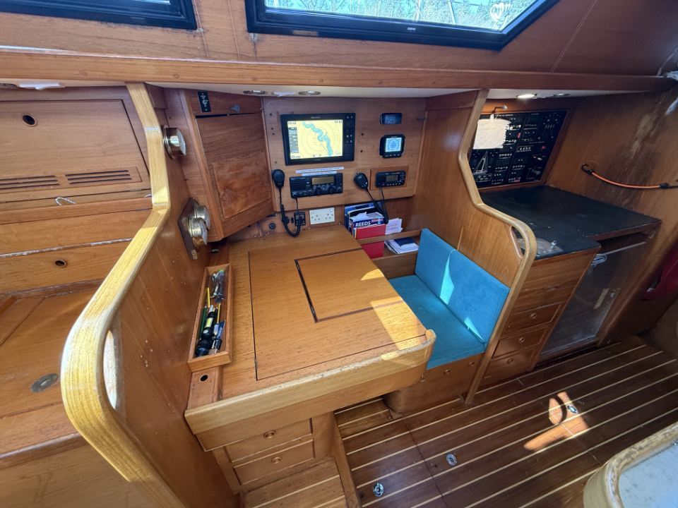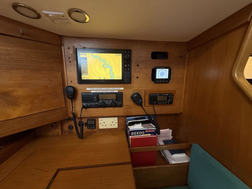 With a large, comfortable enclosed cockpit, up-to-date hybrid touch Raymarine chart plotter and autopilot. Below, a generous aft owner’s cabin with en-suite head and shower provides real comfort on longer voyages. The galley offers ample workspace while keeping users safe and secure in rougher conditions. The large saloon table provides comfortable, sociable seating for everyone aboard, and with vast storage to starboard there is more than enough space for provisions and belongings on extended passages. A dedicated chart table and navigator’s station sits a step down aft of the saloon, offering a dedicated spot for passage planning or simply a useful workspace when alongside.