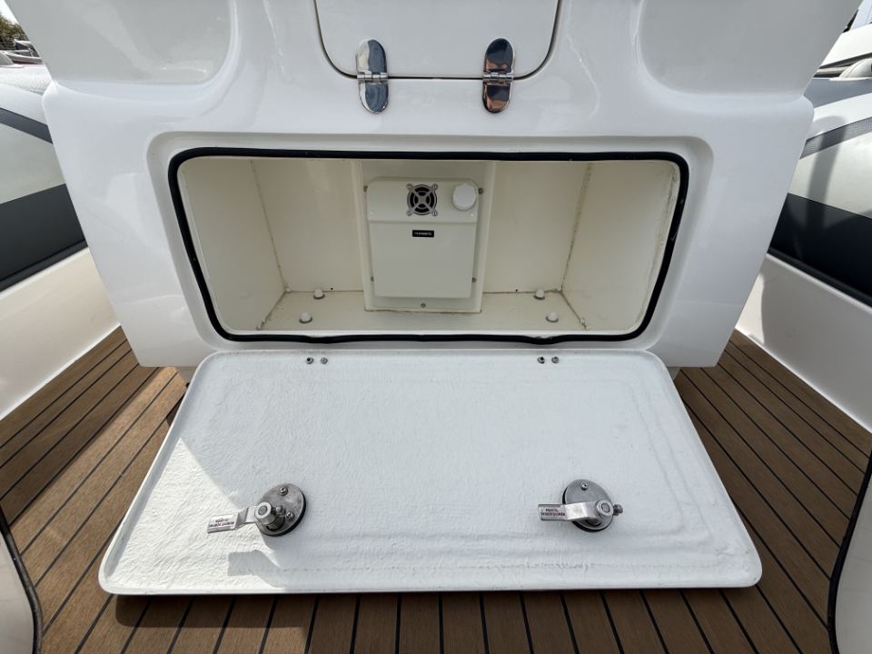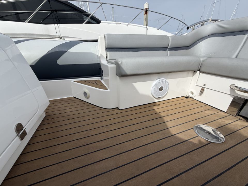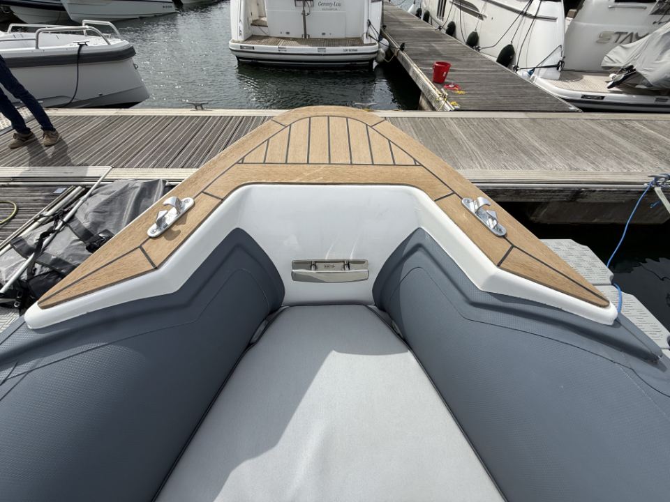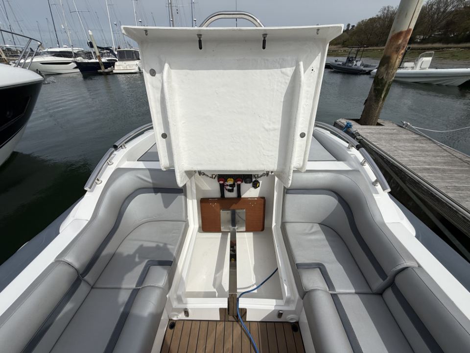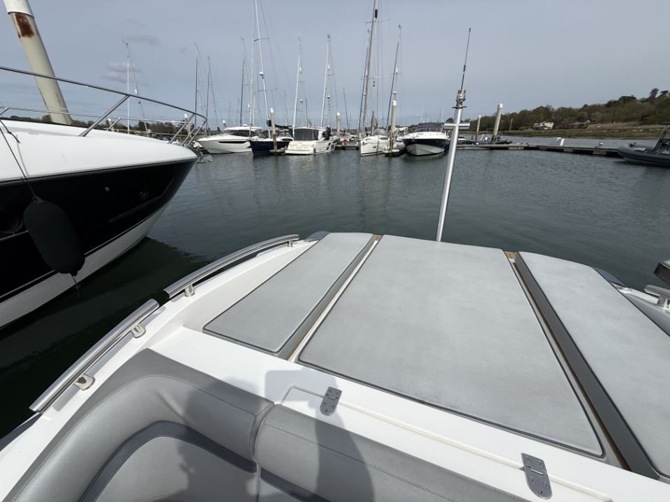 Her deep-V hull delivers a confident, composed ride with excellent directional stability, while the twin chine design helps channel spray downwards, improving forward drive and keeping passengers noticeably drier than conventional hull forms. Deck space is well resolved, with seating for six aft around a folding table, additional forward seating, and a fully fitted day head.