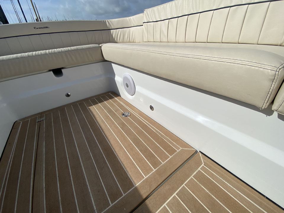 Modern details like the angular kink at the aft end of the stainless steel windscreen frame, the double arrowhead mouldings in the foredeck and the bespoke Comitti-branded cleats add an unexpected twist and prevent it from being too much of a retro pastiche.”
