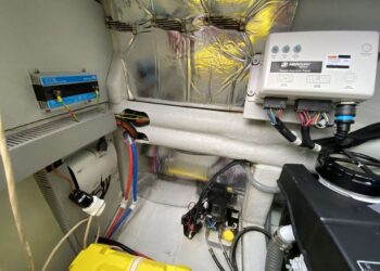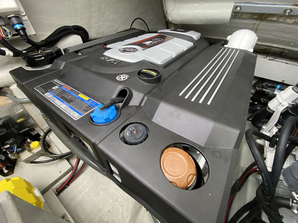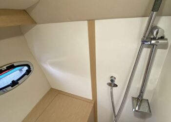Thus, the Comitti Breva 35 not only looks exceptional but also performs exceptionally. Fitted with a pair of light, punchy Mercury 3.0-litre turbo-diesels, she is sprightly and settles into a comfortable cruise in the 20s. Using Mercury’s dynamic SmartCraft and VesselView technology, she can be driven from the Joystick (which independently also controls and vectors the sterndrive thrust, for one-handed intuitive docking) and features the super-useful Skyhook function, which virtually anchors her in the water. The engine installation is also lovely, with a powered hatch aft (under the sprawling after sunpads), offering immediate access to belts, filters, batteries, and pumps. The engines sit on a substantial composite bearer web to spread loading points and anchor the power train into the hull structure. Access to other important areas such as tanks and chargers is also handled competently, with a central lazarette and cockpit lockers providing superb storage and equipment access.