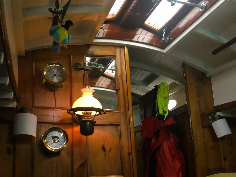 On deck, the deep cockpit and sturdy dodger provide a cosy and well-protected sailing experience in all conditions. The canvas-covered main deck and Dynel (fiberglass) covered house top maintain the yacht’s traditional appearance, while providing durability. Bronze deck hardware and the iconic butterfly skylight over the saloon further enhance her classic appeal.