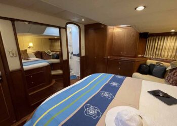 LIARA has a big engine/generator room, which also houses the watermaker, shaft seal, etc. and is directly accessible from the aft corridor. The charming and spacious owners’ cabin with the integrated head and shower is separated from the saloon and the guest cabins providing lots of privacy.