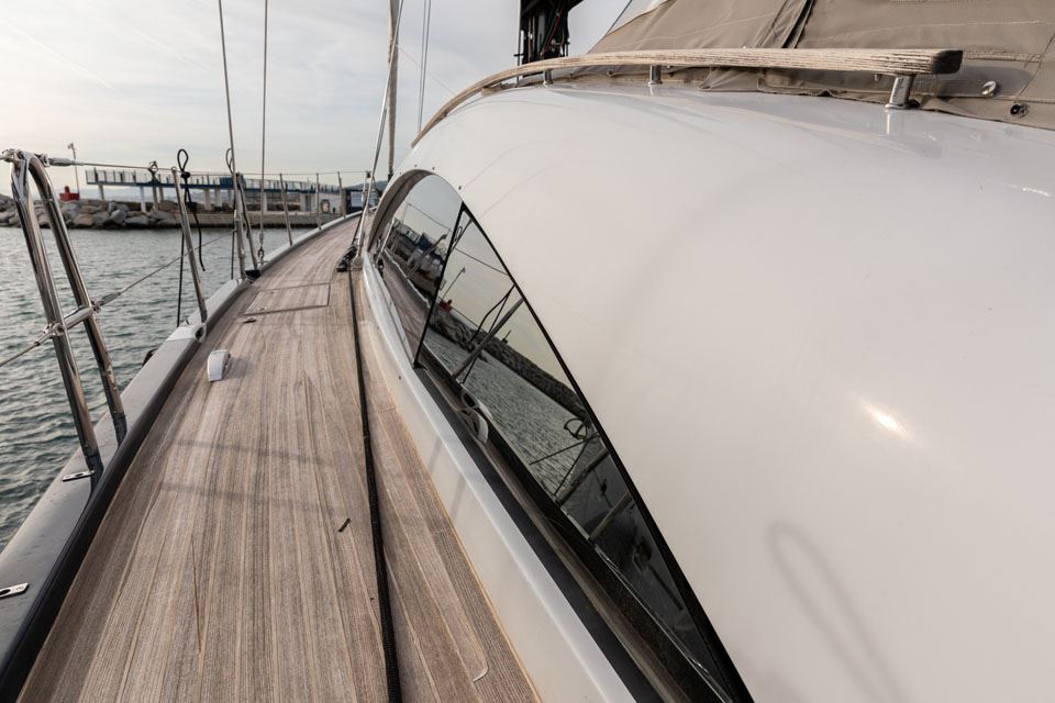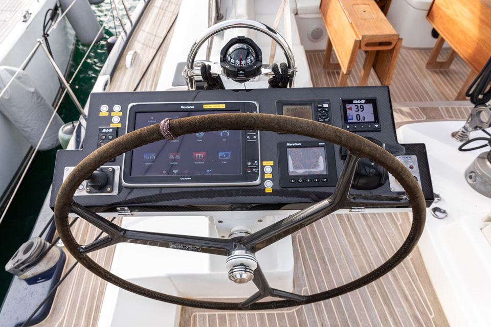 She was built in composite E-glass/foam core with carbon reinforcement in structural areas. Safety and reliability are kept in mind with properly sized equipment and systems like Southern Spars carbon rig, Lewmar deck hardware, North Sails and twin generators, among others.