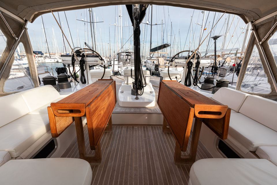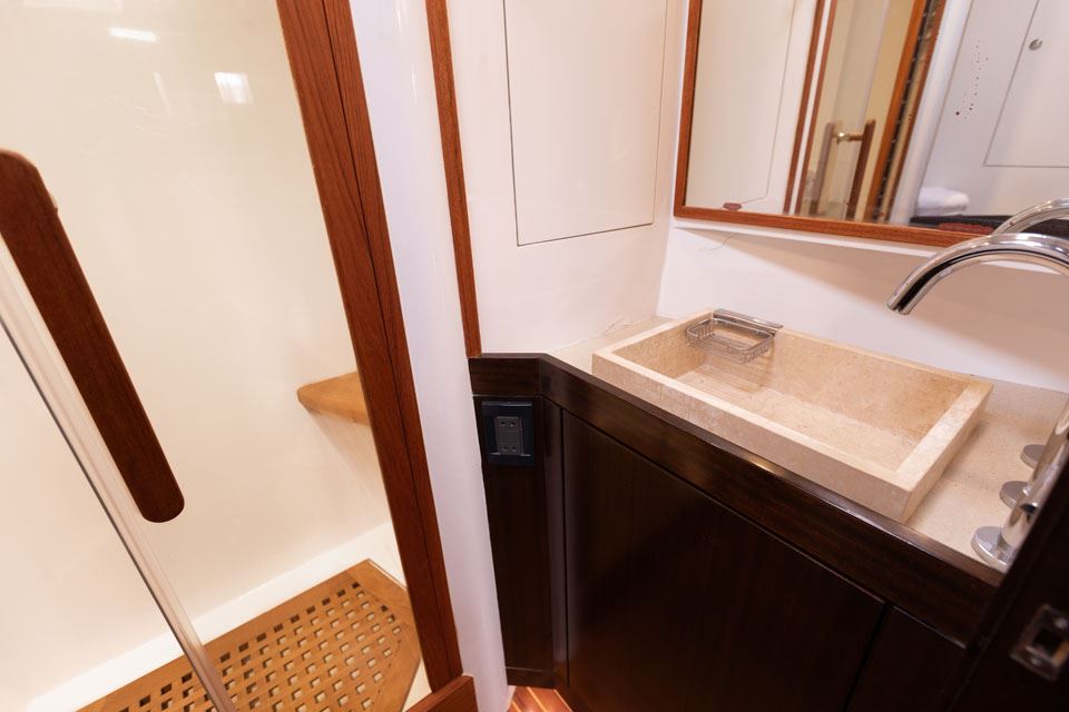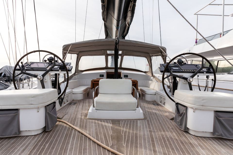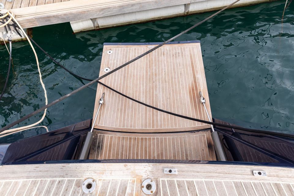 KAHUNA’s exterior teak-covered deck spaces are uncluttered and clean. There is a cockpit area with twin steering positions, seating and two tables, perfect for guests to hang out and spend time alfresco. She has a second entrance on the aft deck to the cabins aft/navigation station, a large lazarette aft for storage and a hydraulically opening stern bathing platform.