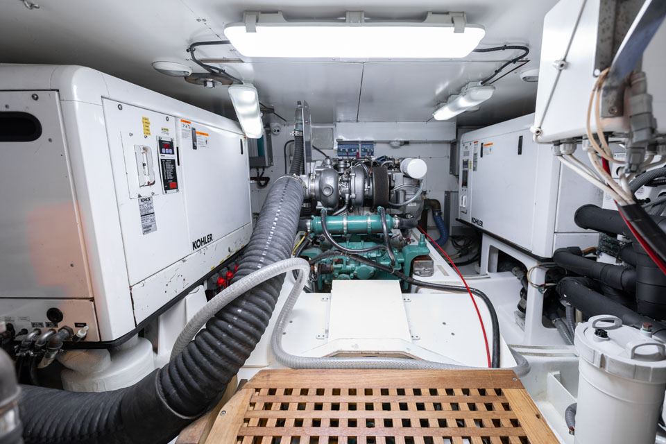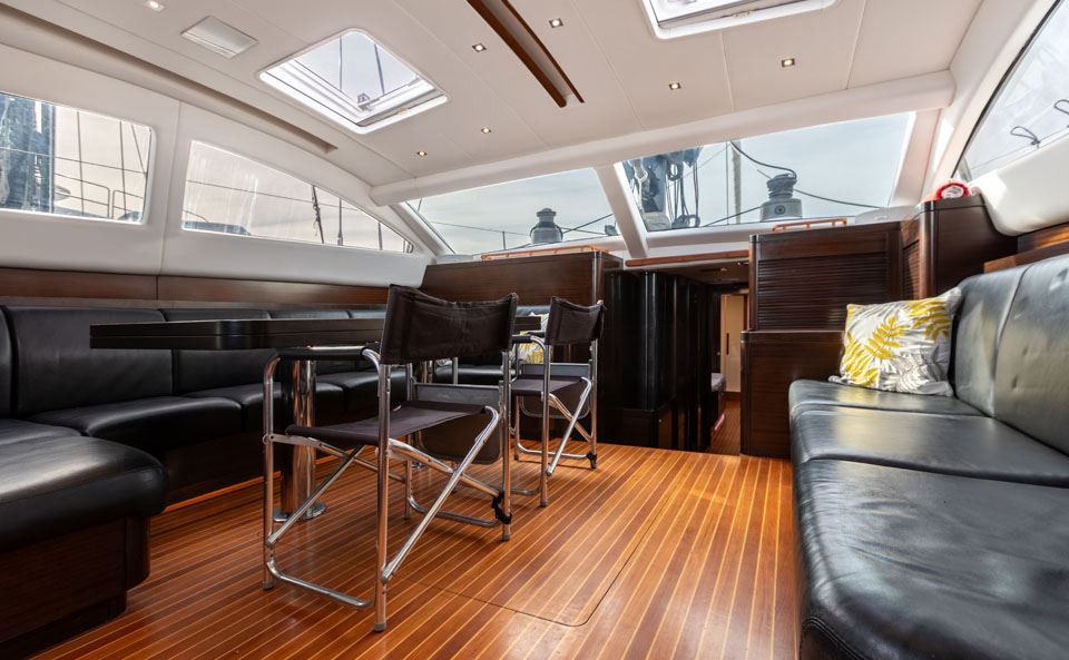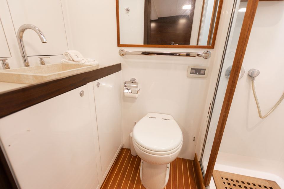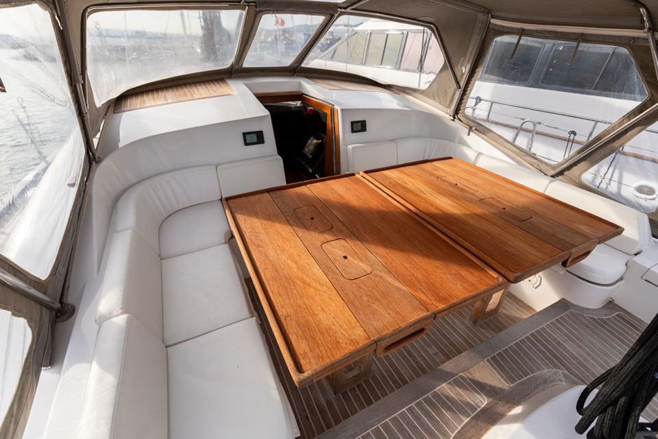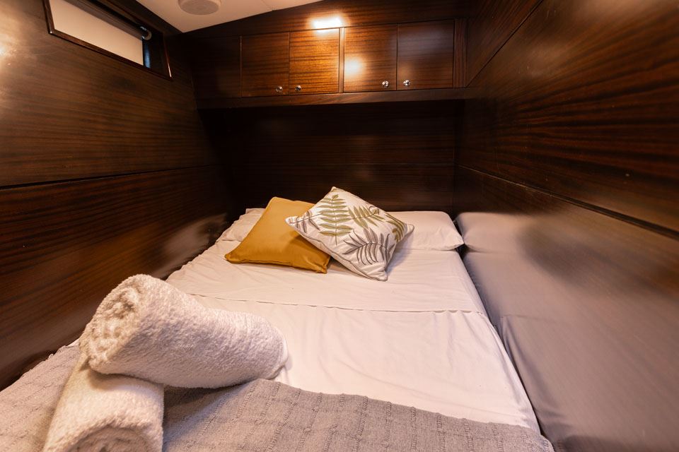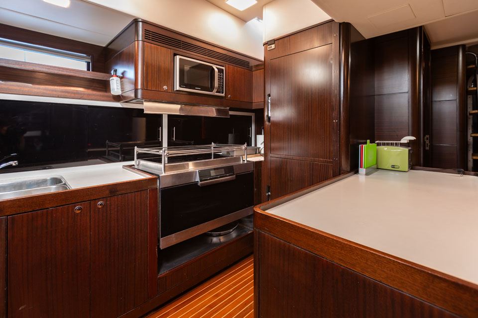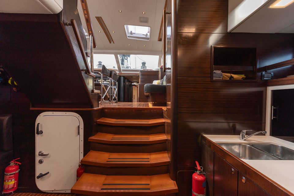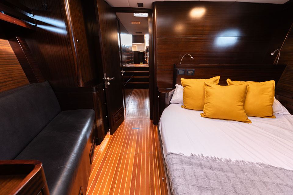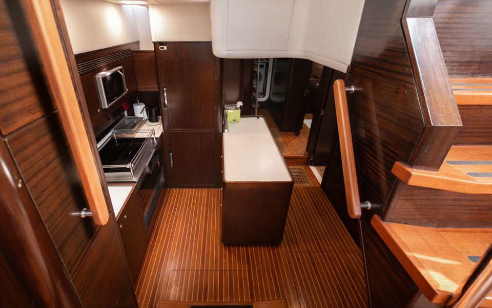 Her interior is finished with Mahogany wood throughout and comfortable furnishings. The raised deck saloon midships offers a large seating area to port and a settee to starboard to relax and socialize, with lots of natural light entering from the surrounding windows. Aft is a navigation station and a large U-shaped galley.