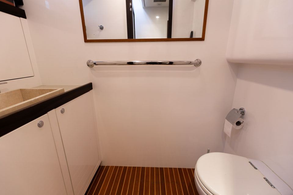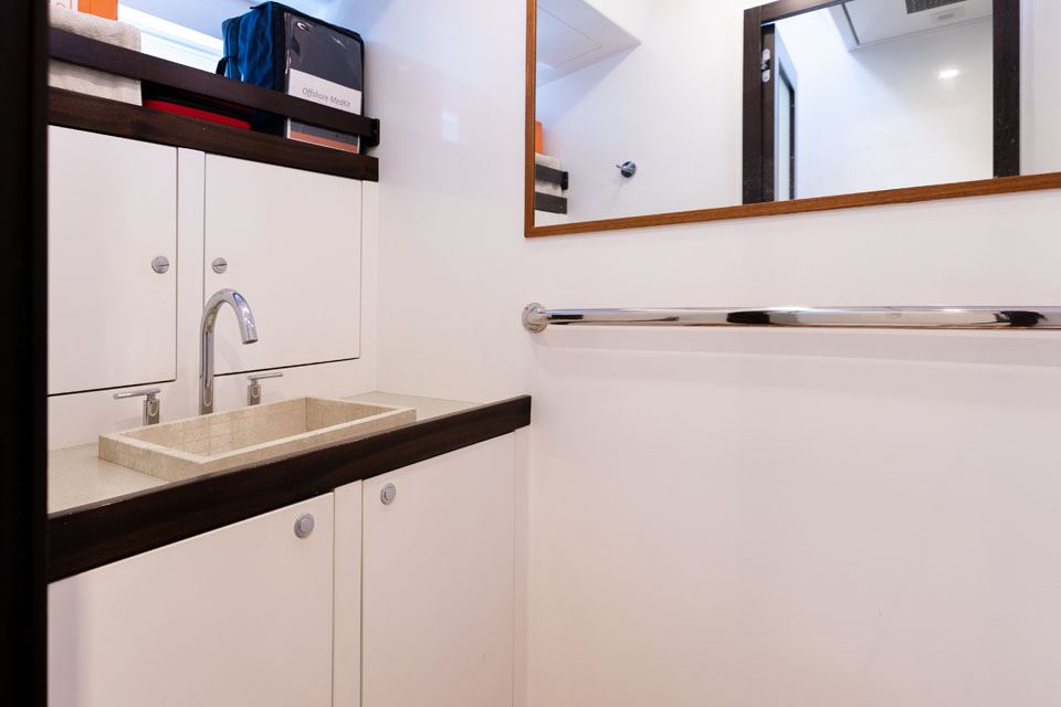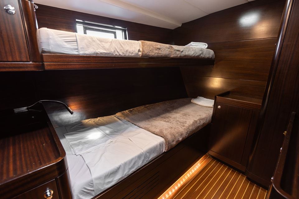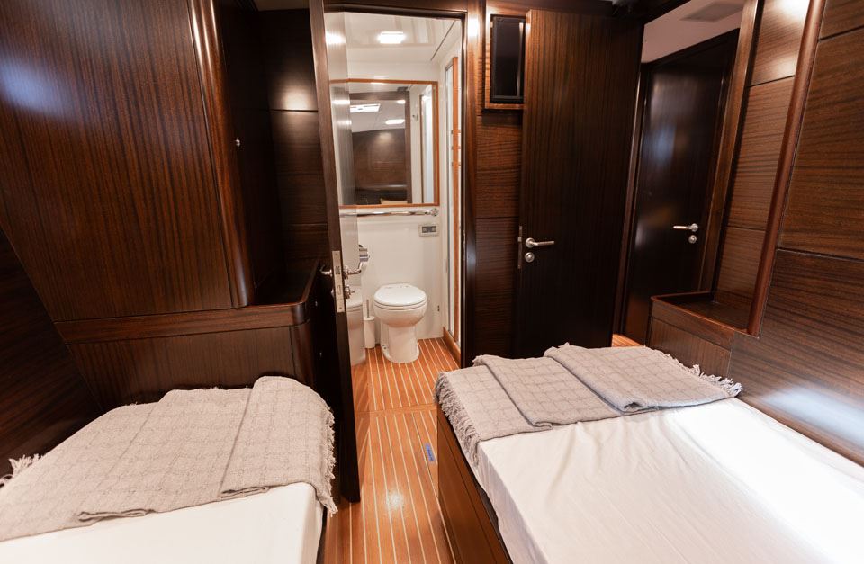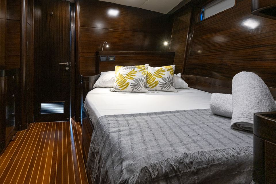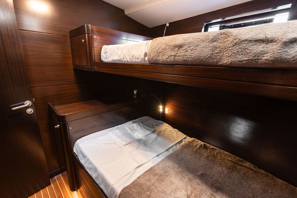 KAHUNA can accommodate eight guests and two crew in five well-appointed cabins. Her accommodation configuration includes an owner’s stateroom forward with a double bed and en-suite bathroom, a guest cabin to portside with two single berths and en-suite bathroom, a guest cabin to starboard side with a double bed and two aft cabins with upper/lower beds, both sharing one large bathroom aft, which also includes a separate area for wet clothes.