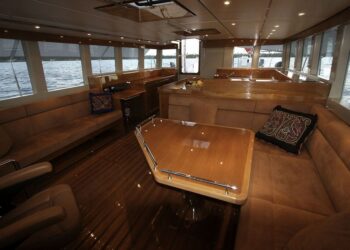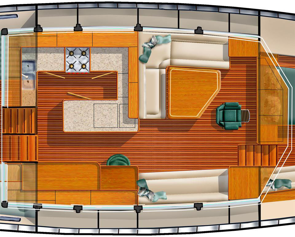 She is easily managed by two people, yet she has comfortable accommodation for a total of six. Her layout provides for the signature ‘Great Room’ deck saloon with a large galley, comfortable seating and helm station. With her large deck saloon windows of tempered glass, there is 360-degree vision. Forward is a large owners’ stateroom and aft two comfortable guest cabins with access into the engine room aft. This is spacious, well laid out and very easy to work in.