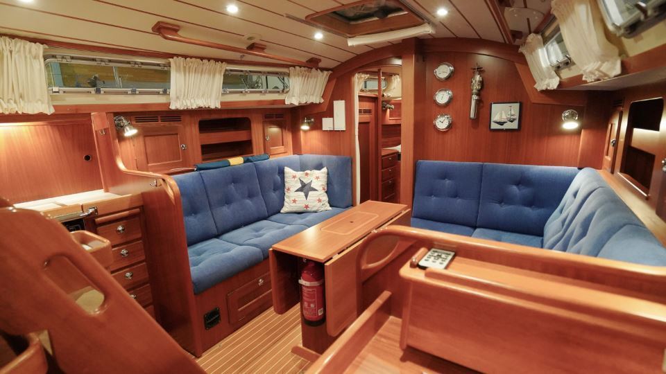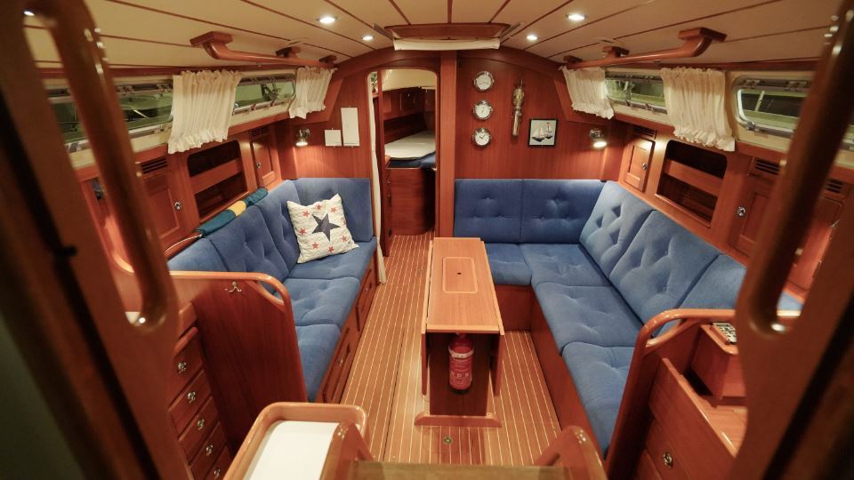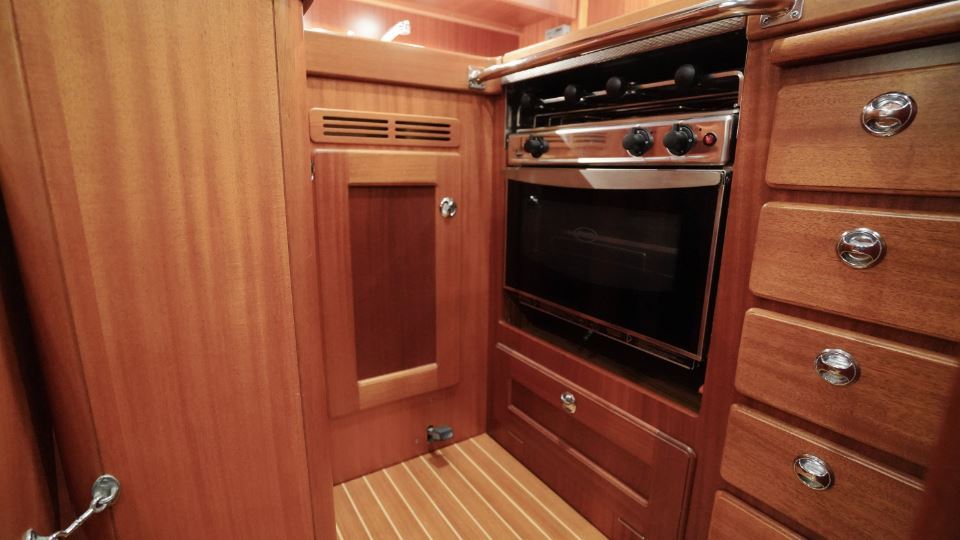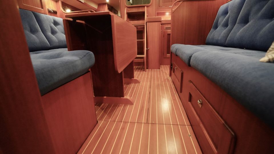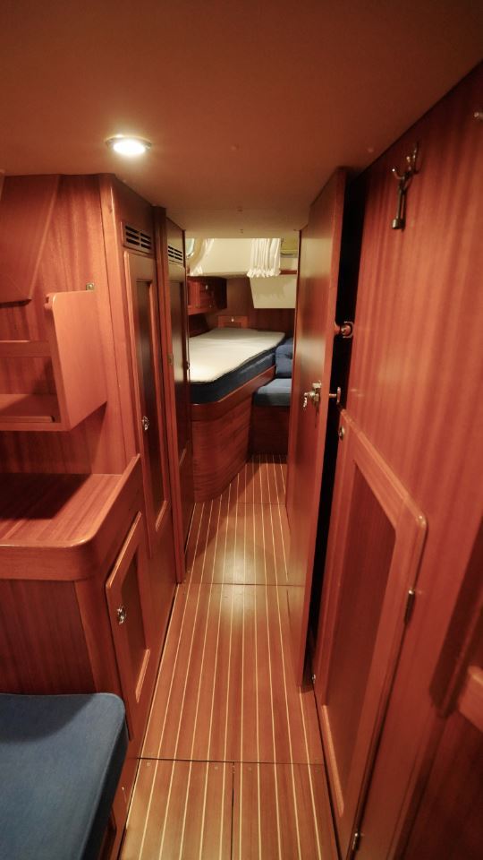 Below deck, the layout provides a bright and spacious aft cabin with a double and a single berth, that is clearly separated from the forward part of the yacht. Directly at the entrance stair you will find a sea going galley and a navigation table. The saloon offers two sofas, a stable dining table with foldable sides and plenty of storage. In front of the mast bulkhead is the head with shower and the forward cabin with a v-berth. The large engine room offers ample space and even allows for the installation of a generator. The interior woodwork reflects the craftsmanship of experienced yacht builders and contributes to a warm, high-quality finish throughout.