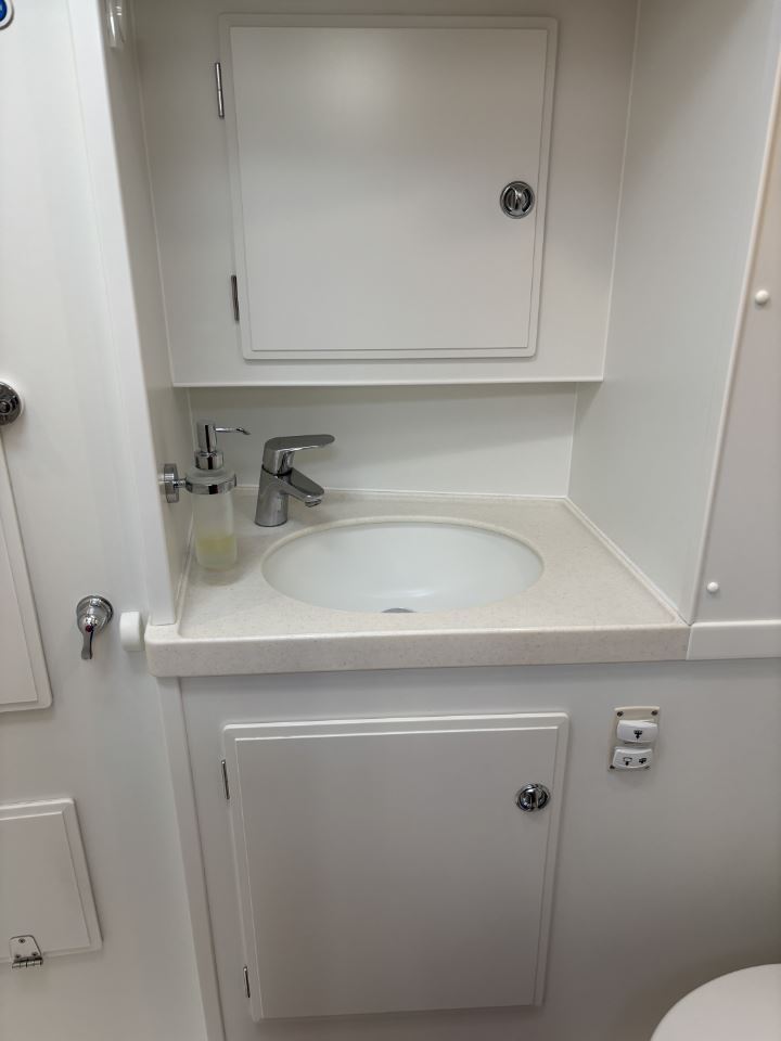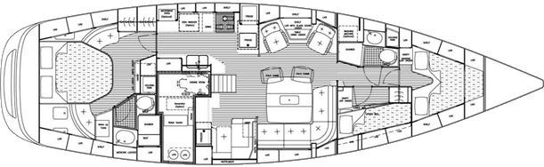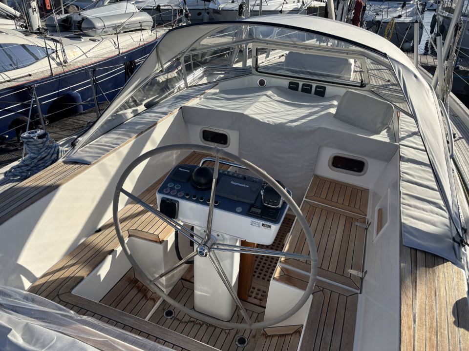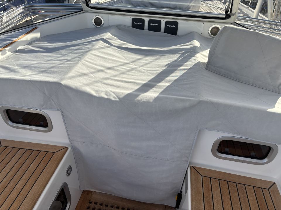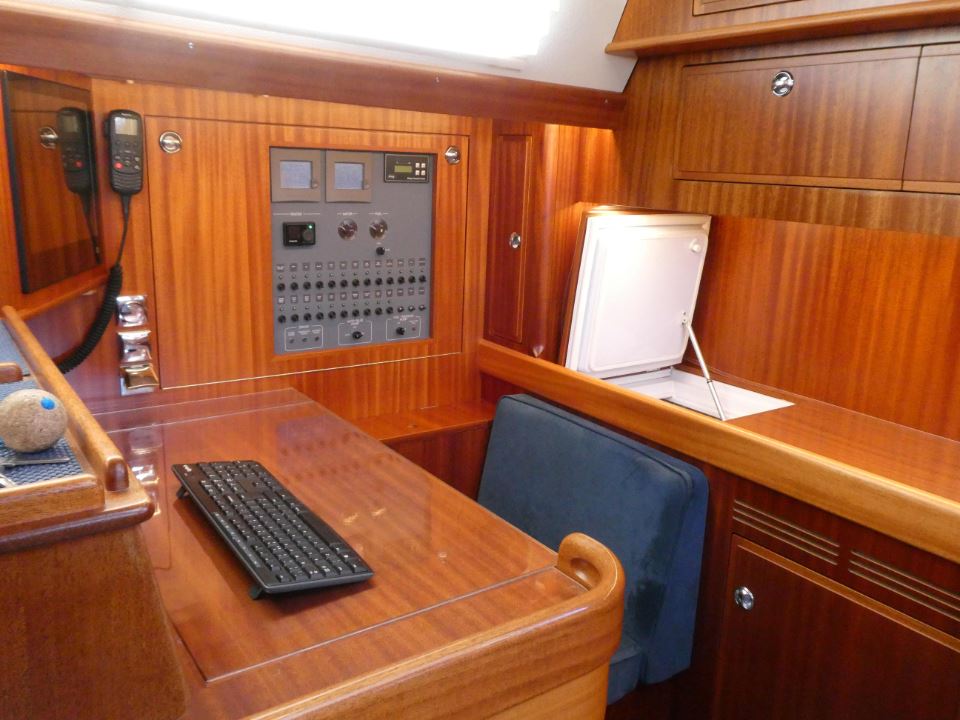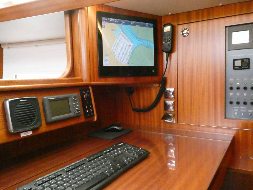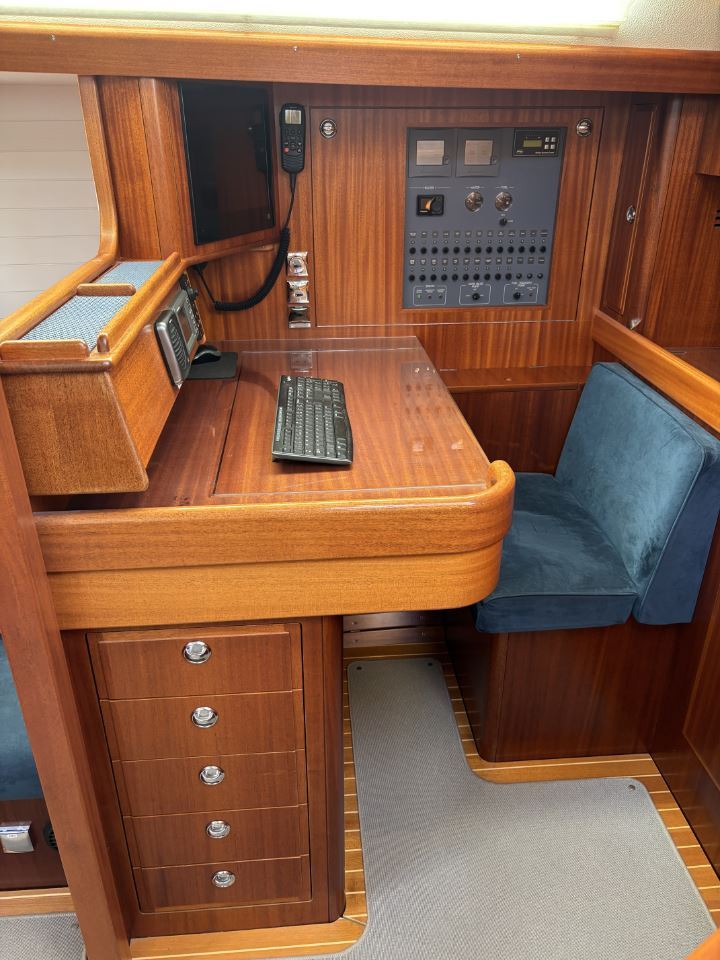 On deck, ELK is an easily managed yacht with spacious decks and a large cockpit. Her rig is fully hydraulic and operated entirely from the safety of the cockpit. She is equipped with two cockpit plotters, radar, and a comprehensive suite of Raymarine sailing instrumentation.