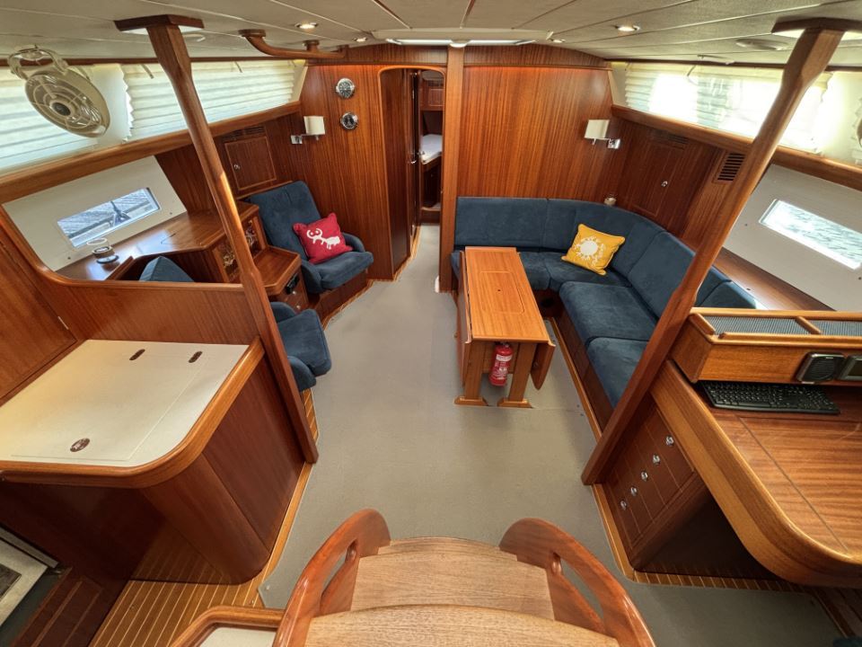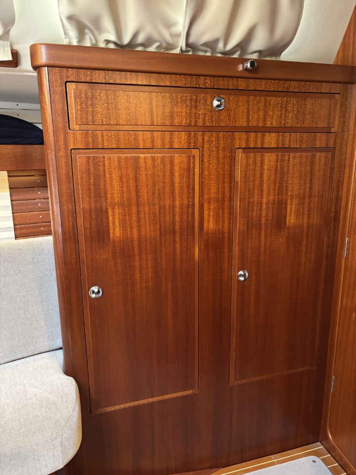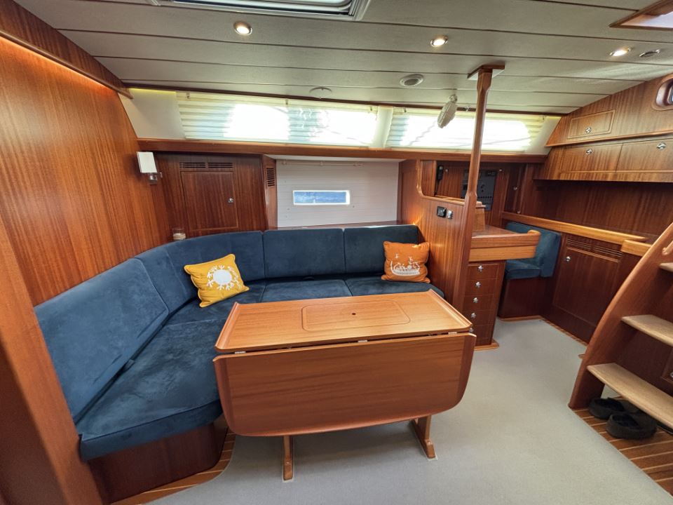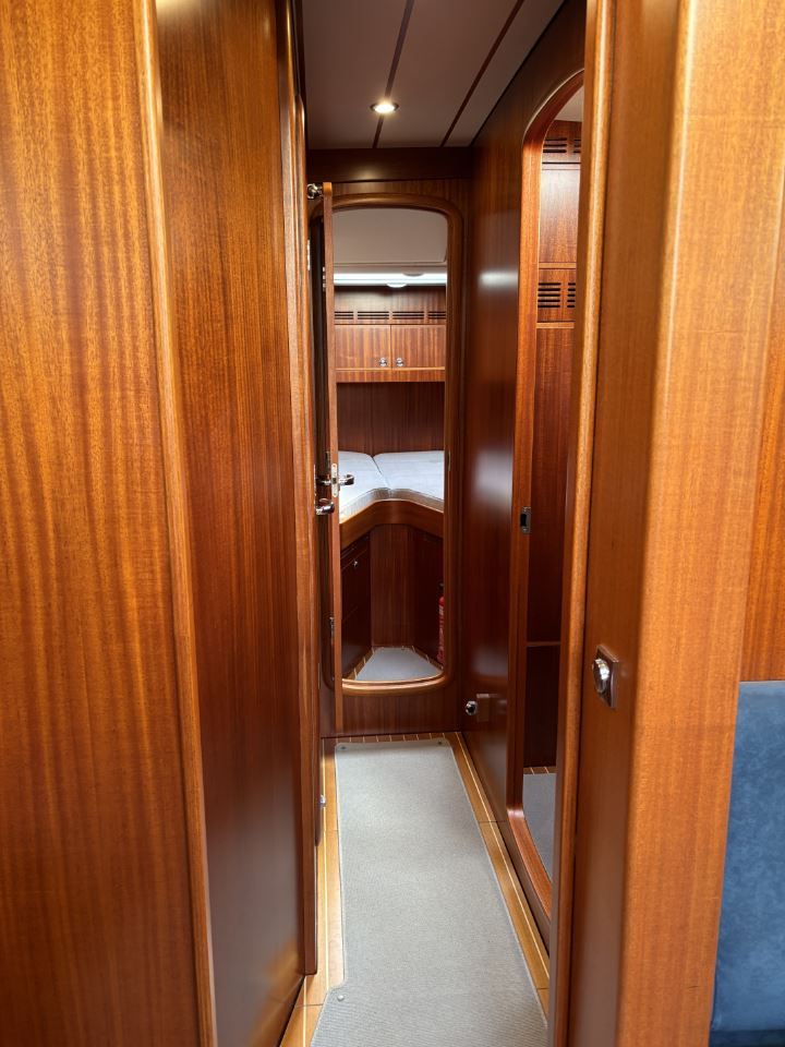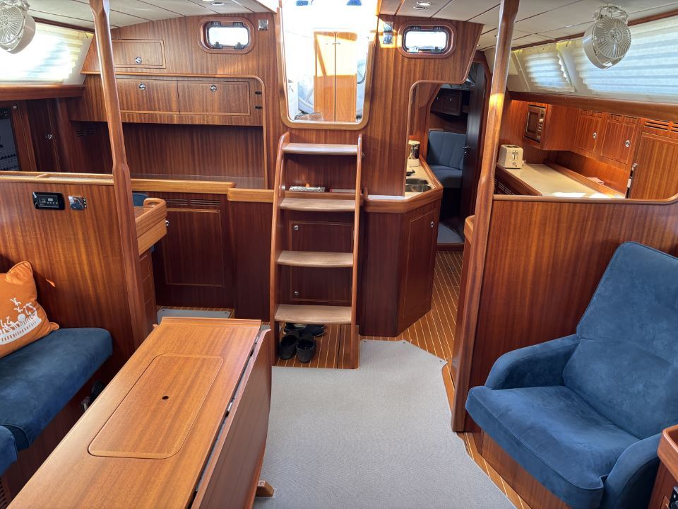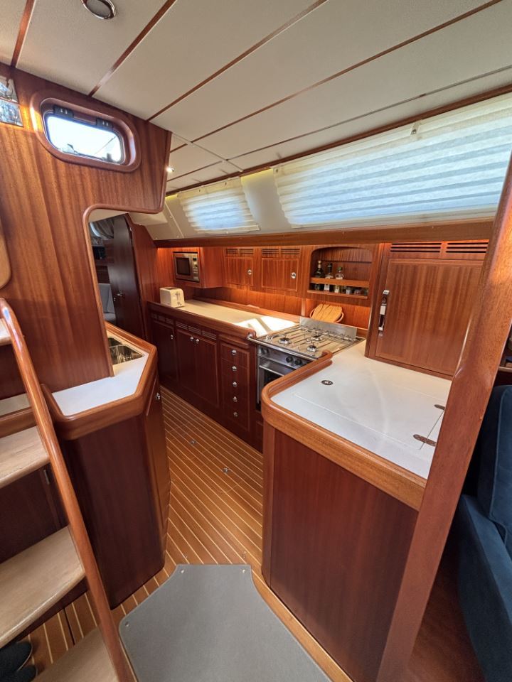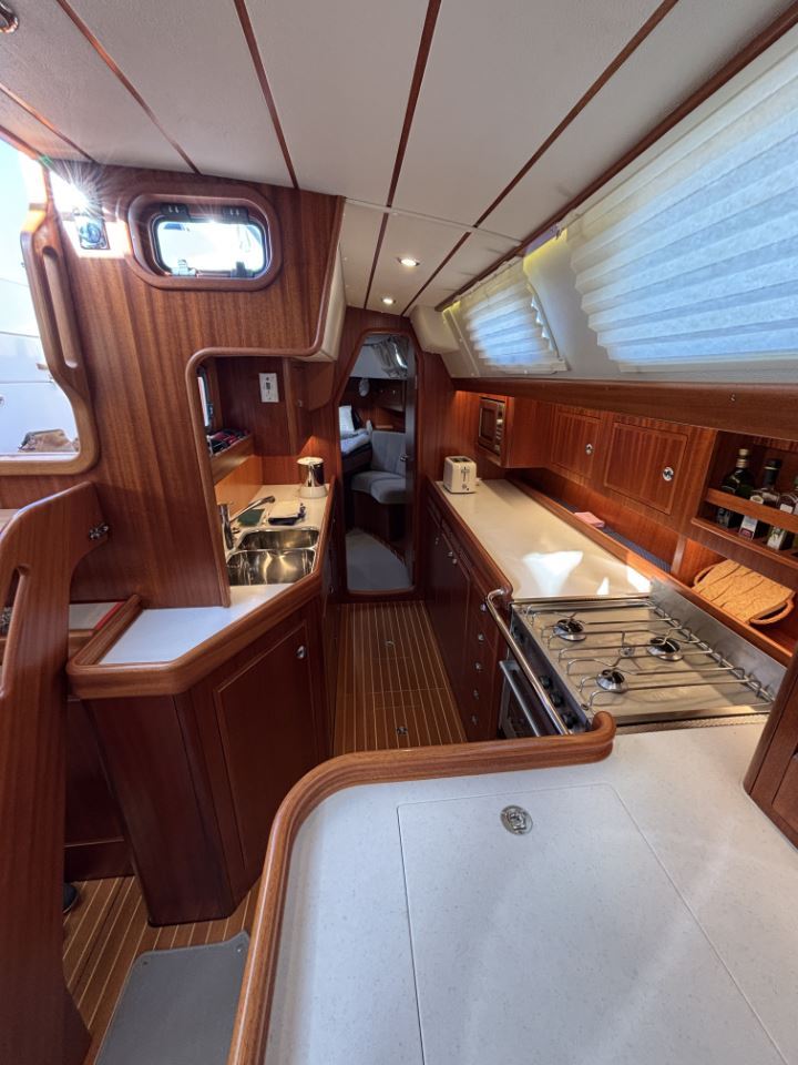 Below deck, she is classic Hallberg-Rassy: satin-varnished mahogany interior, teak-and-holly cabin sole, and fitted light-grey carpets complemented by mid-blue upholstery. She offers two double cabins and one twin cabin, a forward heads compartment with separate shower stall, and an ensuite in the owner’s aft cabin. The spacious, well-appointed linear galley runs aft.