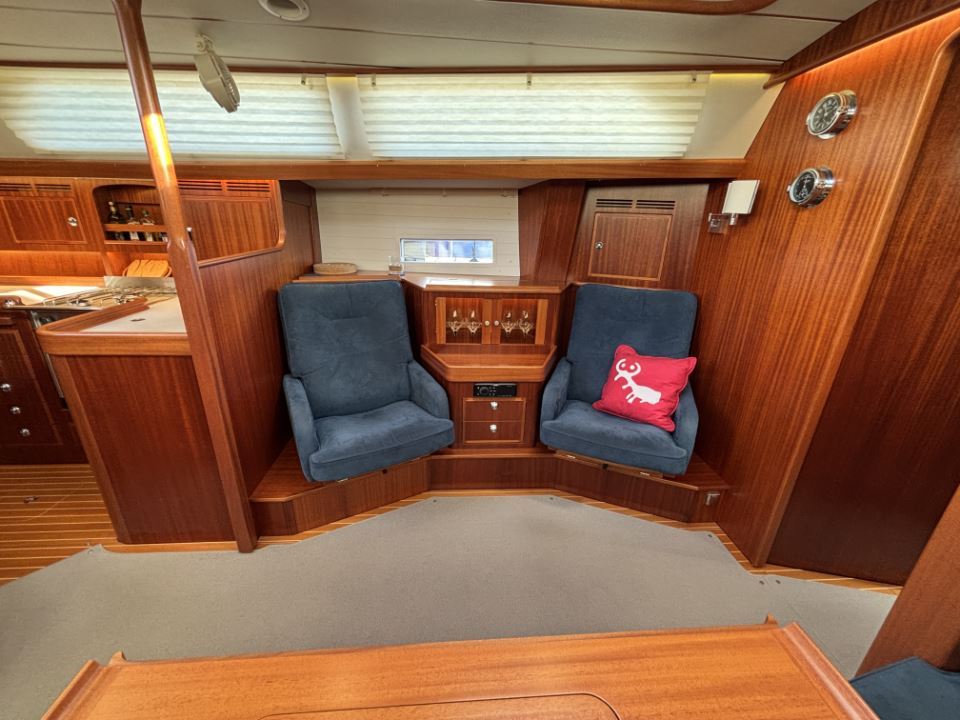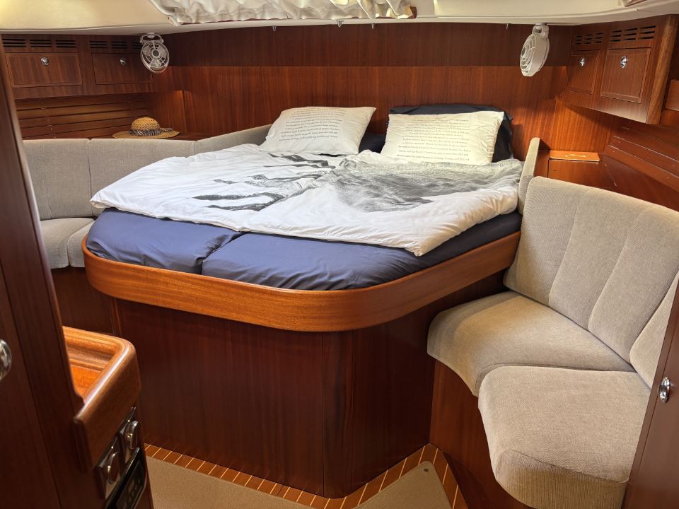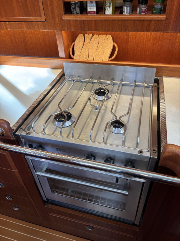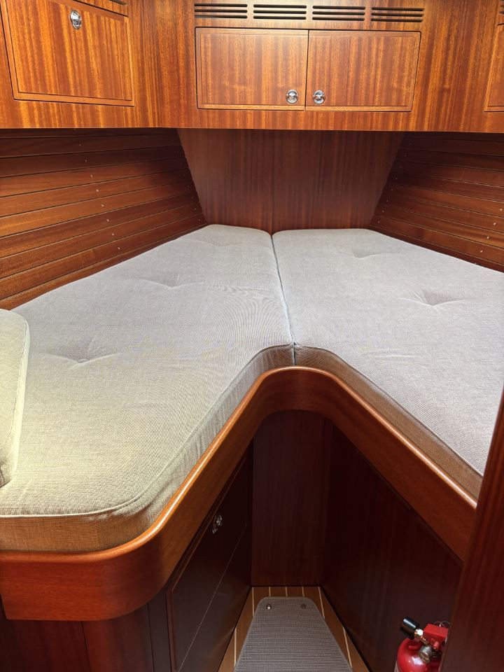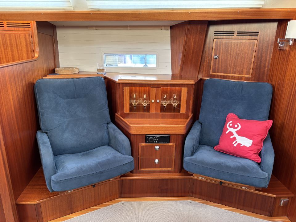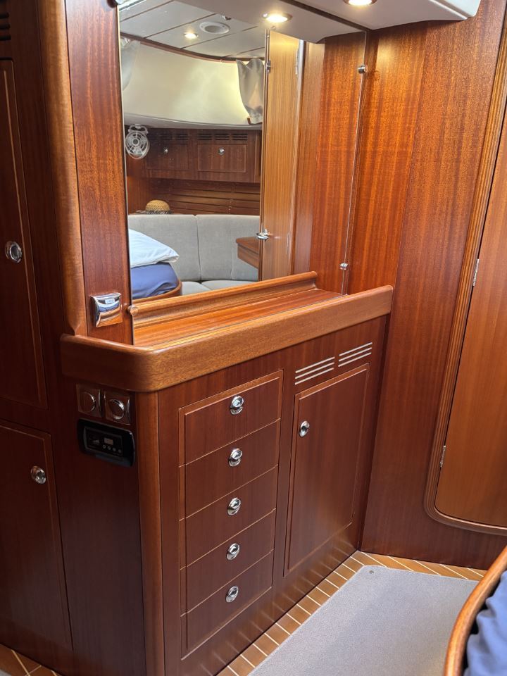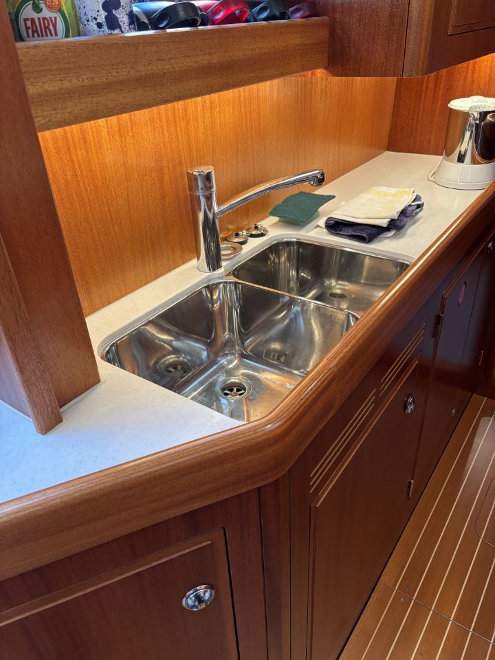 Below deck, she is classic Hallberg-Rassy: satin-varnished mahogany interior, teak-and-holly cabin sole, and fitted light-grey carpets complemented by mid-blue upholstery. She offers two double cabins and one twin cabin, a forward heads compartment with separate shower stall, and an ensuite in the owner’s aft cabin. The spacious, well-appointed linear galley runs aft.