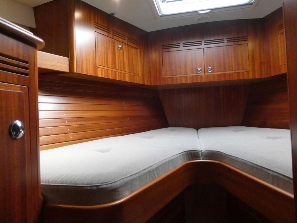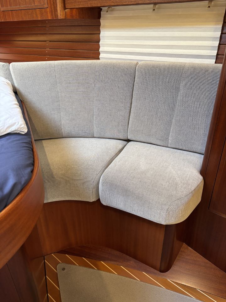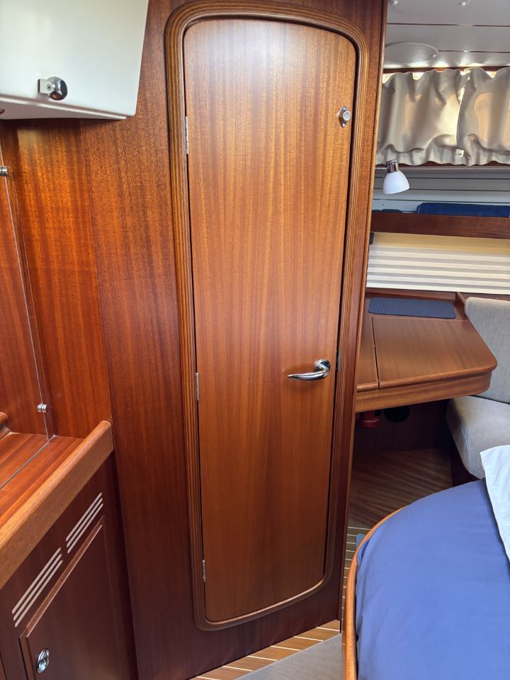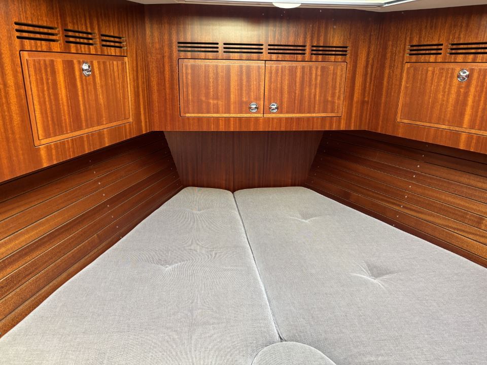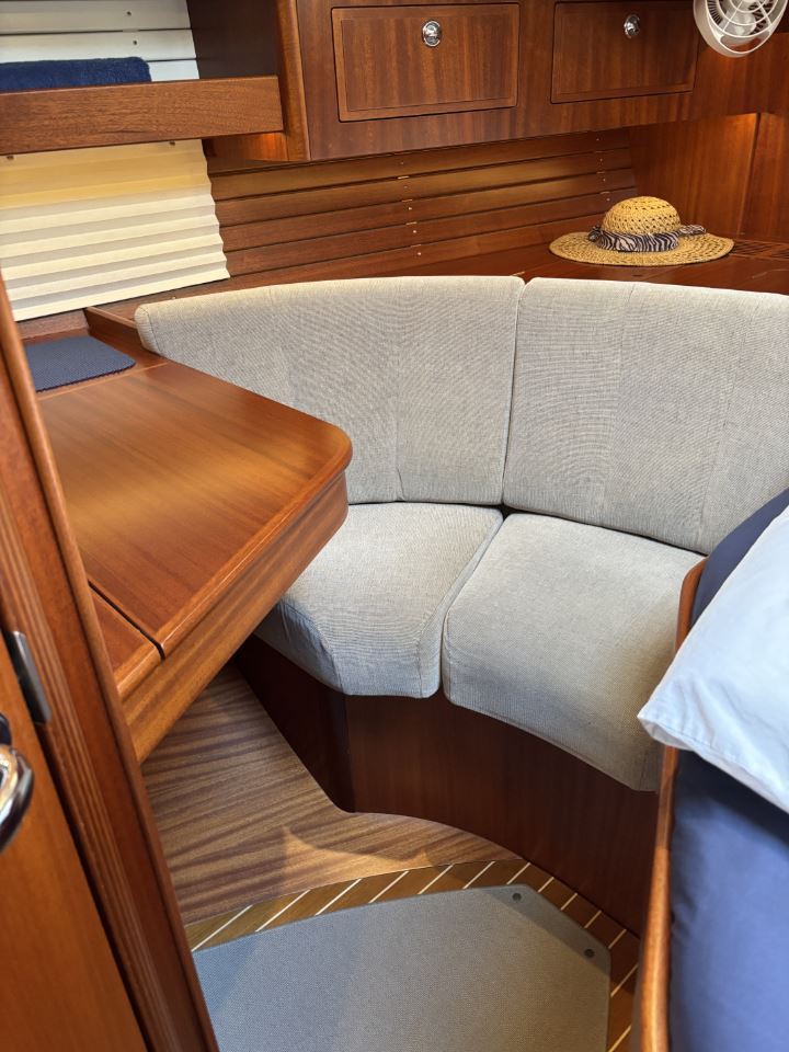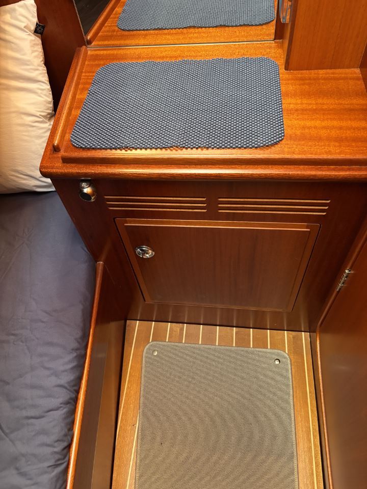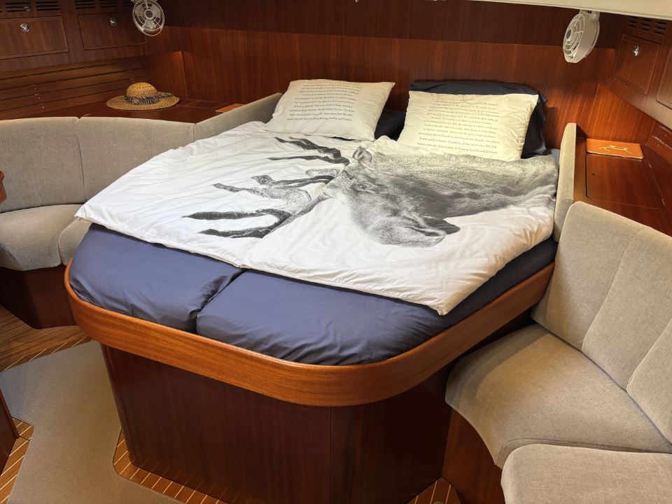 Below deck, she is classic Hallberg-Rassy: satin-varnished mahogany interior, teak-and-holly cabin sole, and fitted light-grey carpets complemented by mid-blue upholstery. She offers two double cabins and one twin cabin, a forward heads compartment with separate shower stall, and an ensuite in the owner’s aft cabin. The spacious, well-appointed linear galley runs aft.