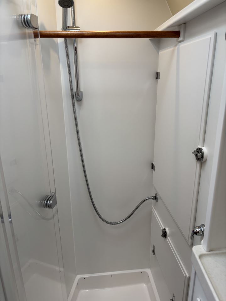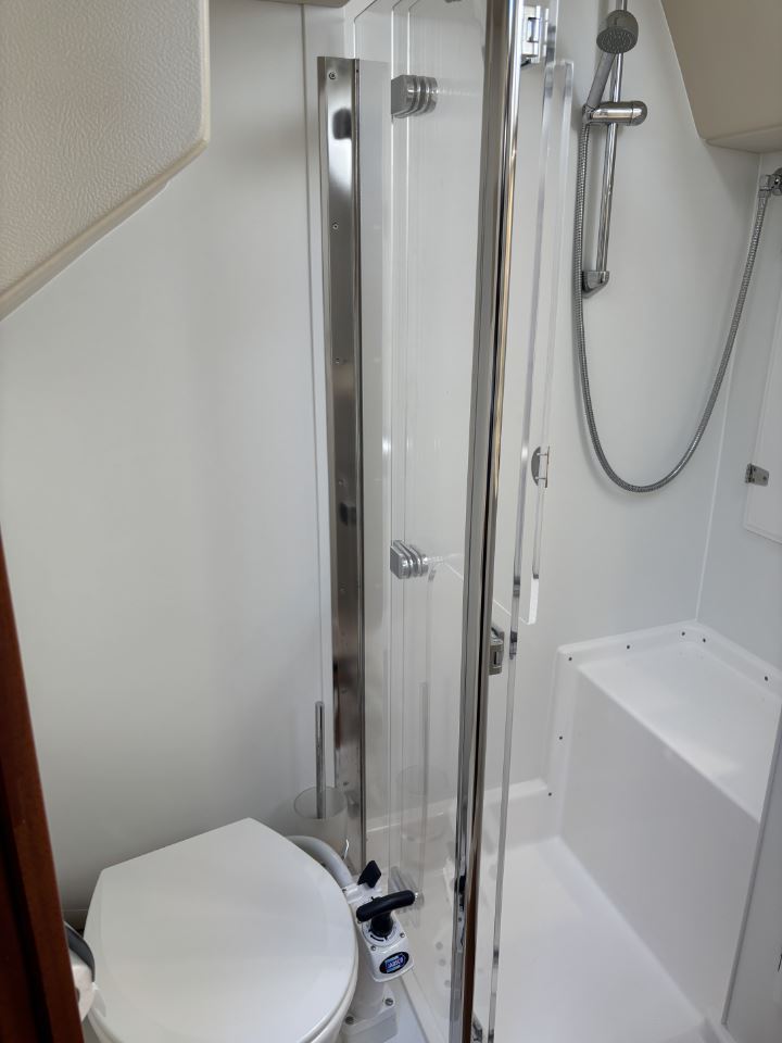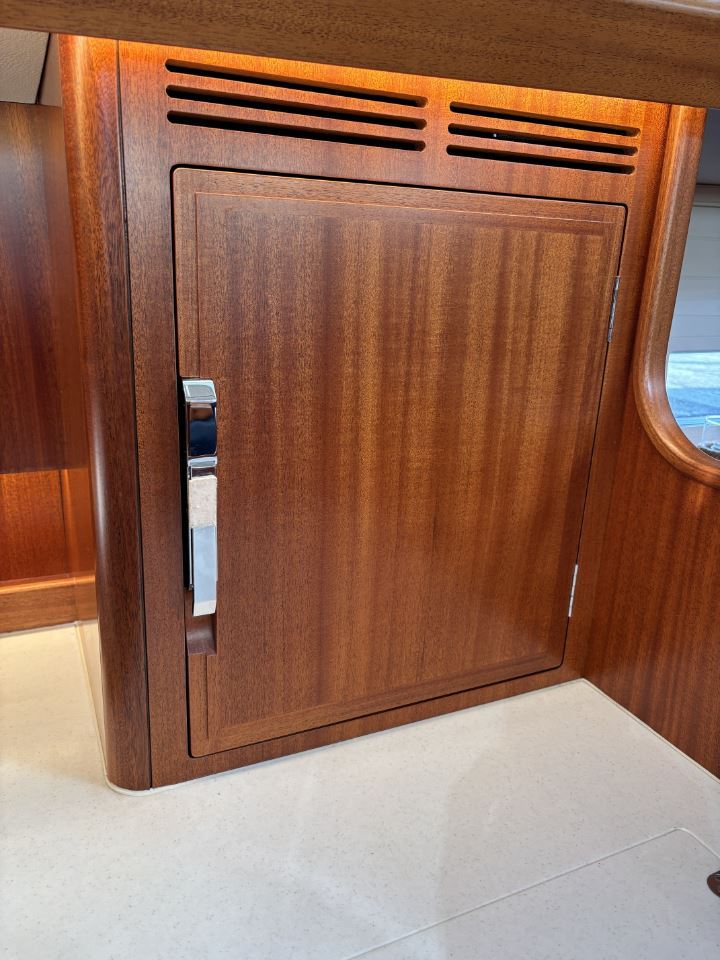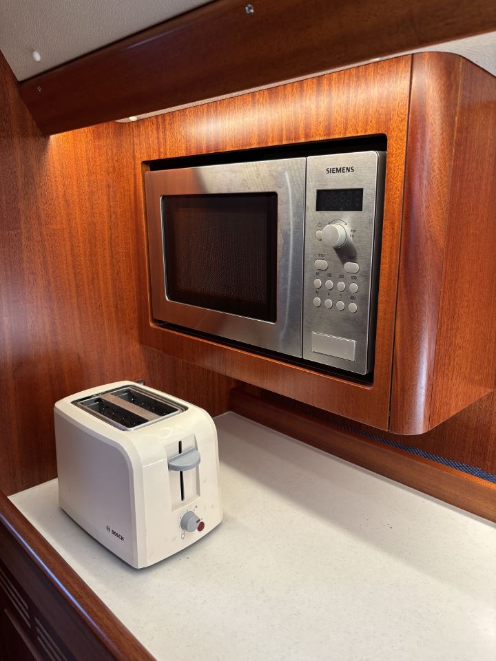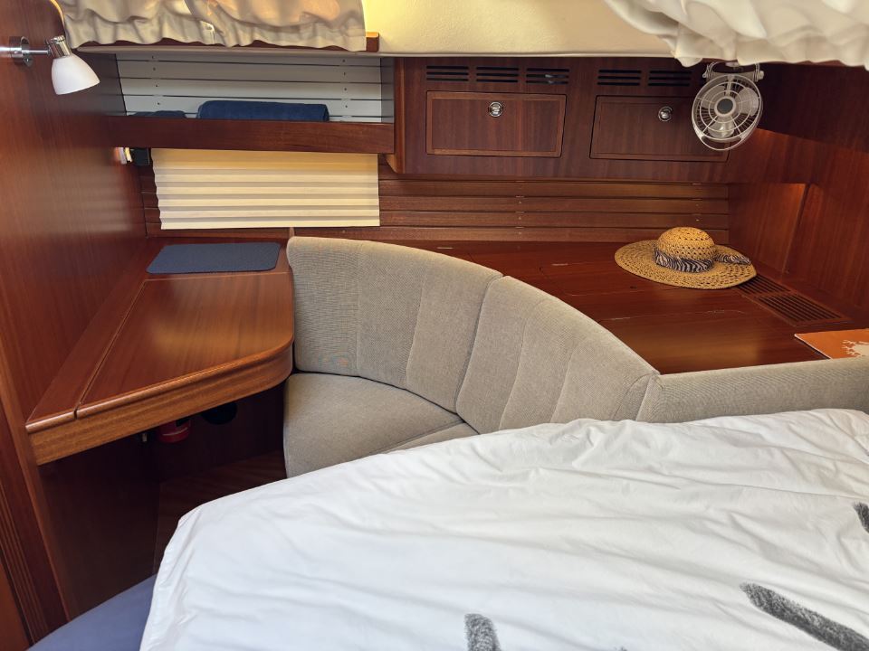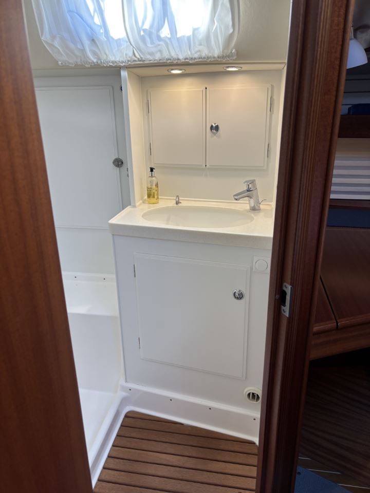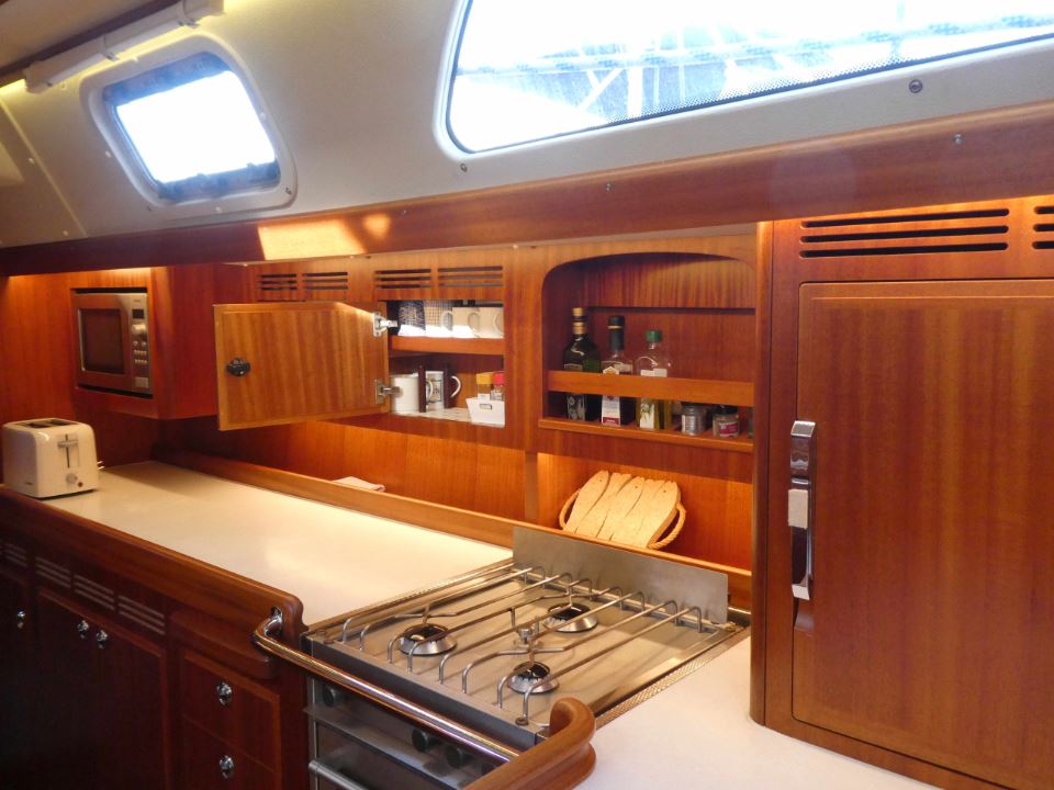 Below deck, she is classic Hallberg-Rassy: satin-varnished mahogany interior, teak-and-holly cabin sole, and fitted light-grey carpets complemented by mid-blue upholstery. She offers two double cabins and one twin cabin, a forward heads compartment with separate shower stall, and an ensuite in the owner’s aft cabin. The spacious, well-appointed linear galley runs aft.