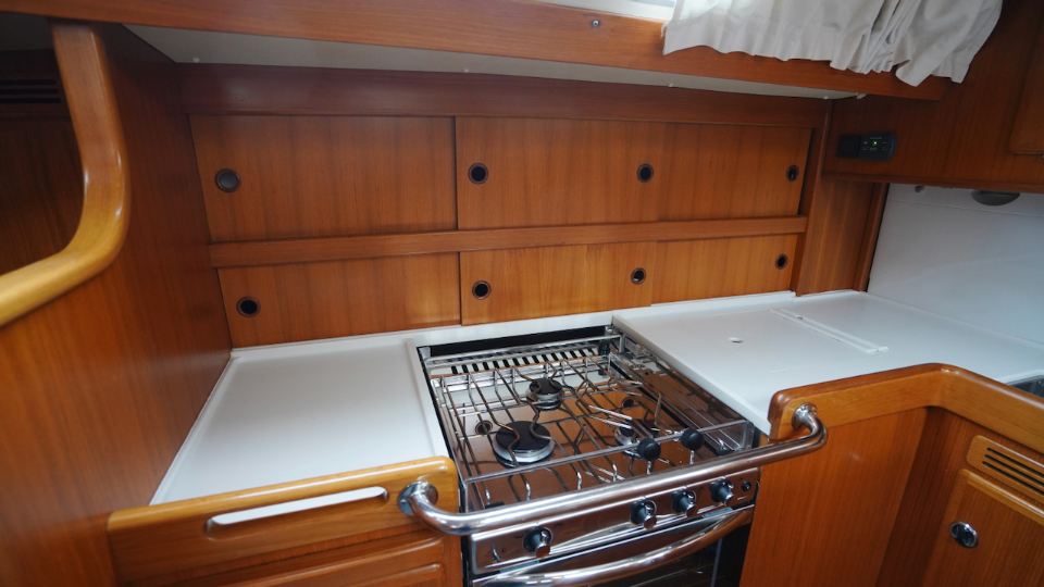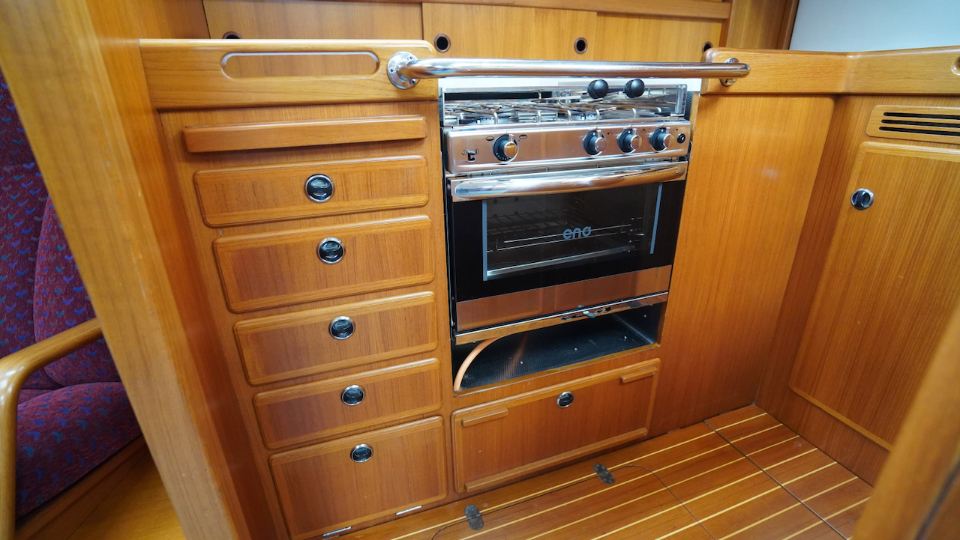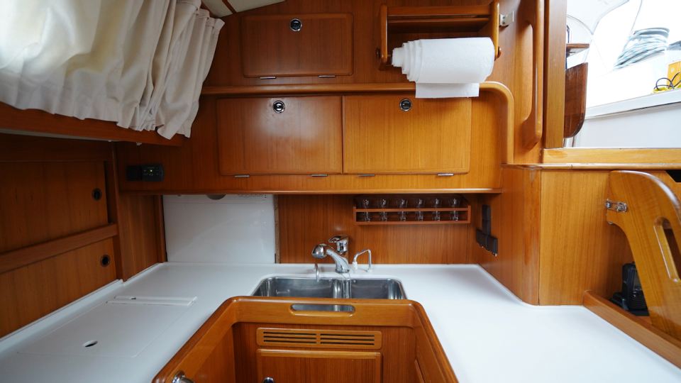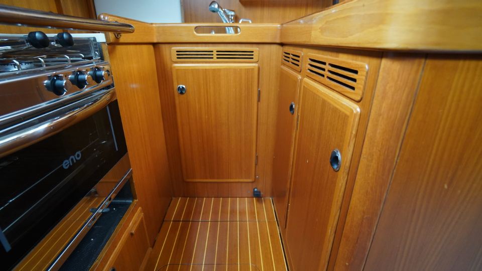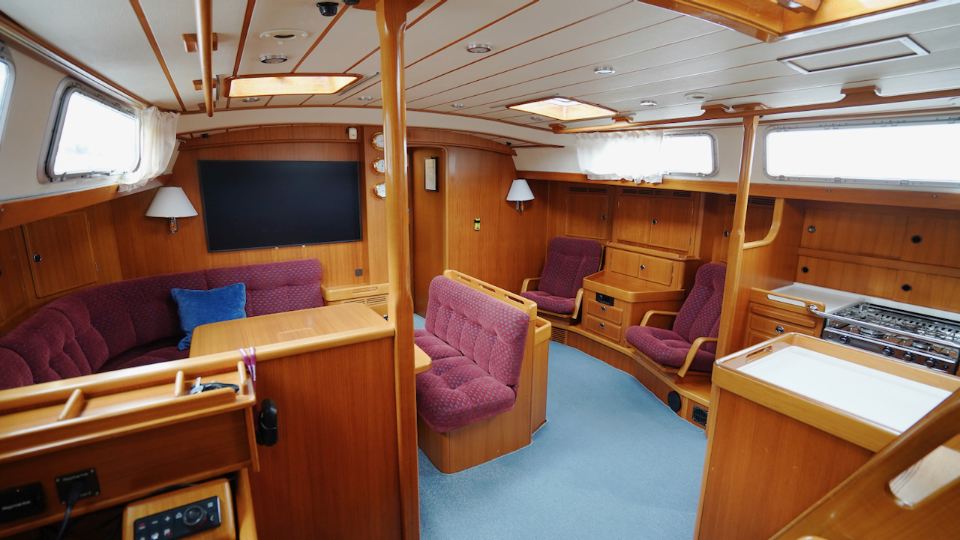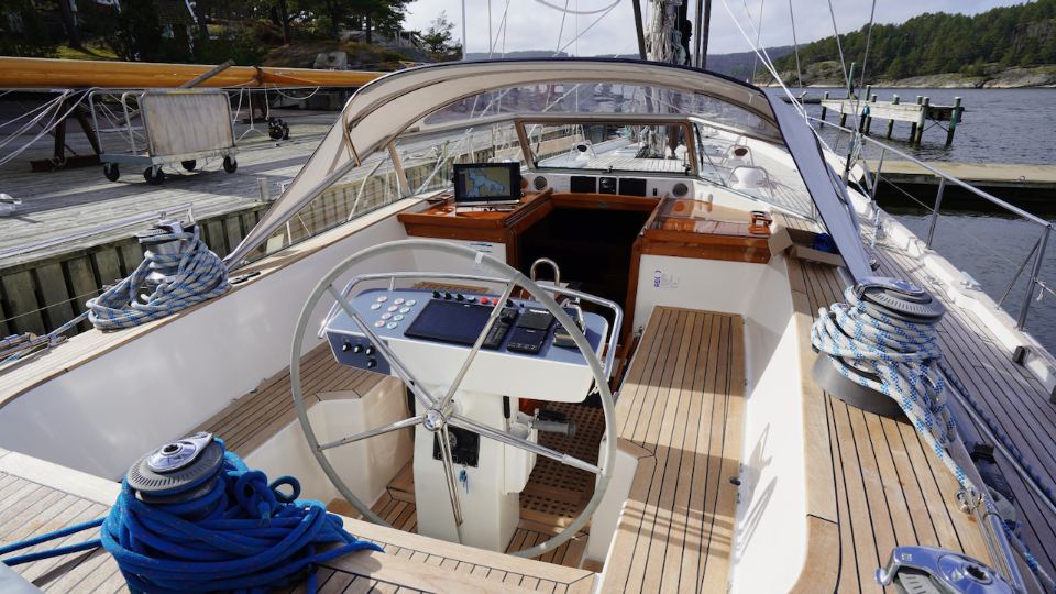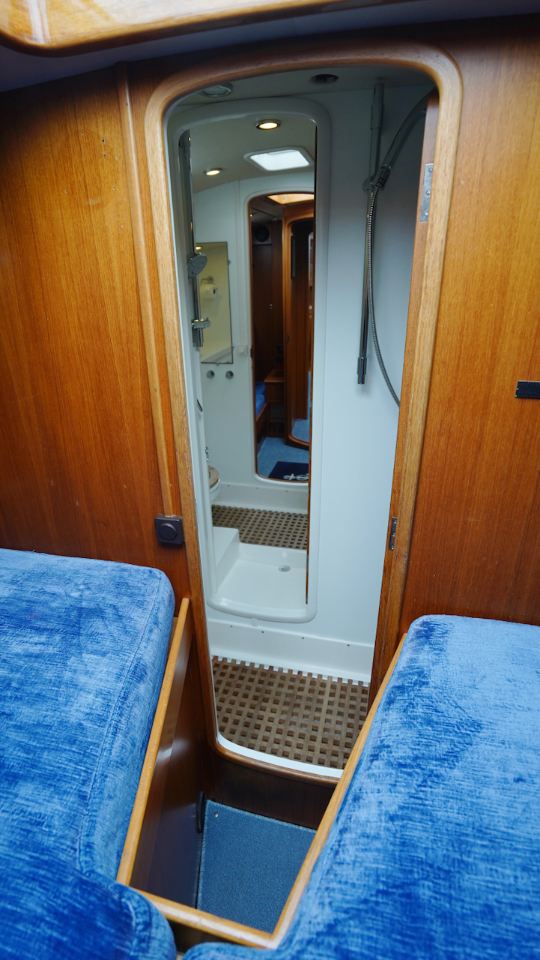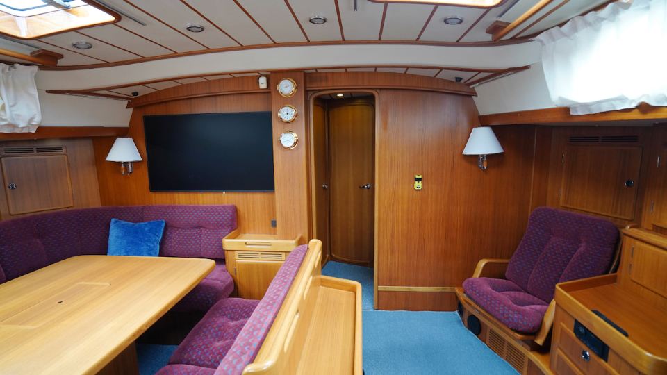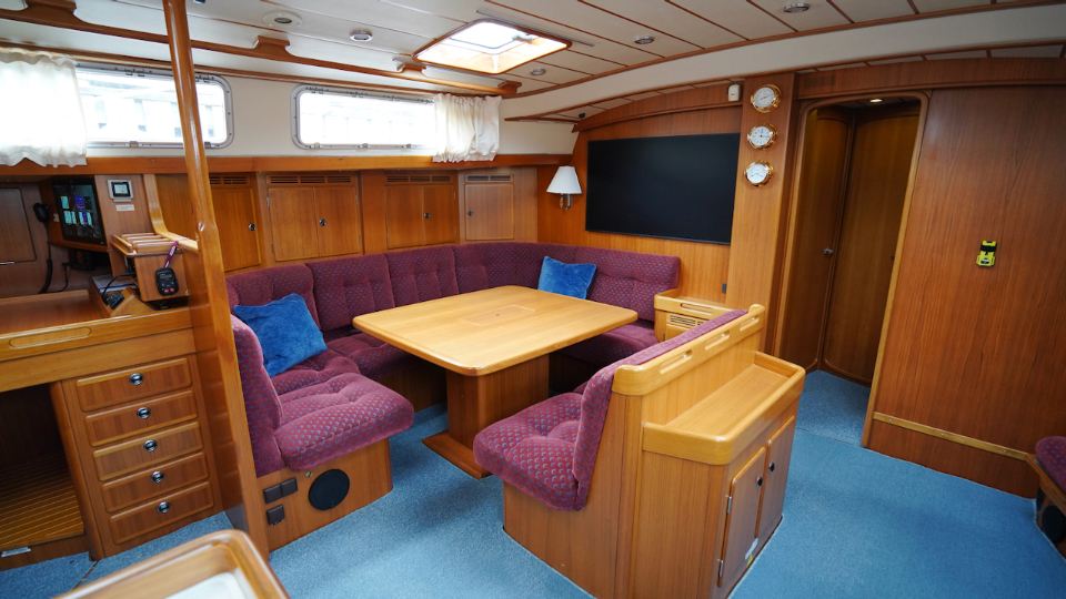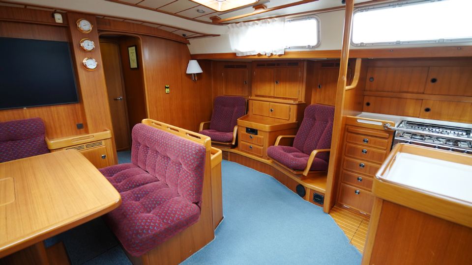 The classic Hallberg-Rassy interior in high-quality teak creates a warm and exclusive atmosphere. The layout is thoughtfully designed with a focus on both social areas and functionality, making the yacht very comfortable even during extended stays on board.