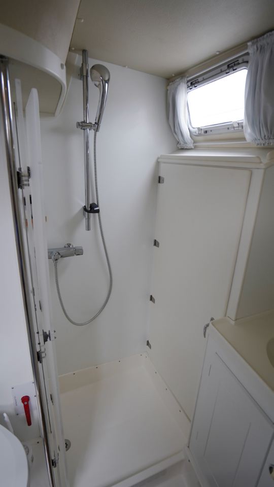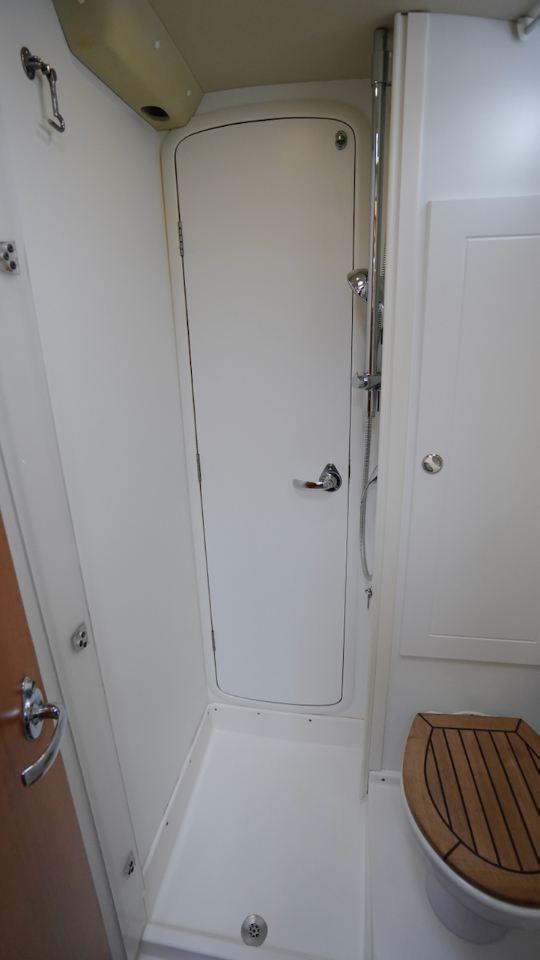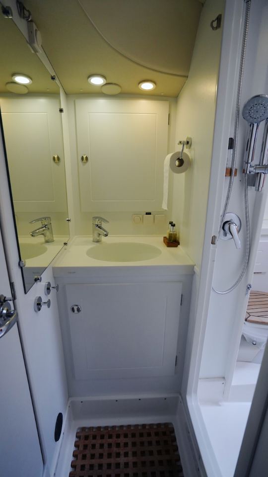 Aft, there is a spacious owner’s cabin with a double berth to port and a single berth to starboard, generous storage and an en-suite bathroom with separate shower. Forward, there are three separate guest cabins, all with their own toilet and shower facilities. These include a forepeak with V-berth, one cabin with a double berth and one with bunk beds, providing excellent flexibility and comfort even for larger parties. The saloon is bright, spacious and elegant, with generous natural light and ample storage.