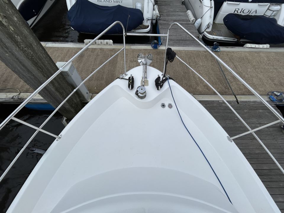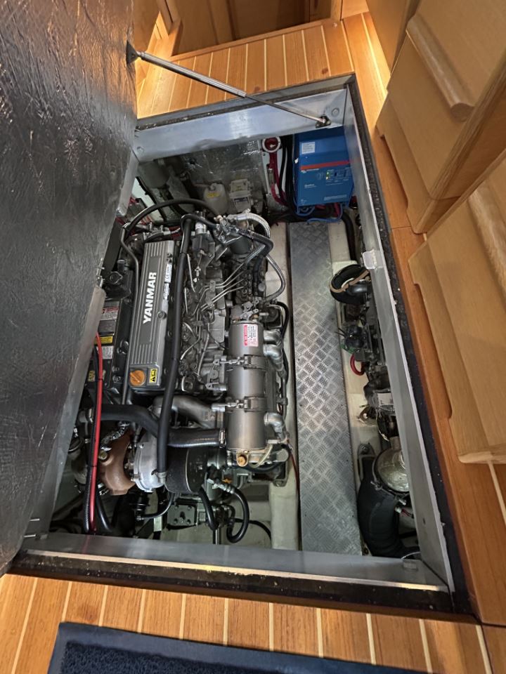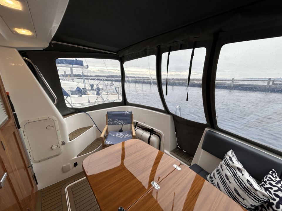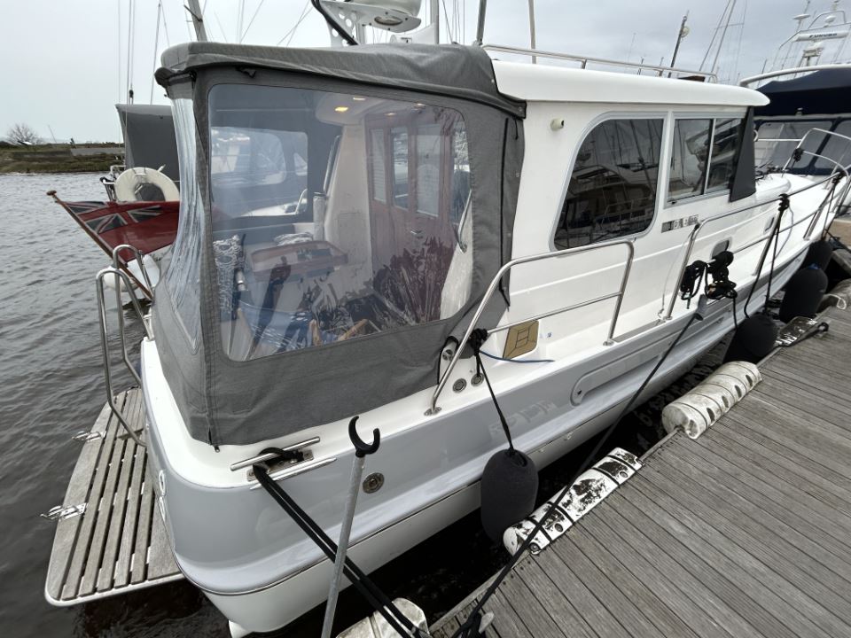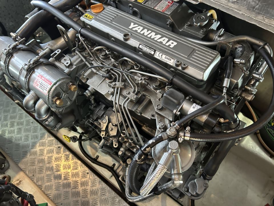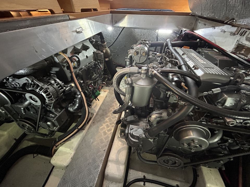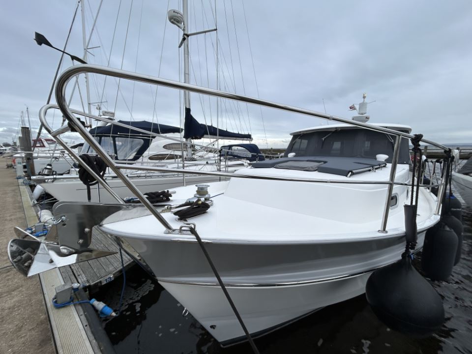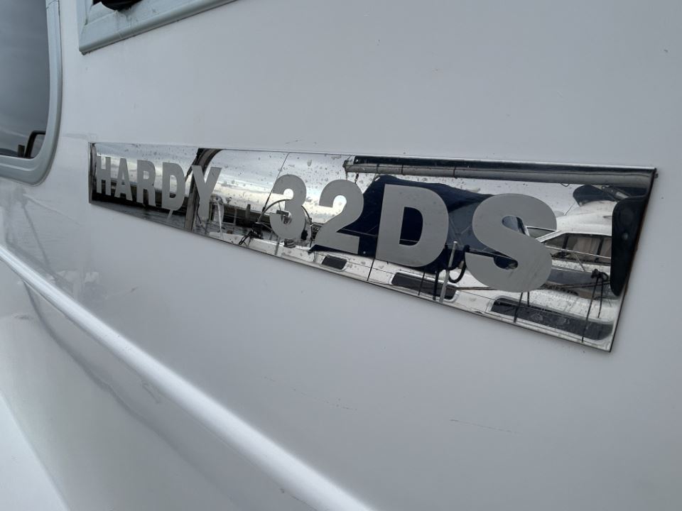 The Hardy 32DS is a true testament to British boatbuilding at its best, and these hulls were in production from 2000 onwards – providing a properly-built cruising motor-yacht with comfortable accommodation for the offshore cruising couple, and space for friends to join for the ride too. Engine access is simple, with plenty of space around each Yanmar for service points and checks, and her drivetrain is straightforward – with a regular twin-shaft-drive set-up. Notably, she has been fitted with a handy Fischer Panda generator, a new Raymarine navigation suite, new soft furnishings and galley kit – so with her recent aft canopy, heating and calorifier – she is singularly well-prepared to venture afar.