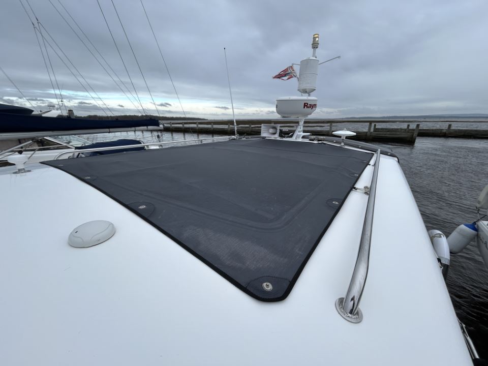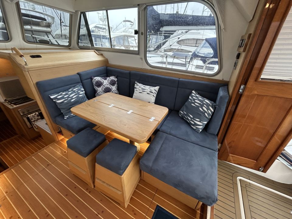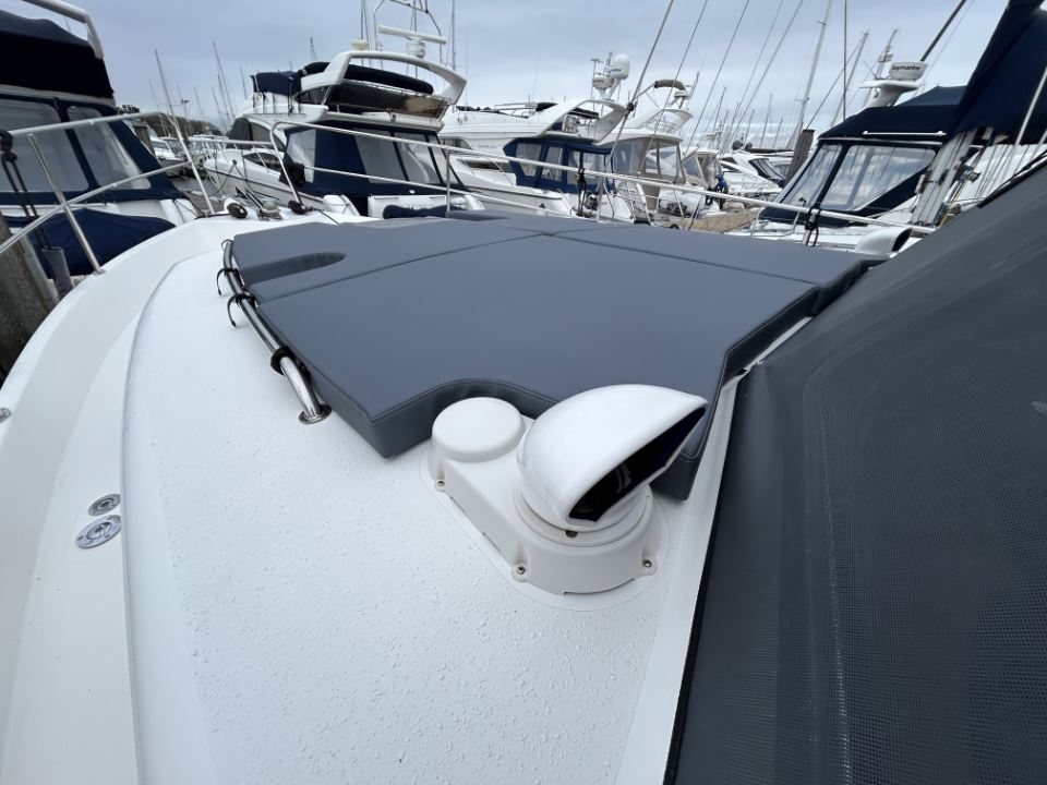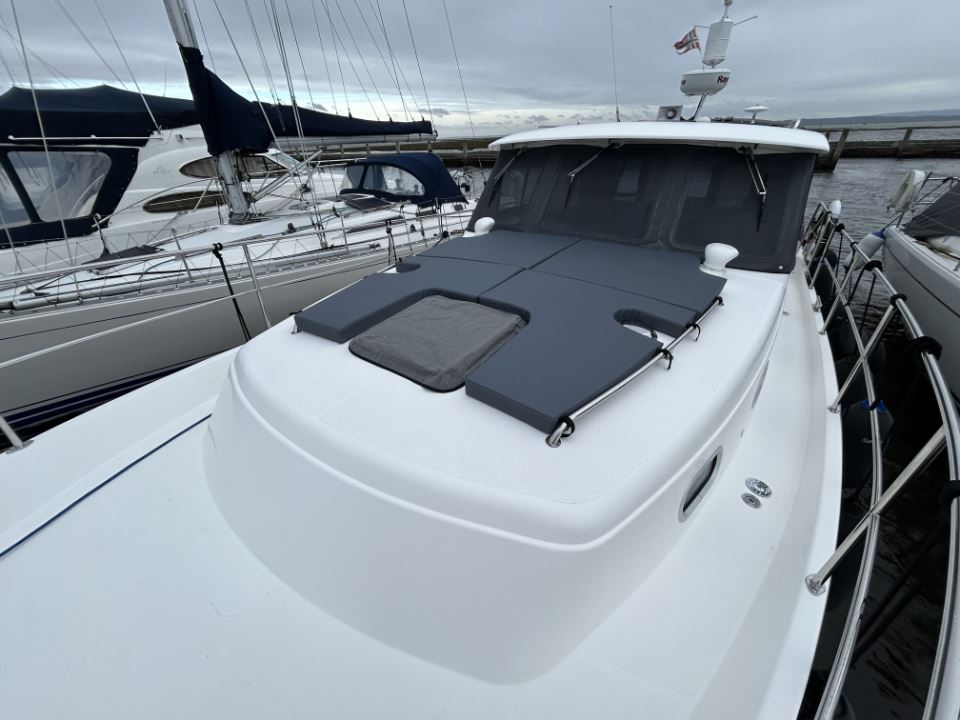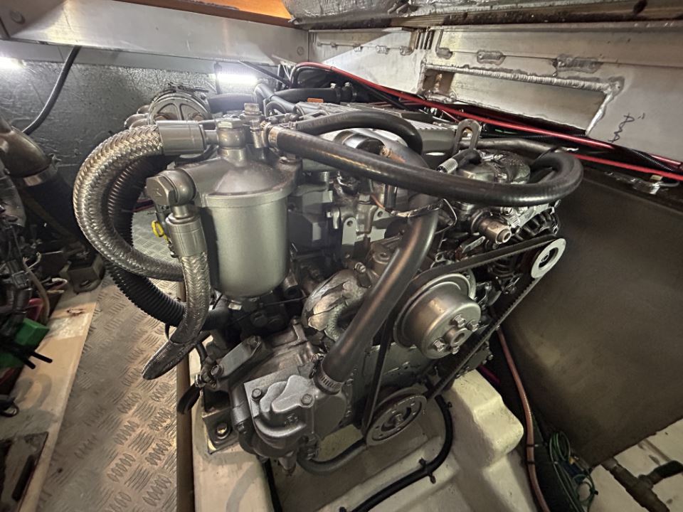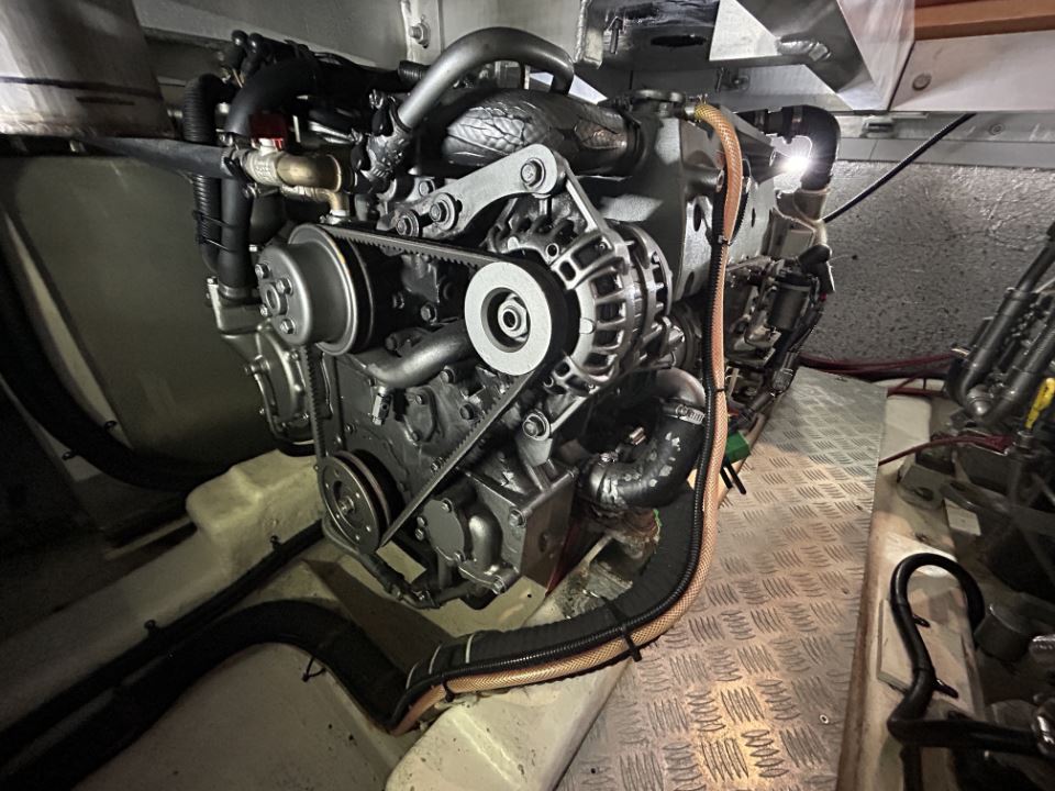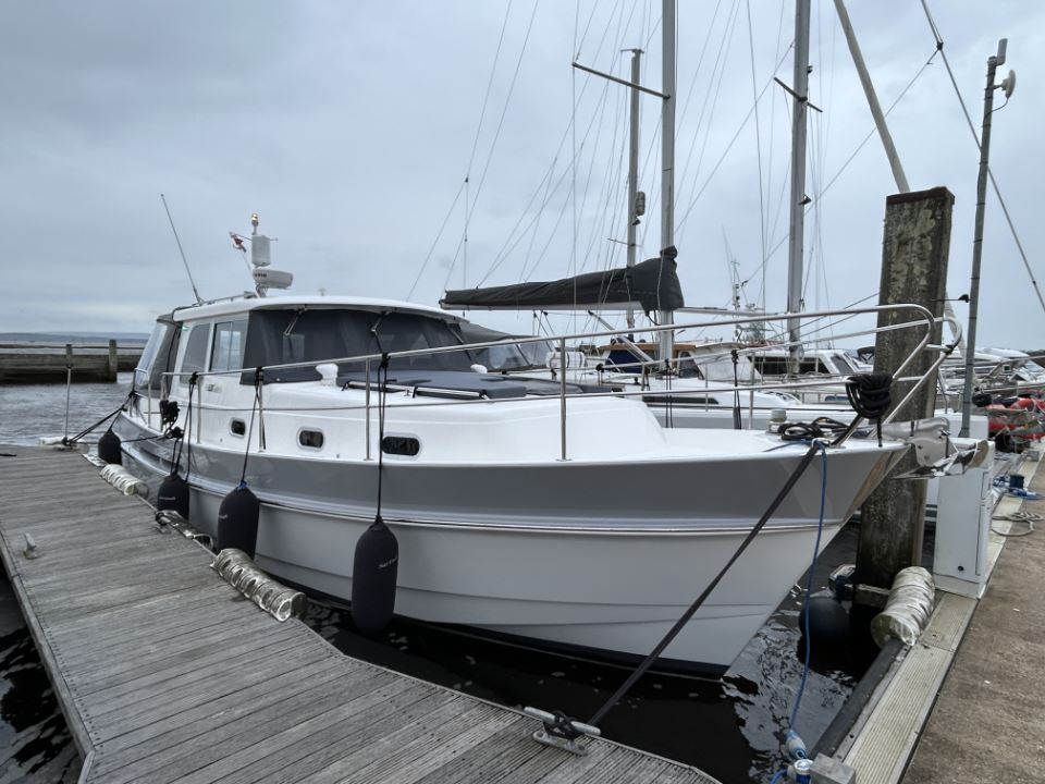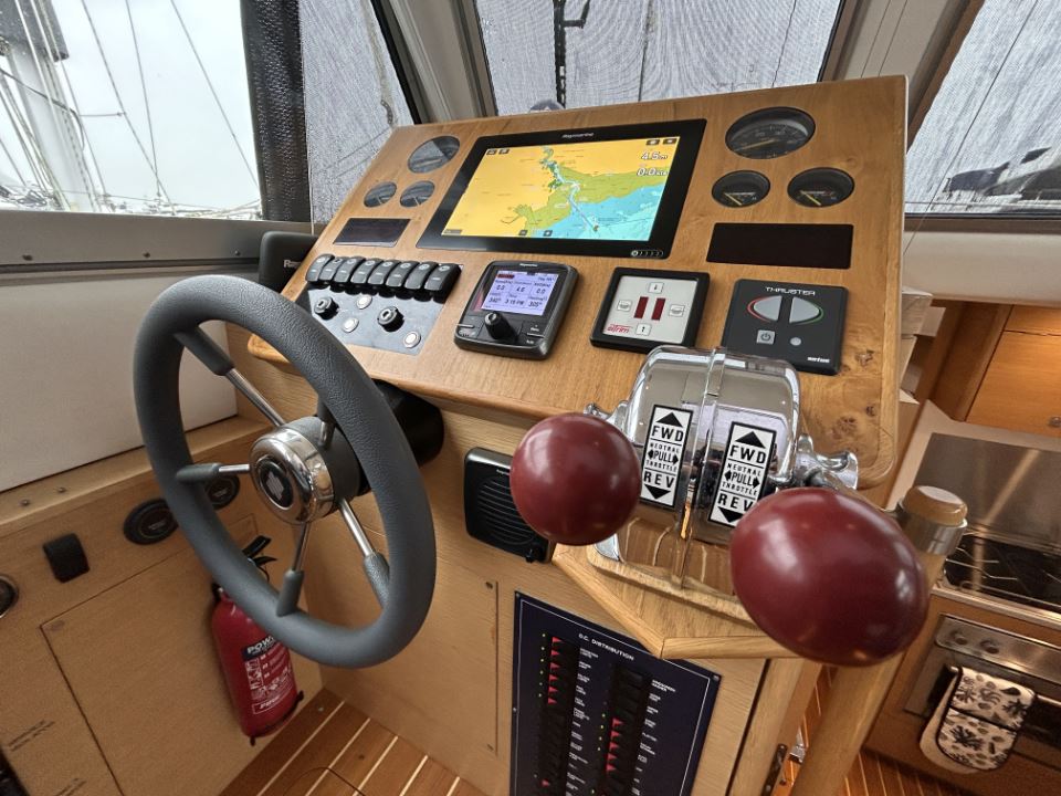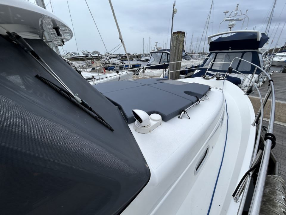 The Hardy 32DS is a true testament to British boatbuilding at its best, and these hulls were in production from 2000 onwards – providing a properly-built cruising motor-yacht with comfortable accommodation for the offshore cruising couple, and space for friends to join for the ride too. Engine access is simple, with plenty of space around each Yanmar for service points and checks, and her drivetrain is straightforward – with a regular twin-shaft-drive set-up. Notably, she has been fitted with a handy Fischer Panda generator, a new Raymarine navigation suite, new soft furnishings and galley kit – so with her recent aft canopy, heating and calorifier – she is singularly well-prepared to venture afar.