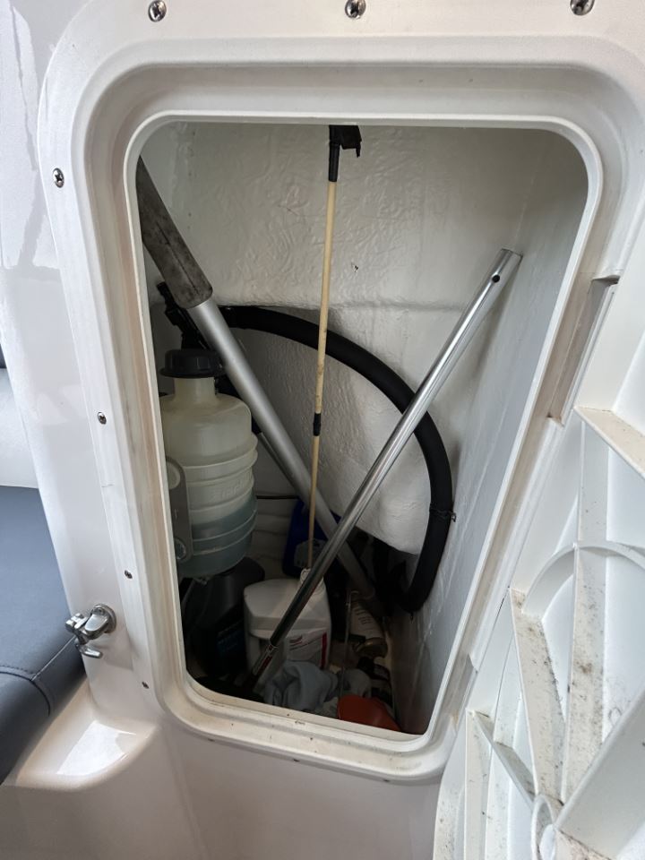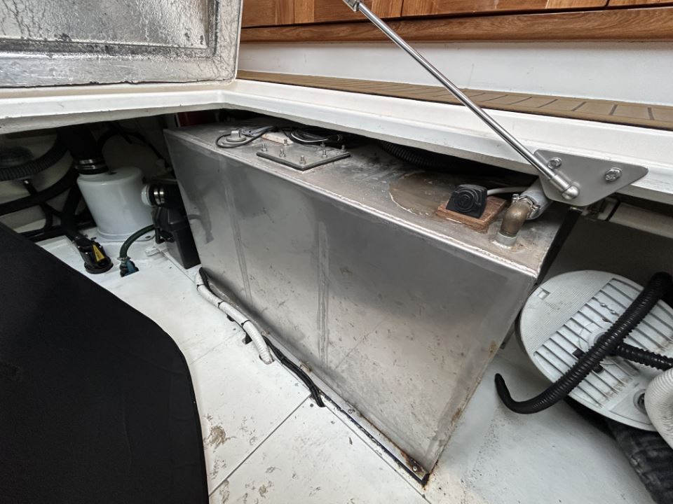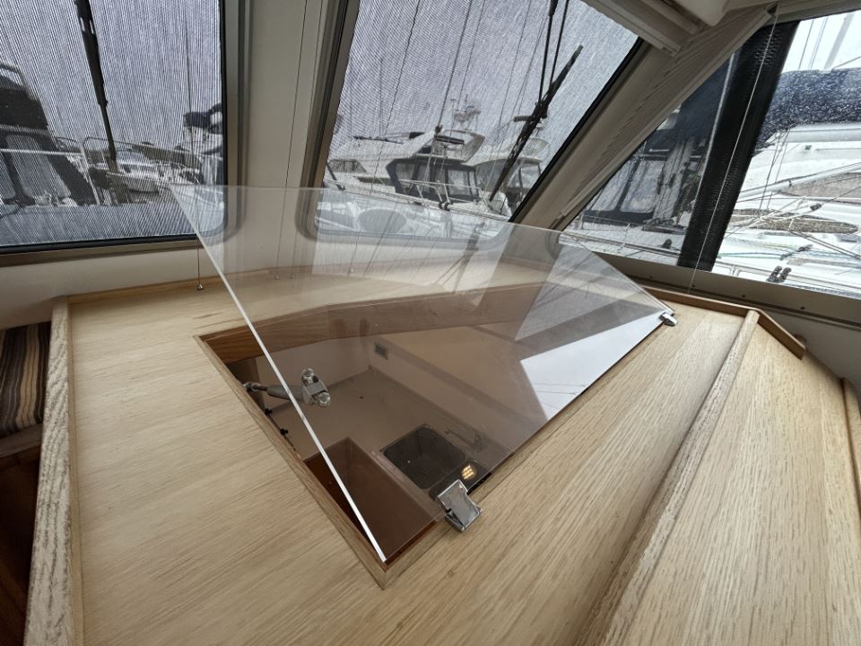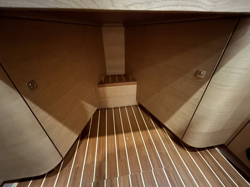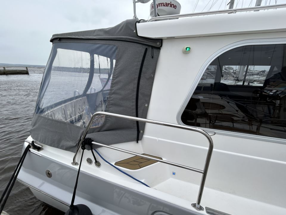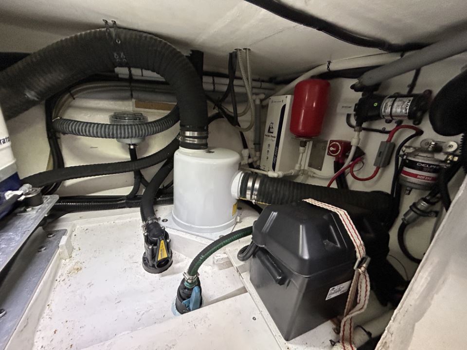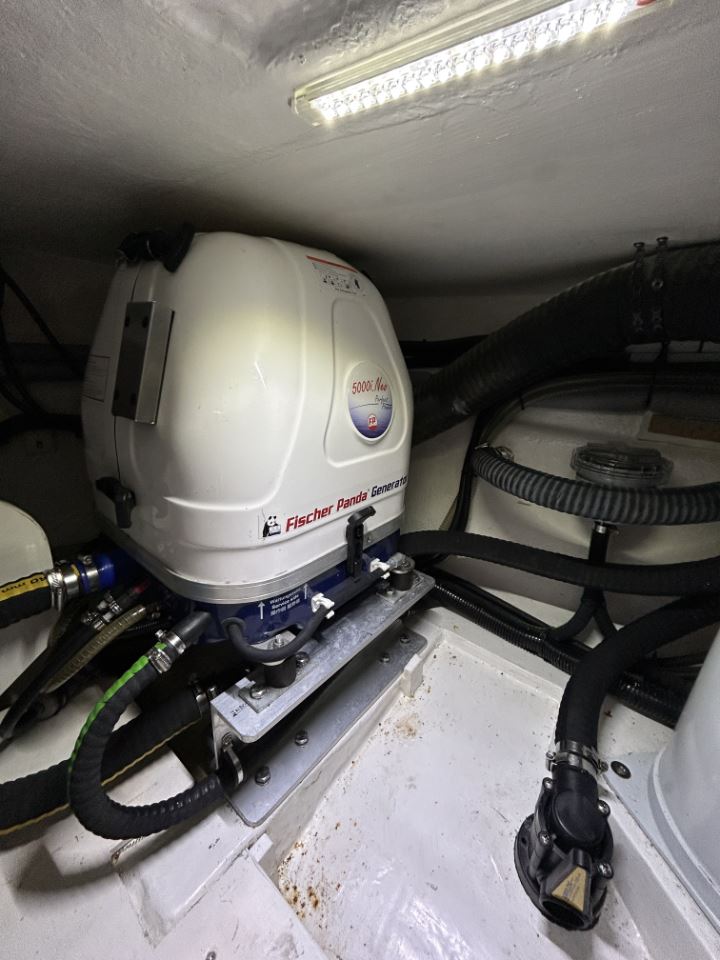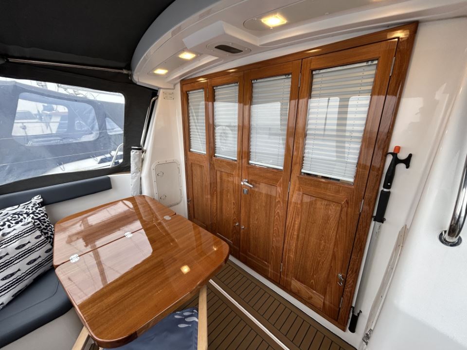 The Hardy 32DS is a true testament to British boatbuilding at its best, and these hulls were in production from 2000 onwards – providing a properly-built cruising motor-yacht with comfortable accommodation for the offshore cruising couple, and space for friends to join for the ride too. Engine access is simple, with plenty of space around each Yanmar for service points and checks, and her drivetrain is straightforward – with a regular twin-shaft-drive set-up. Notably, she has been fitted with a handy Fischer Panda generator, a new Raymarine navigation suite, new soft furnishings and galley kit – so with her recent aft canopy, heating and calorifier – she is singularly well-prepared to venture afar.