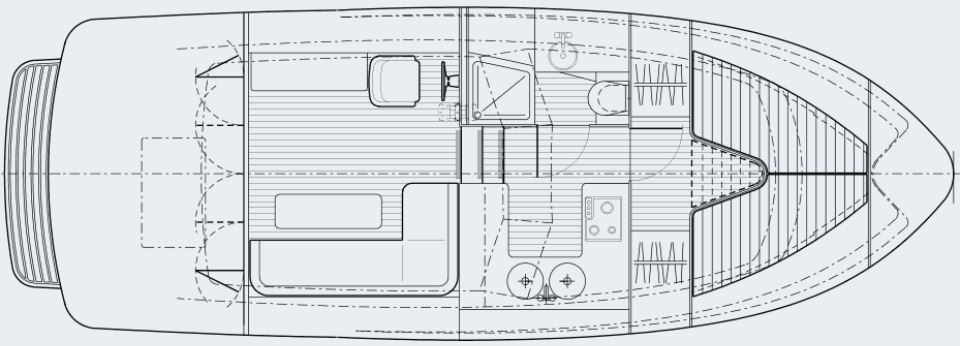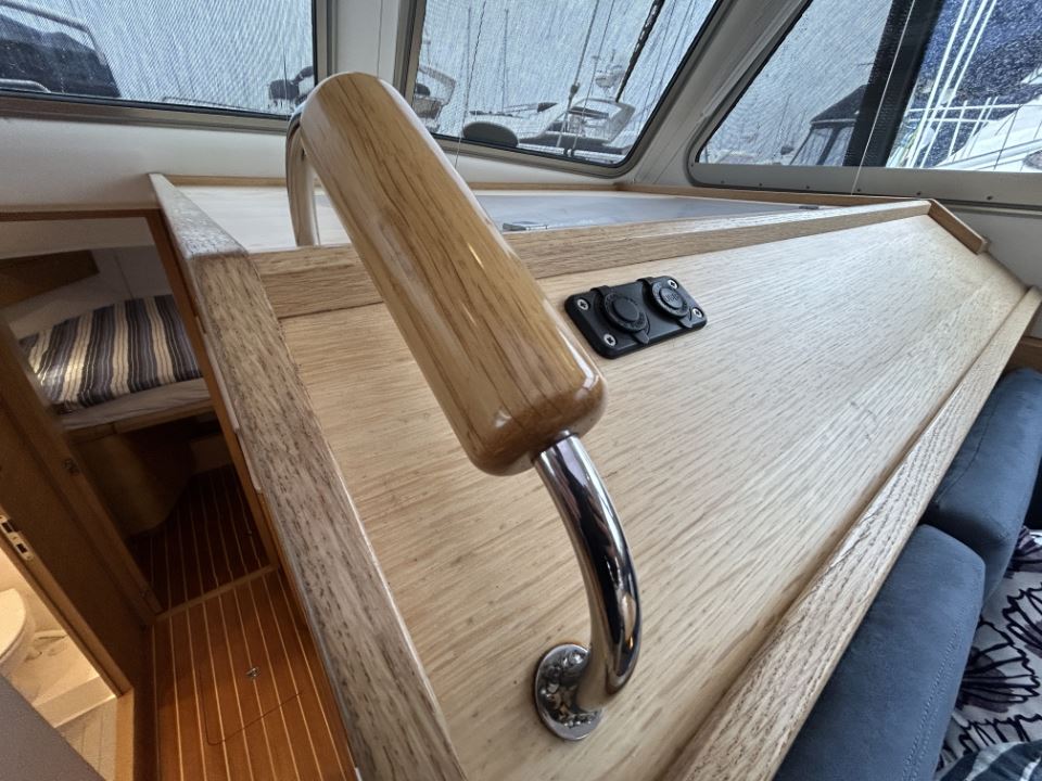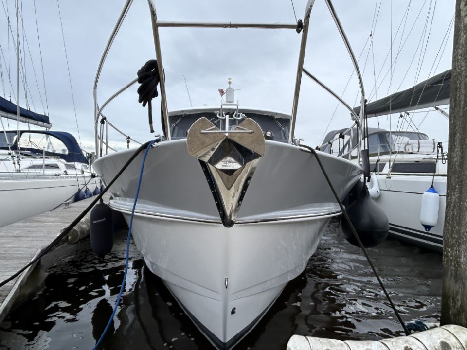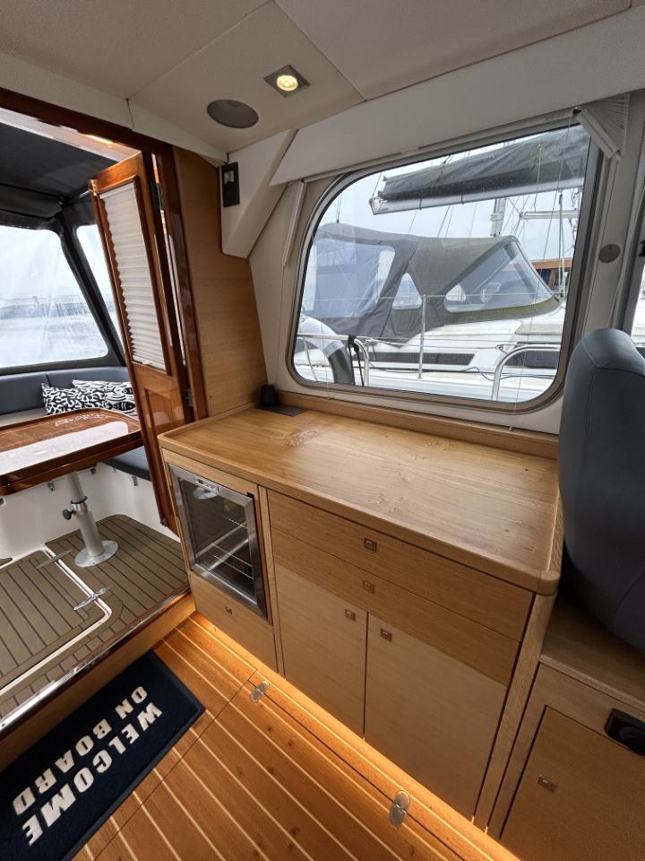 Having visited the Norfolk yard, where this 32 was built, it is evident that this is traditional British boatbuilding at its best. Hardy are not heavily mechanized, build their own interiors (SARINAH’s American Light Oak is still in great condition – with the evident care of her previous Owners), with hulls being fitted-out labour-intensively by a long-term team of skilled craftsmen. This particular 32DS is very special in that she was professionally refitted by Cockwells of Mylor Bridge, with a remodeling of her interior to accommodate a proper, separate shower, U-shaped galley and sensible modifications to her console, wheelhouse, and deck saloon. These hulls are superbly soft-riding and display how capable this semi-displacement hull really is. As a sea-boat – the design is very hard to fault – combining powerful offshore performance with easily-worked decks, and reliably indestructible interiors that are traditional, yet very livable with.