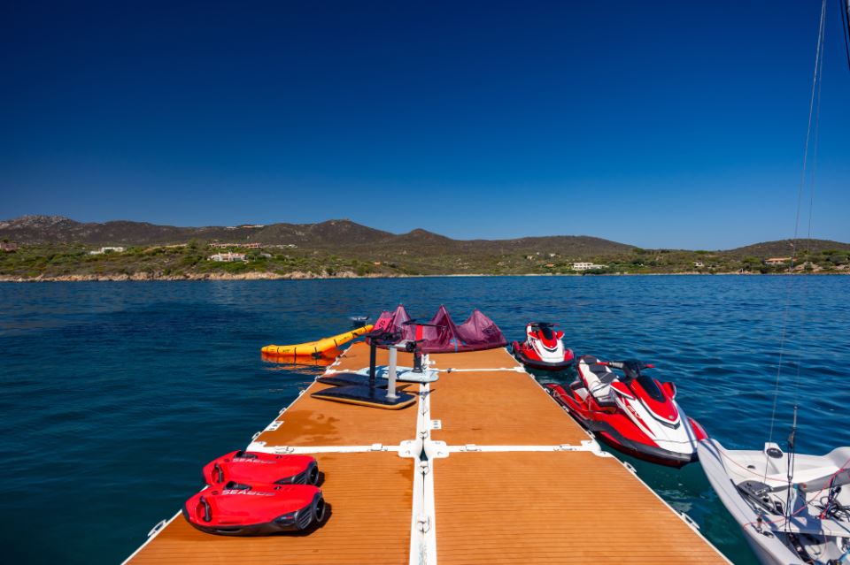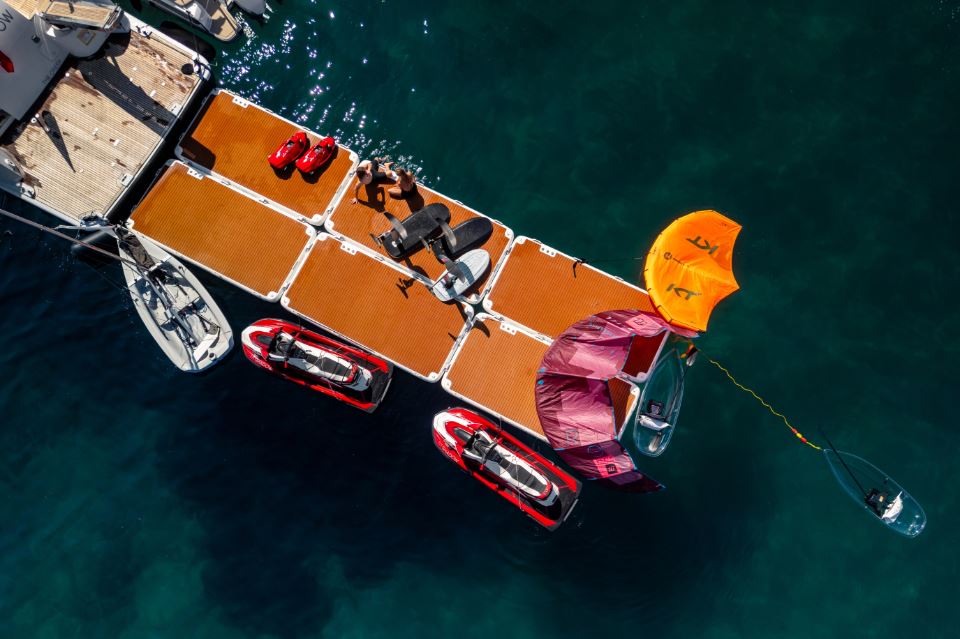 SHADOW is comprehensively equipped for watersports and guest enjoyment. She carries a MasterCraft NXT20, delivering competition-level wakesurfing and wakeboarding, alongside an Axopar 37 chase tender. Widely regarded for its handling and intelligent layout, the Axopar is ideal for fast, comfortable guest transfers, coastal exploration, and accessing shallow bays and secluded beaches. Both tenders can carry paddleboards, seabobs, and e-foils, significantly broadening the onboard activity offering. Launch and recovery operations are handled by a Feebe Hydraulic Telescopic Crane (DCT-90) with a 2,000 kg safe working load, ensuring efficiency and safety.