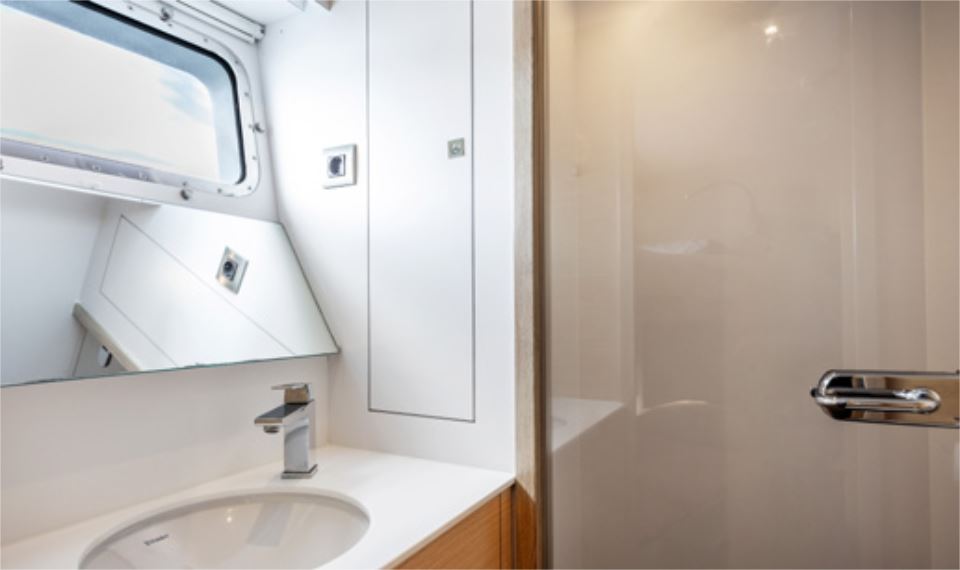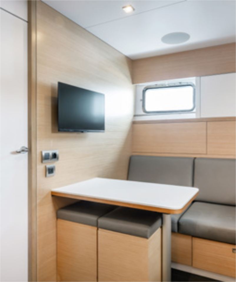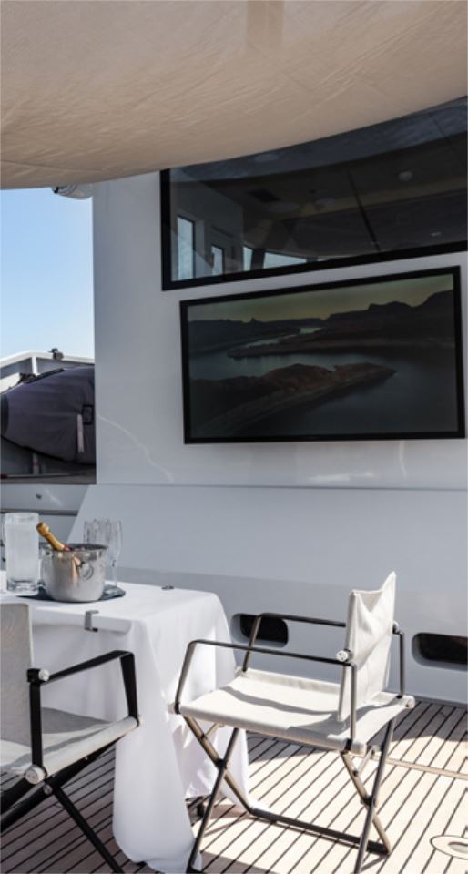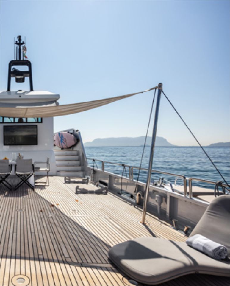 Once the tenders and Jet Skis are deployed, SHADOW’s fully teak-laid deck becomes a refined social environment. Generous sun loungers, flexible seating, a powerful sound system, and a large TV provide an ideal setting for relaxation or entertaining between activities, all comfortably shaded by an awning when required.