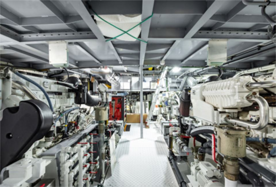 Operationally, SHADOW is engineered for efficiency, stability, and predictable handling. Powered by twin Cummins QSM11 engines producing 715 hp each, she offers a range of approximately 2,500 nautical miles at displacement speed (around 10 knots), with fuel consumption of approximately 60 litres per hour. Her minimal draft provides access to a wide variety of cruising grounds, enhancing her effectiveness as both a support and expedition platform.
