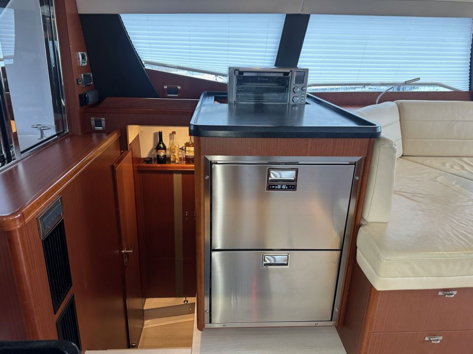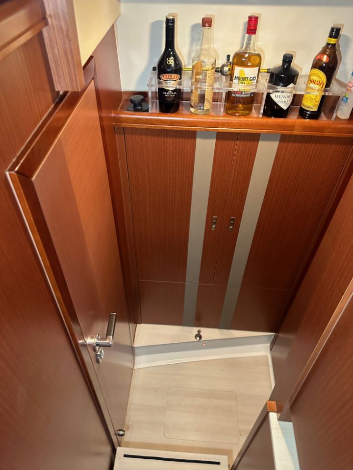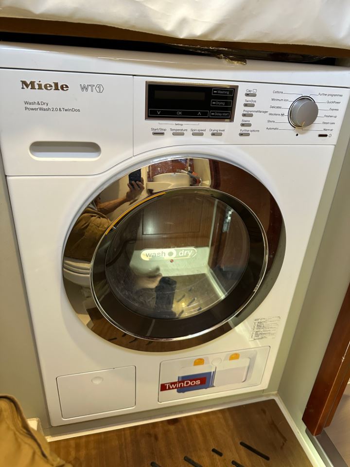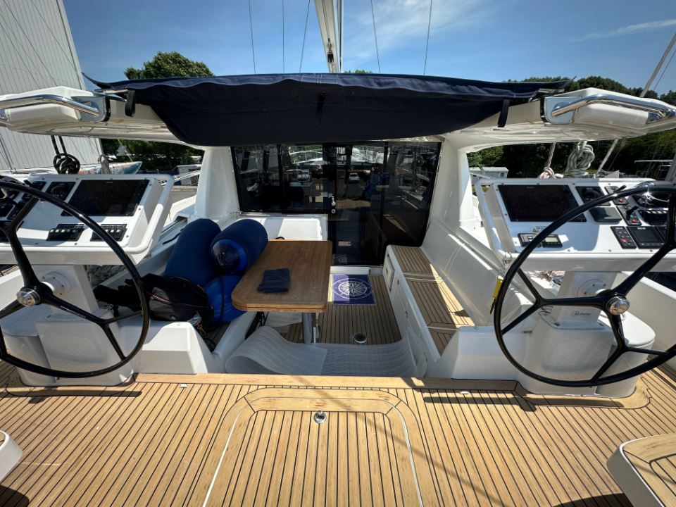 Aft of the saloon is a fourth twin-berth cabin, another head, and a washer-dryer. In the cockpit, there is a large, varnished fold-out table, a drinks fridge, and comfortable seating, protected by removable mesh side and rear curtains. Additionally, there is a large cockpit locker containing the watermaker. Under the rear deck is a dinghy stowage area accessible via the hydraulic fold-down swim platform.