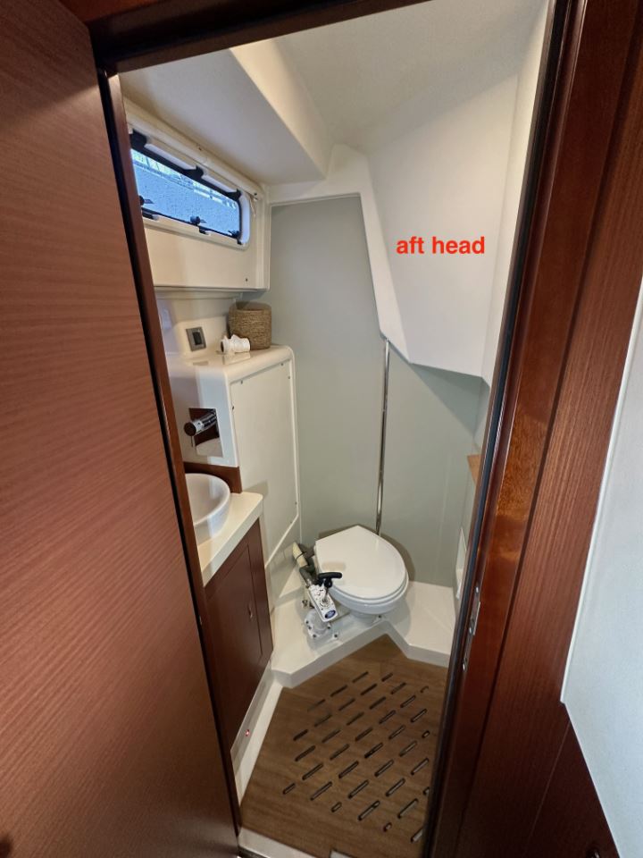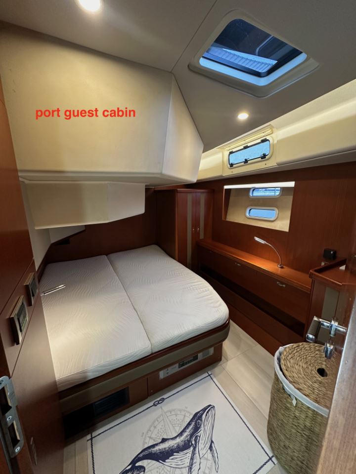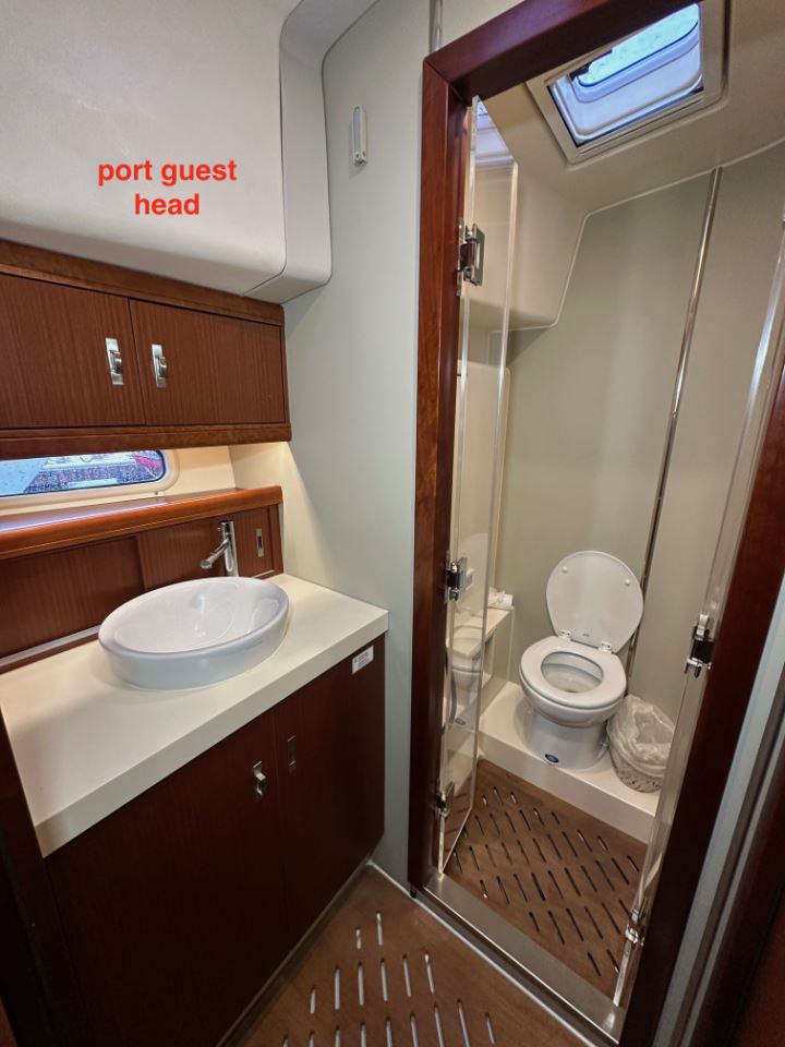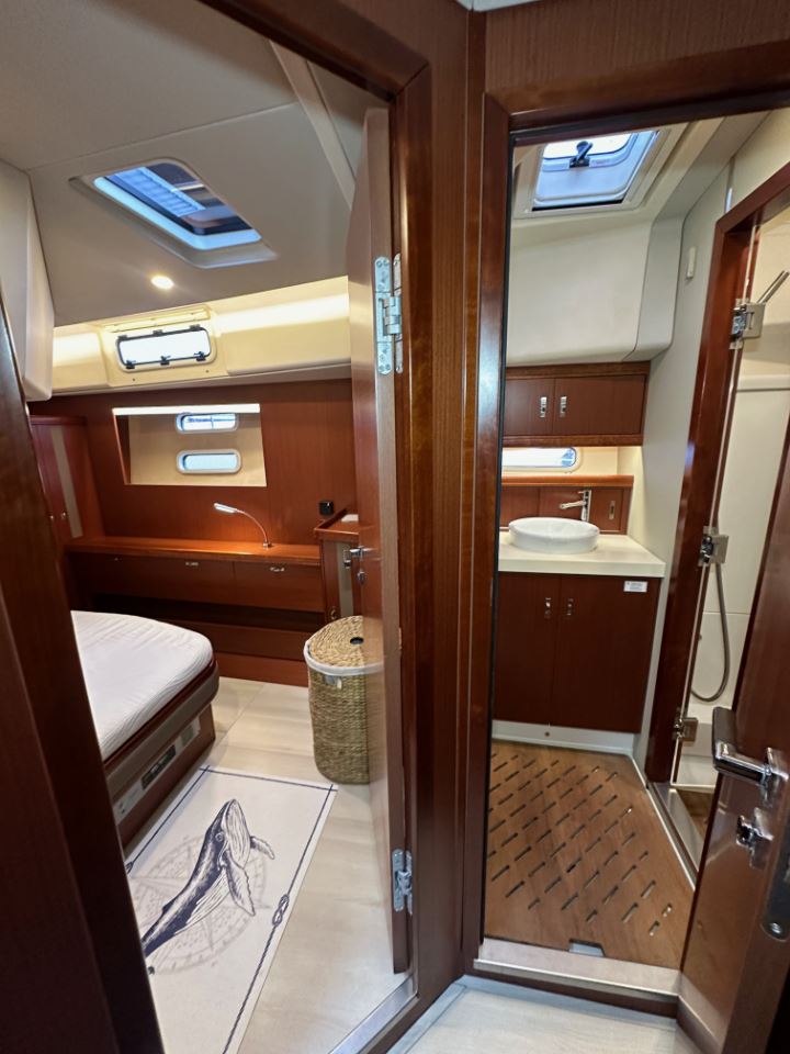 Forward, there is a sail locker, followed by the owner’s cabin with a large centerline bed and en-suite head and shower. Aft of that is the large guest cabin to port, featuring a second head and shower, with a second guest cabin to starboard.