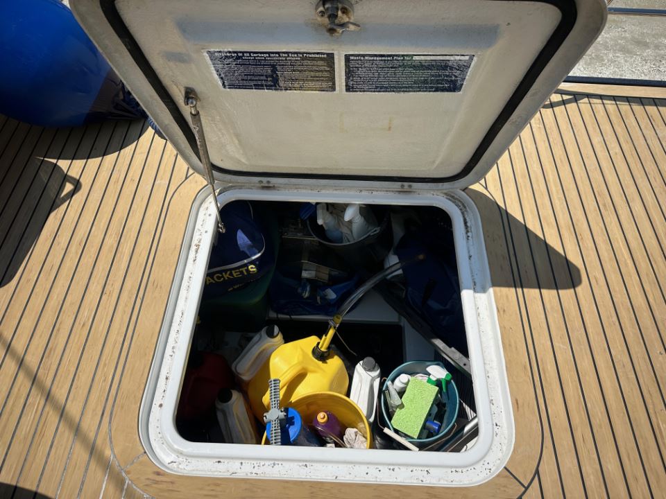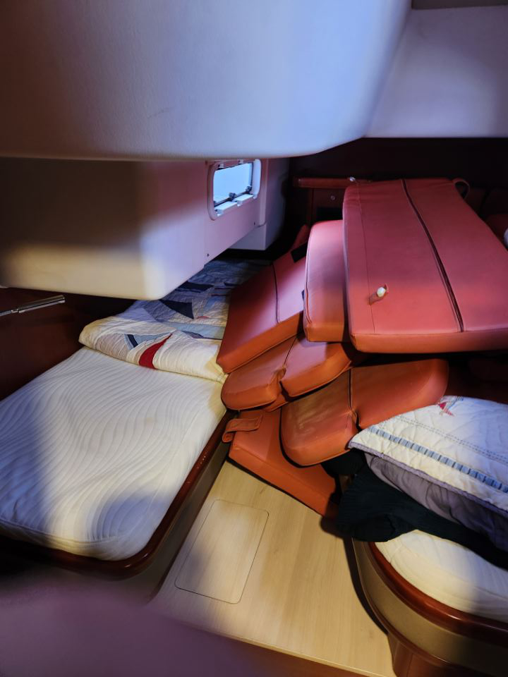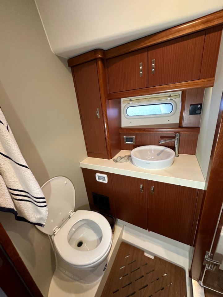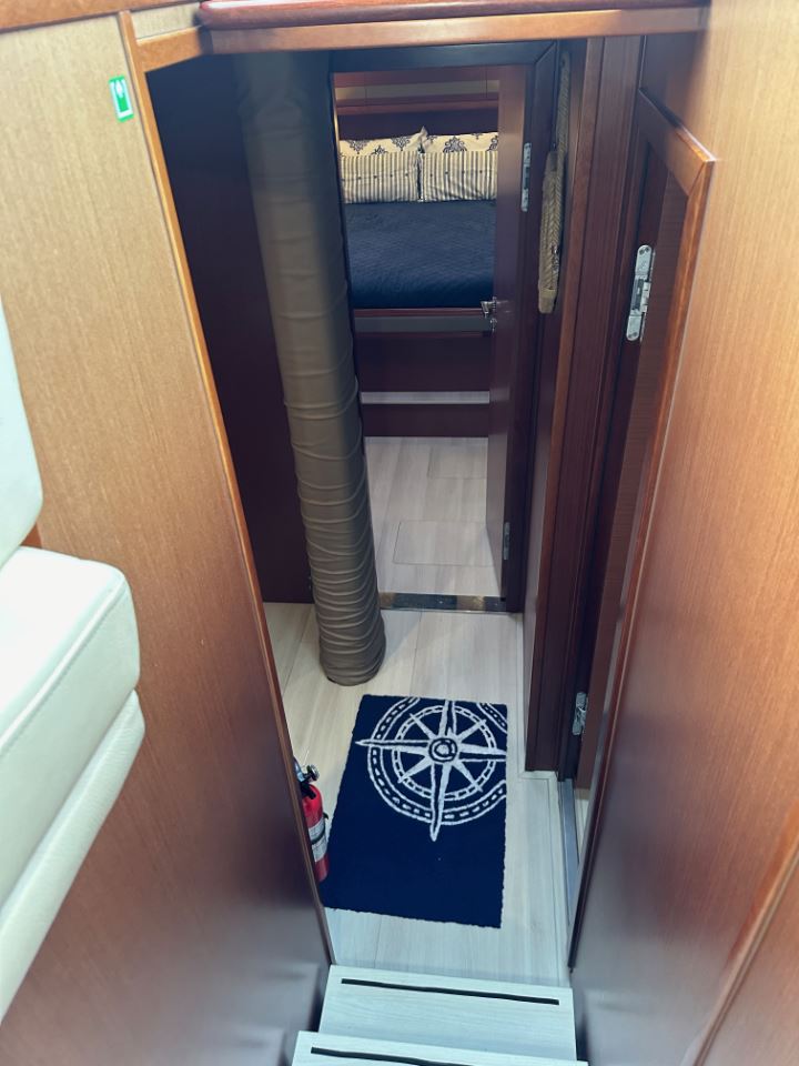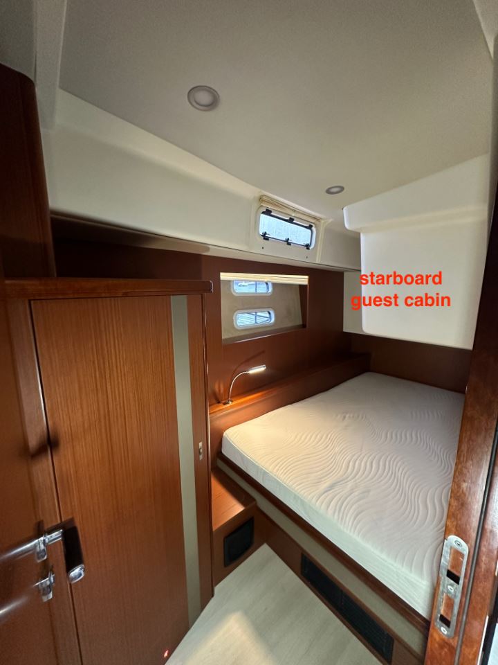 Forward, there is a sail locker, followed by the owner’s cabin with a large centerline bed and en-suite head and shower. Aft of that is the large guest cabin to port, featuring a second head and shower, with a second guest cabin to starboard.