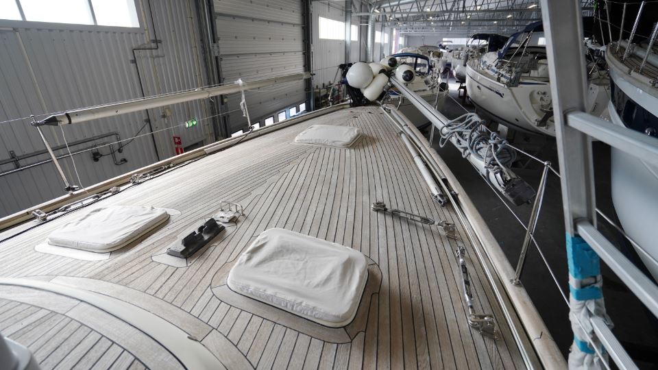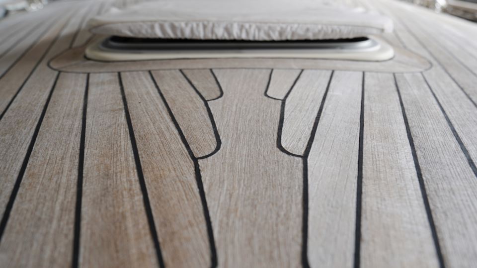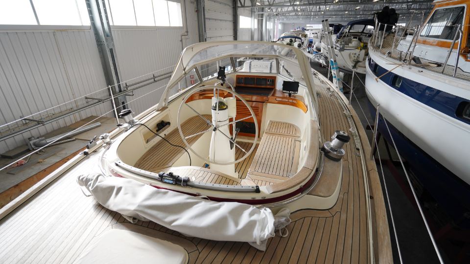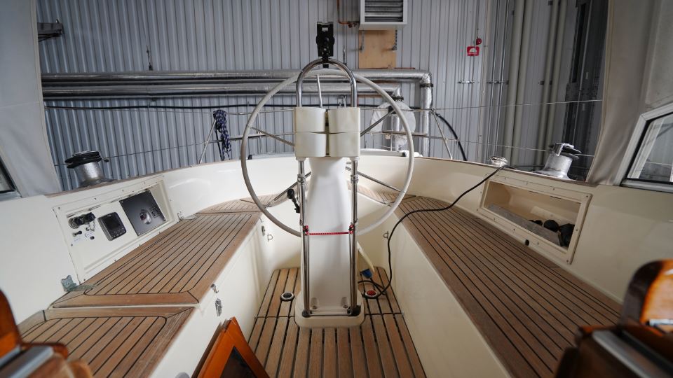 The hull is solid and reassuring, designed to provide both stability and good sailing performance. The centre cockpit is deep, well-protected and equipped with a fixed windscreen, giving a sense of security even in rough seas. From here, the helmsman has excellent visibility and easy access to winches and sheets.