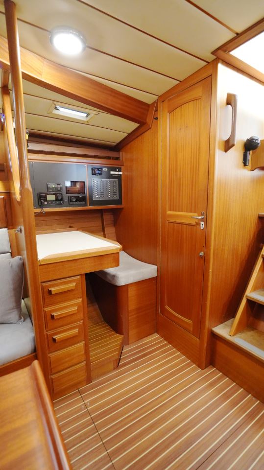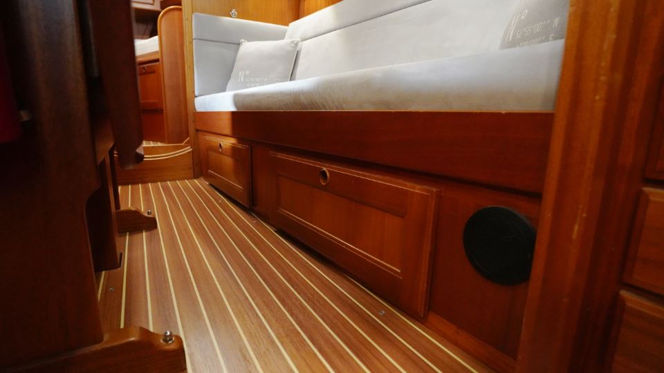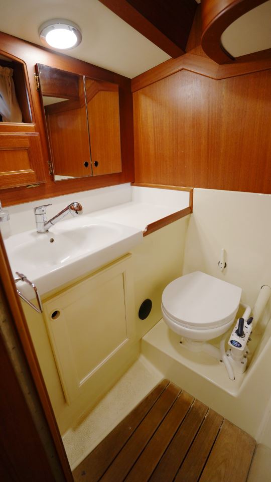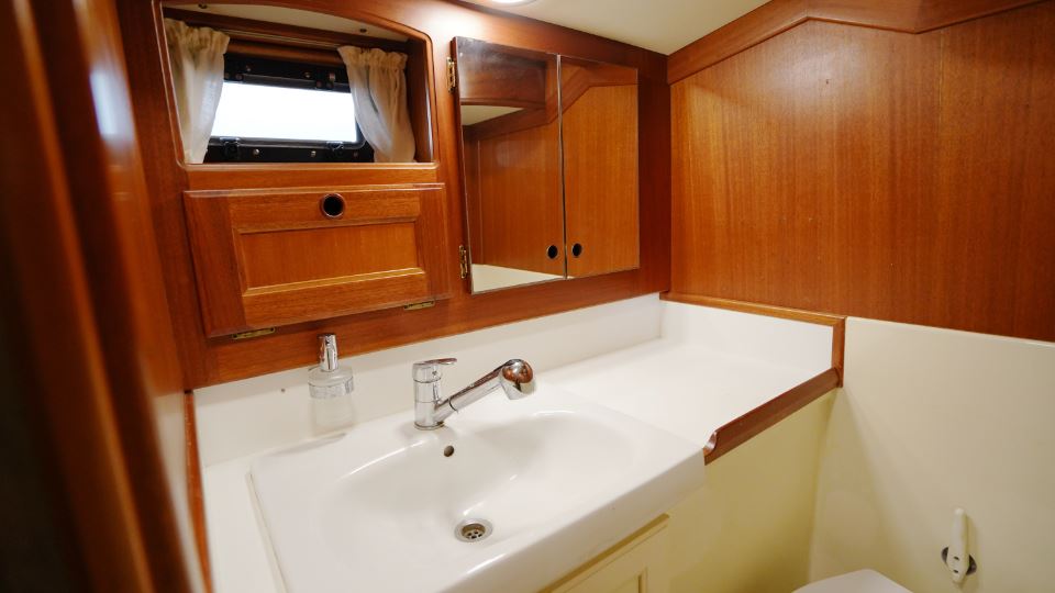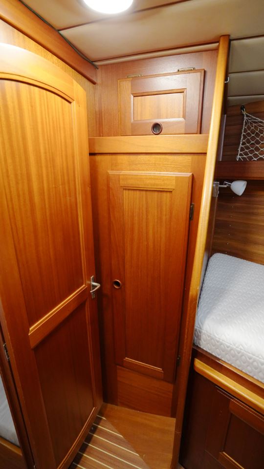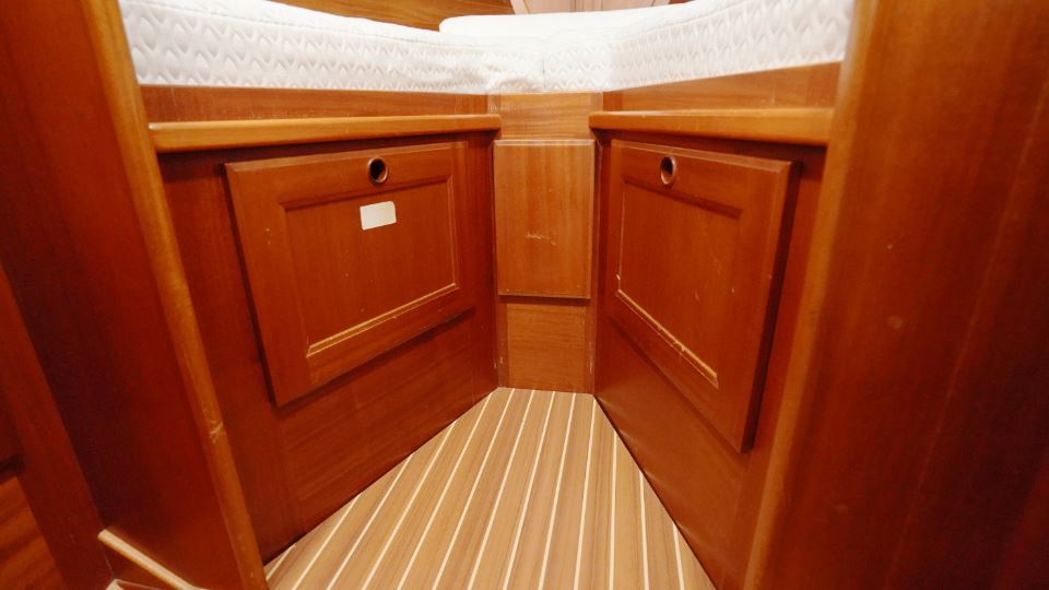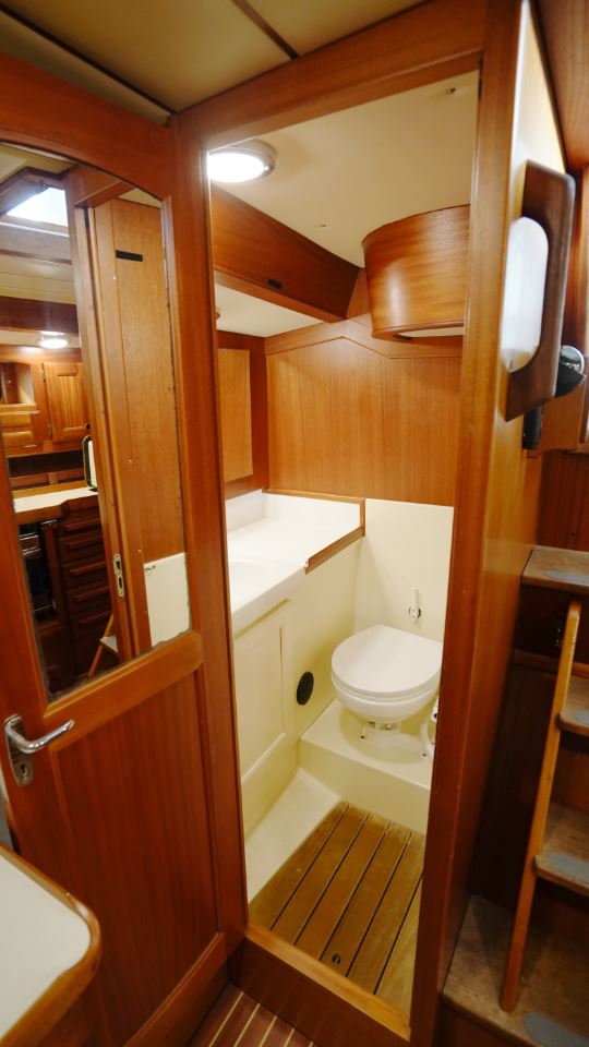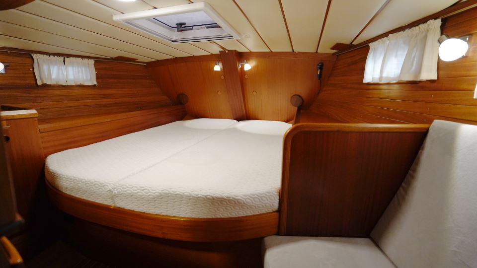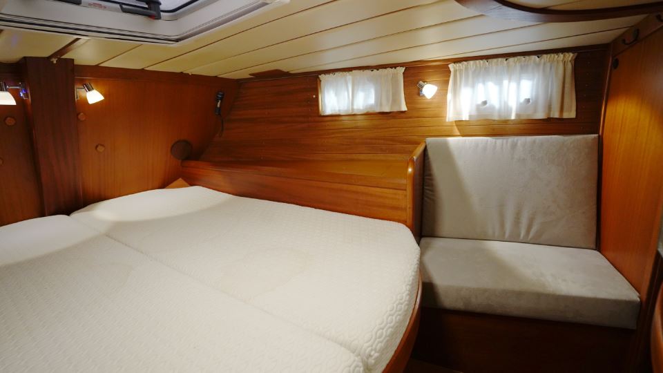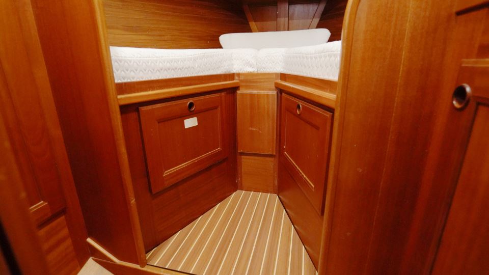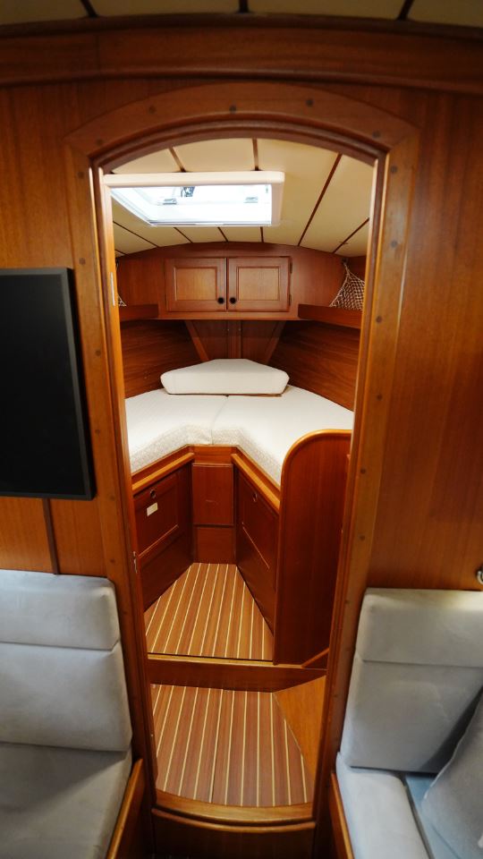 Aft lies the spacious owner’s cabin, featuring a double berth, plenty of lockers and shelves and a pleasant sense of privacy. Forward of the saloon is the forepeak, fitted with a comfortable V-berth that can be converted into a double with an infill and offers excellent storage space, making it ideal for guests or family members. Adjacent to the companionway is the head with shower and the navigation station.