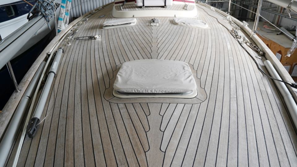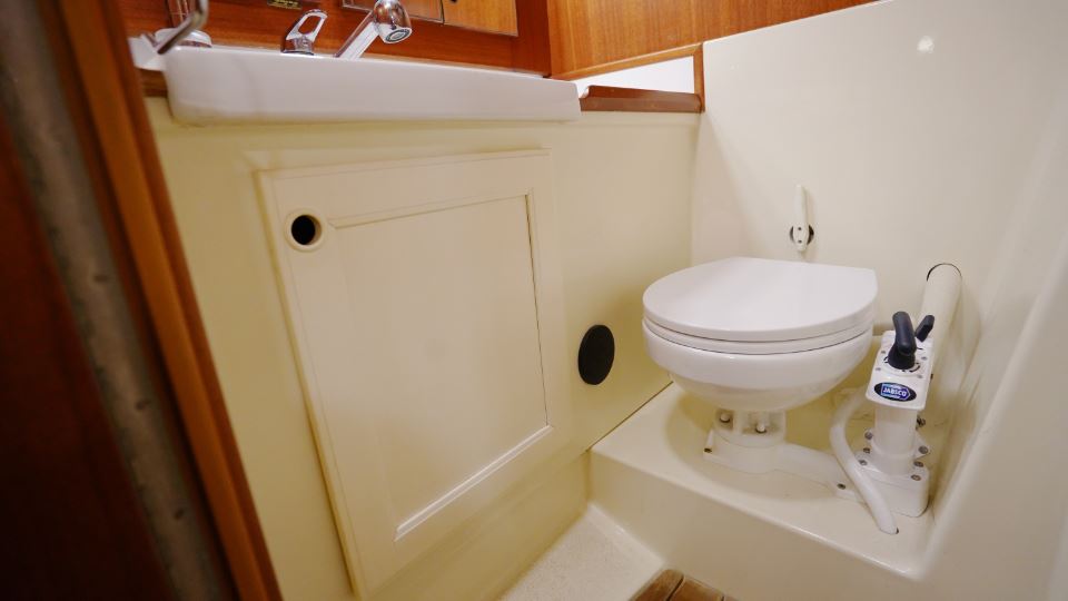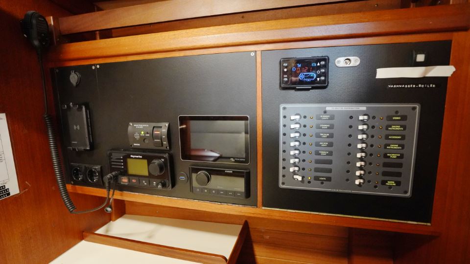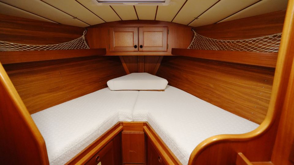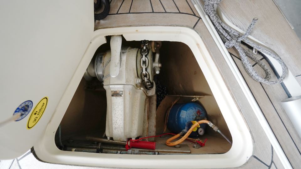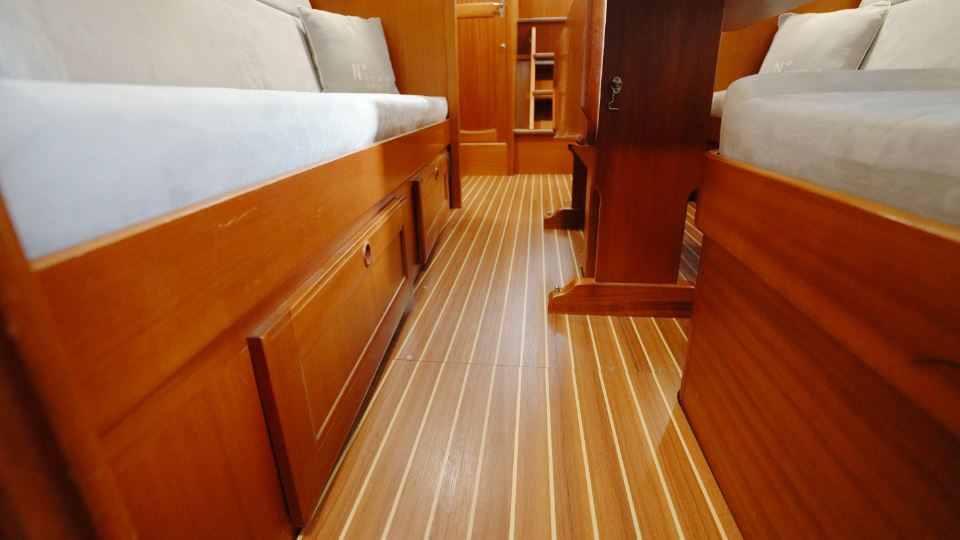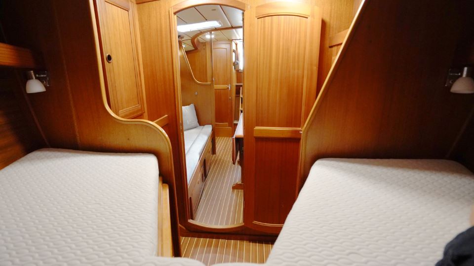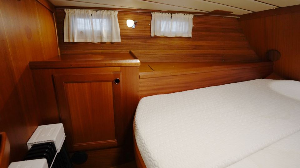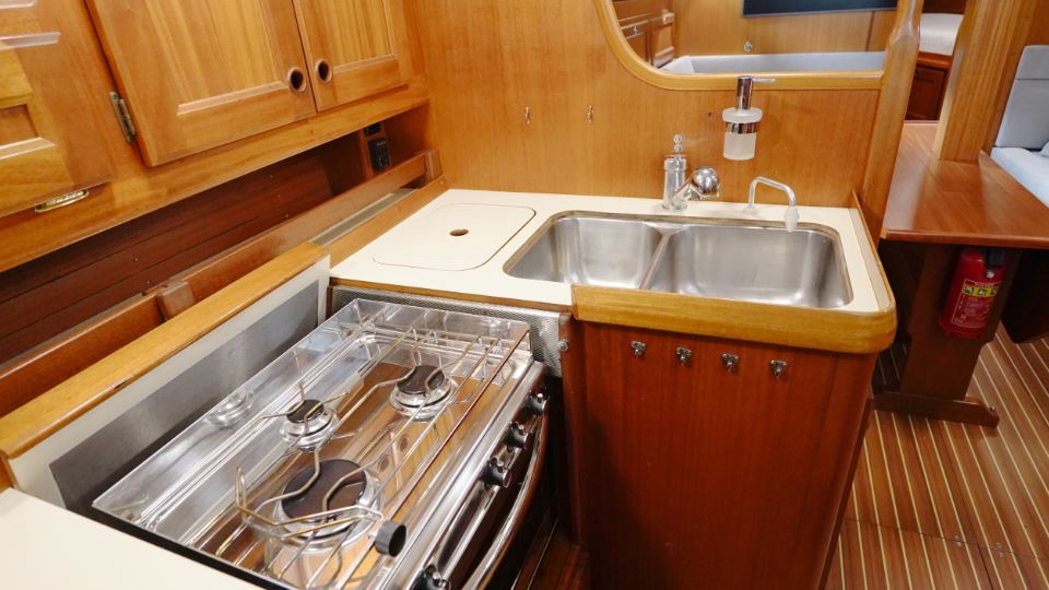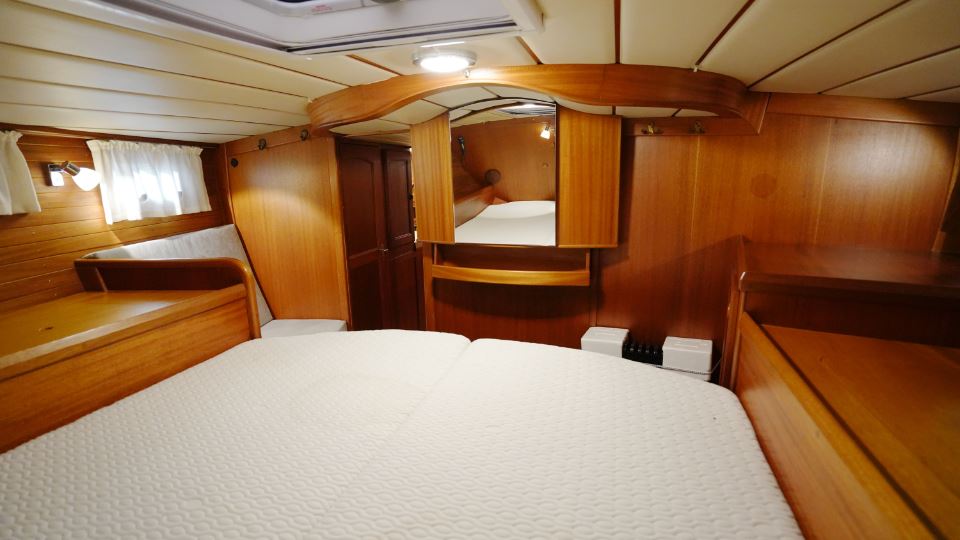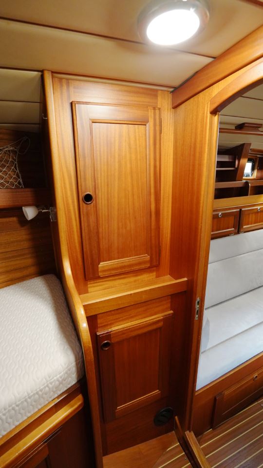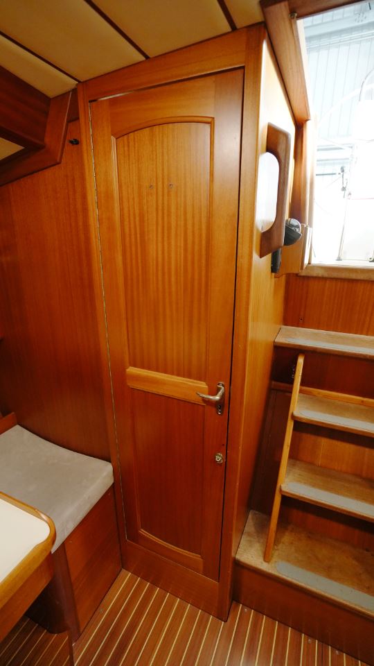 Aft lies the spacious owner’s cabin, featuring a double berth, plenty of lockers and shelves and a pleasant sense of privacy. Forward of the saloon is the forepeak, fitted with a comfortable V-berth that can be converted into a double with an infill and offers excellent storage space, making it ideal for guests or family members. Adjacent to the companionway is the head with shower and the navigation station.