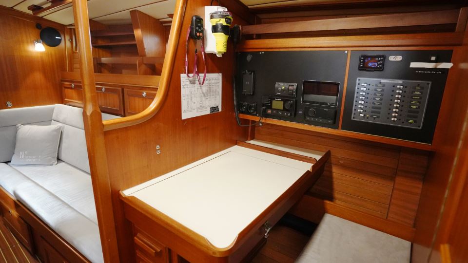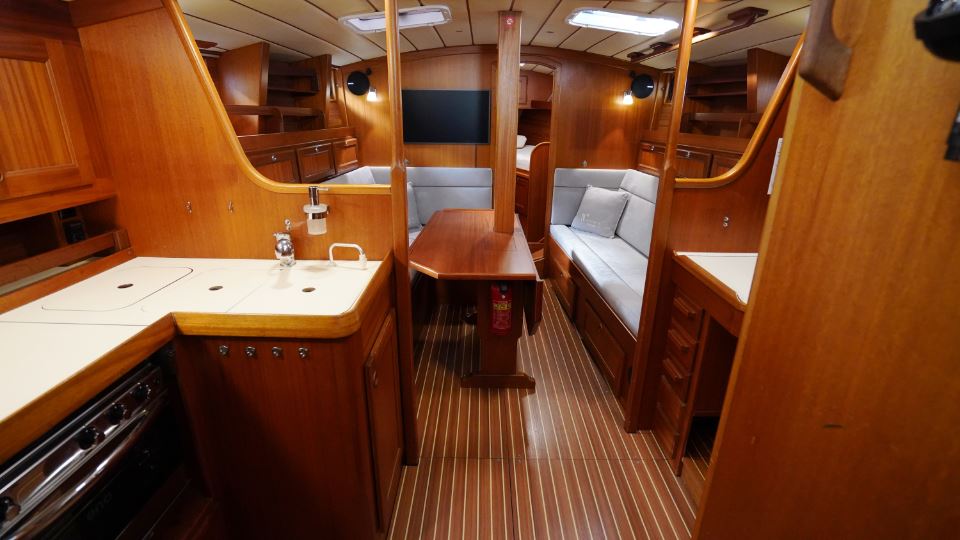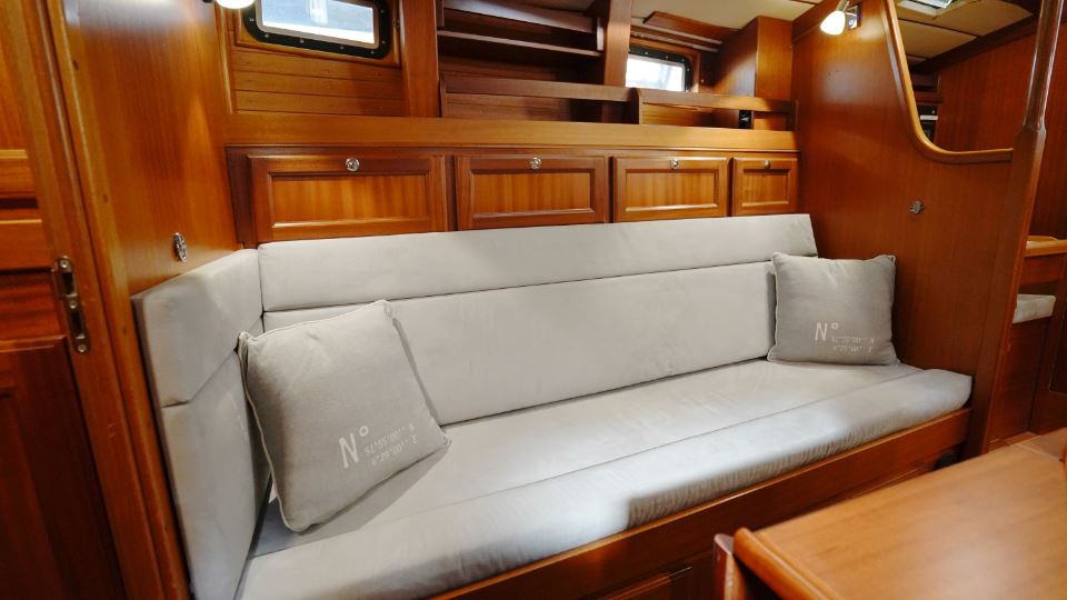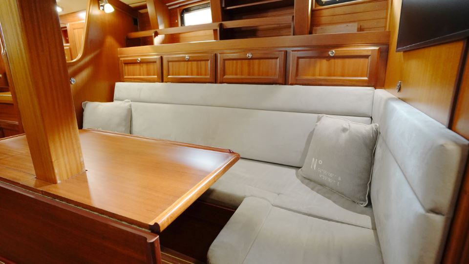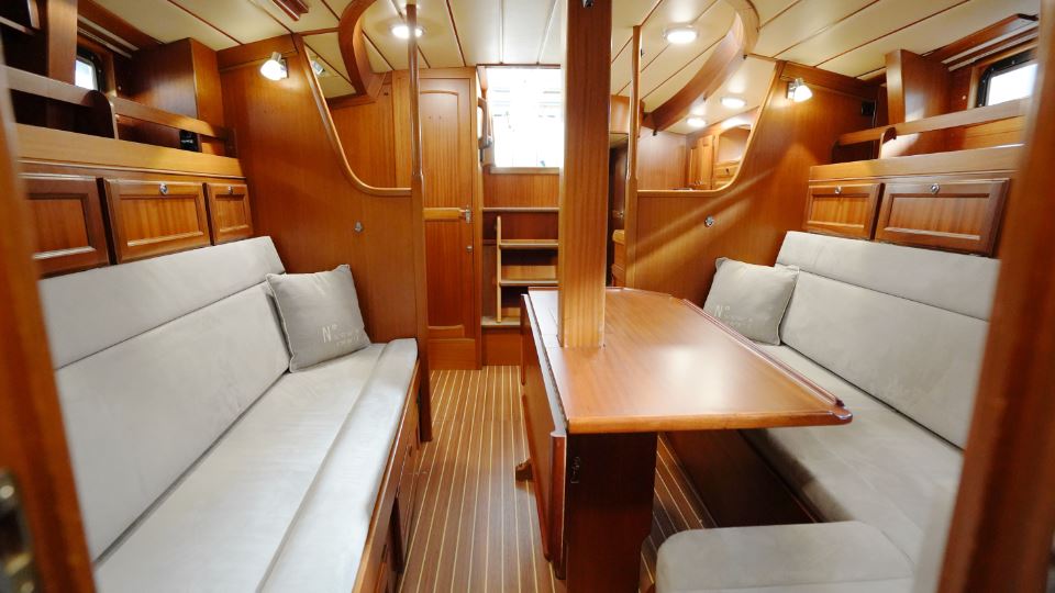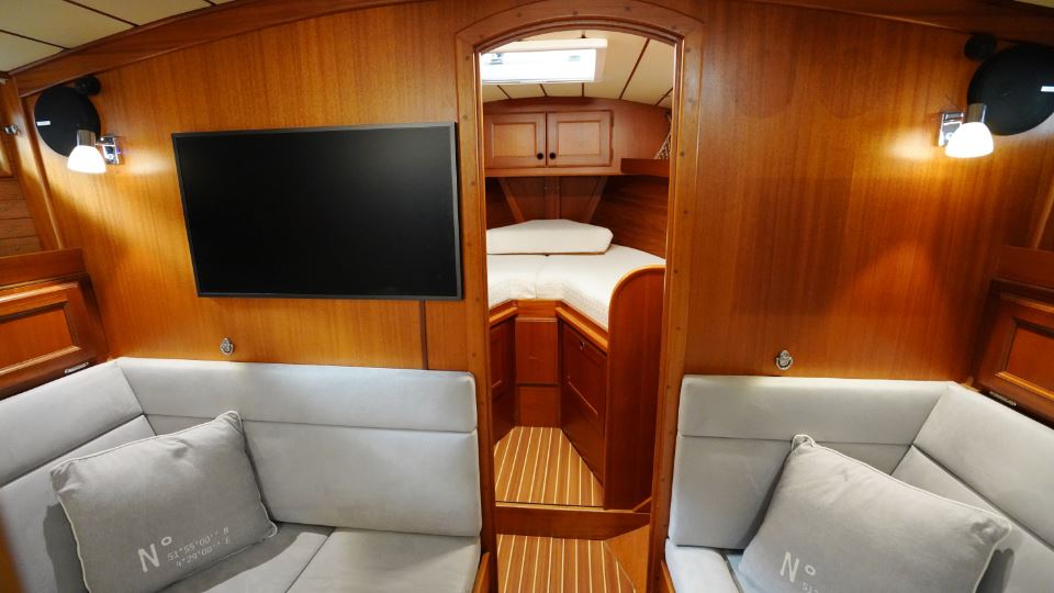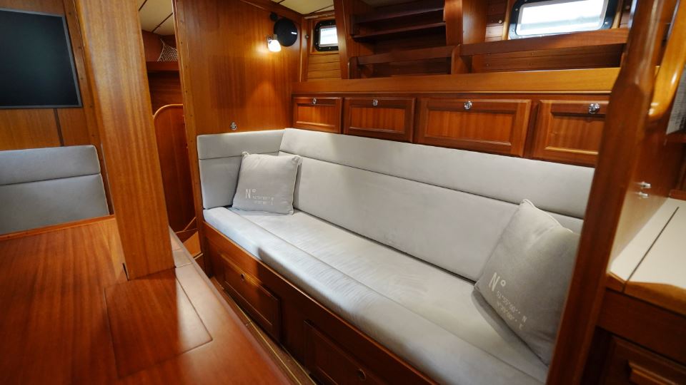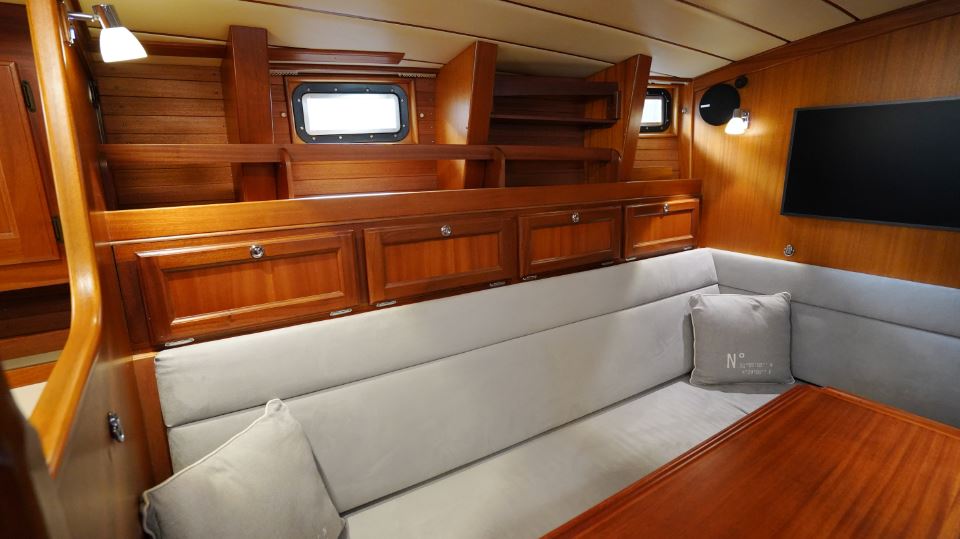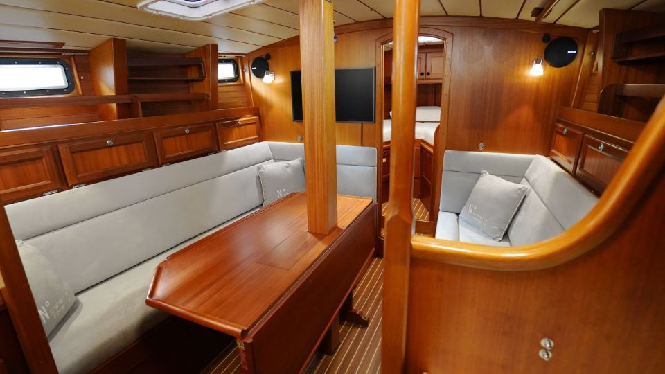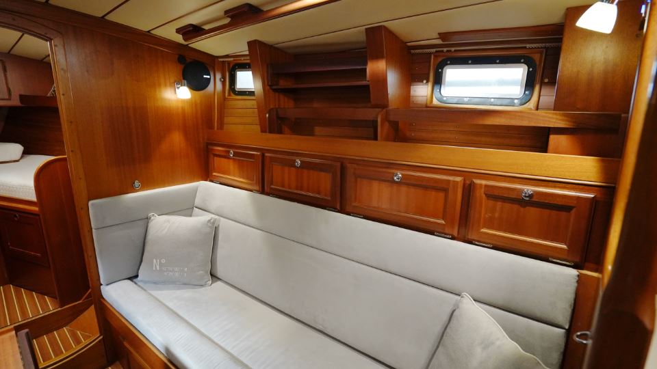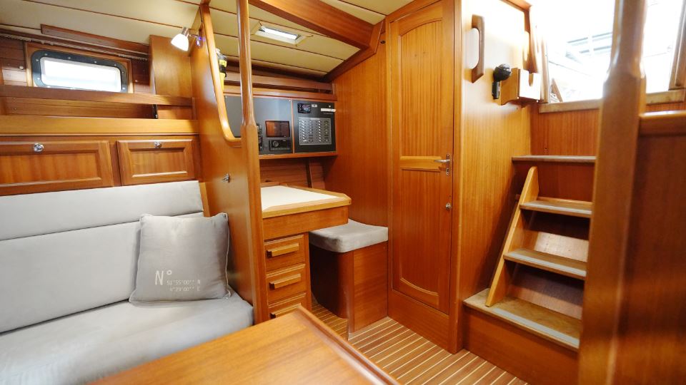 Below deck, you are greeted by the classic Najad ambiance – warm, welcoming and characterised by beautiful mahogany craftsmanship. The saloon forms the heart of the yacht, featuring two sofas that can also serve as berths and an elegant saloon table. It offers ample space for long evenings filled with conversation, reading and planning the next passage.