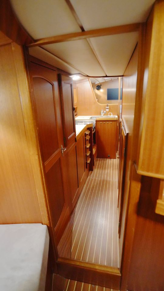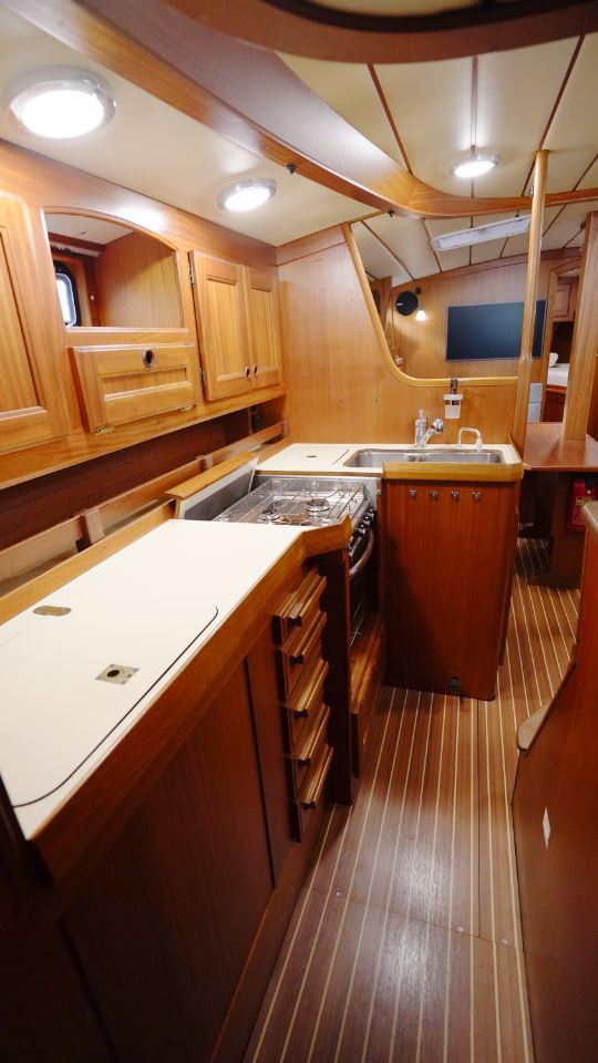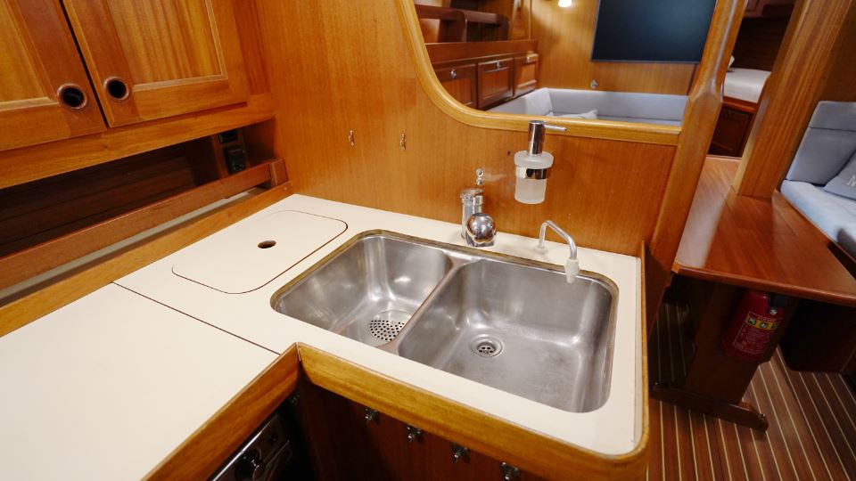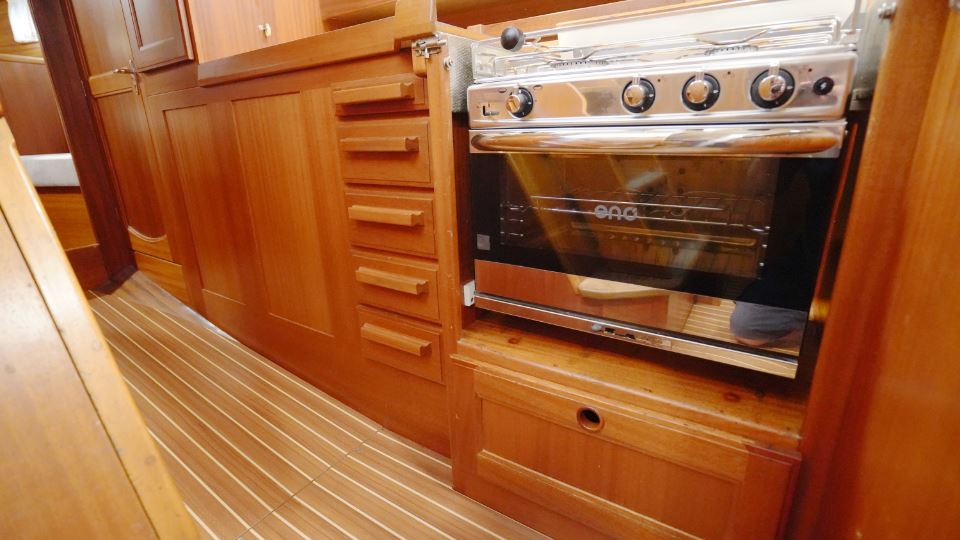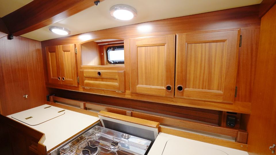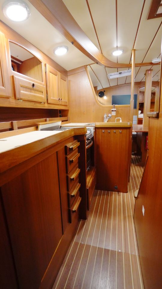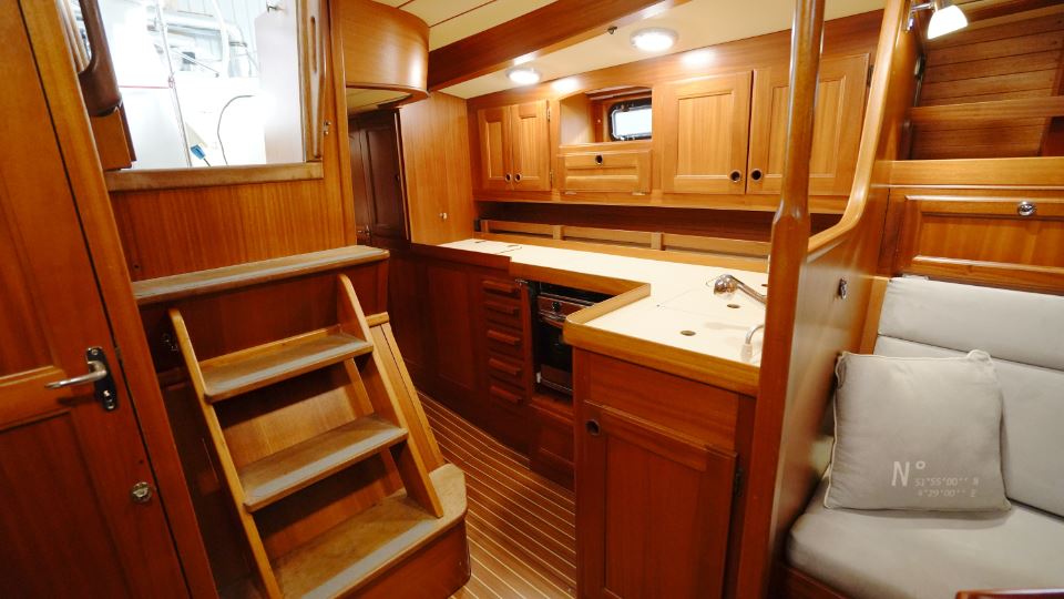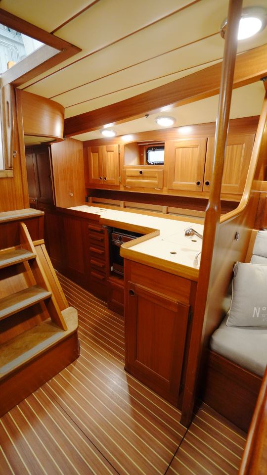 The galley is designed with practical functionality in mind and is located along the passageway leading aft. The layout ensures secure footing while under way and every surface is crafted to withstand extended time at sea. Generous storage, twin sinks, and ample workspace are all executed with the hallmark precision of Orust-built yachts.