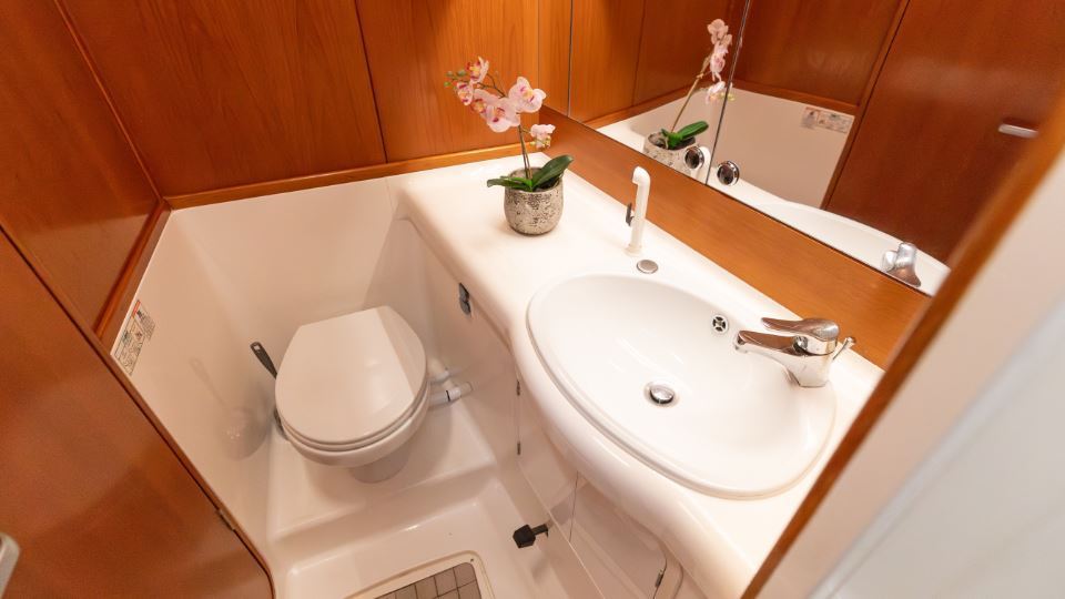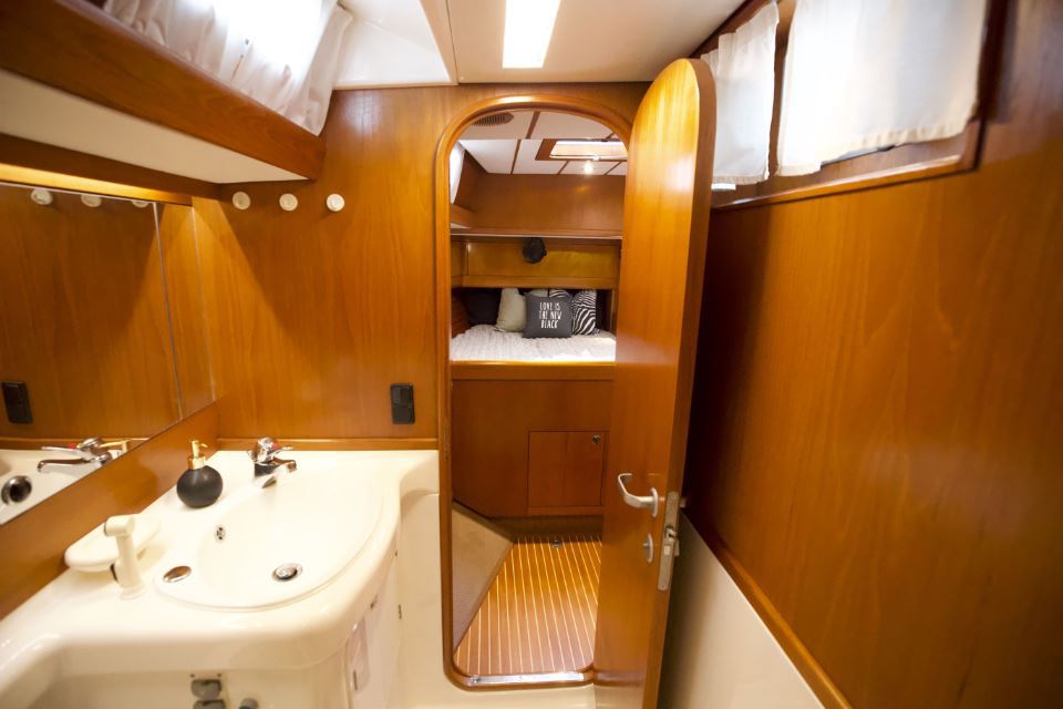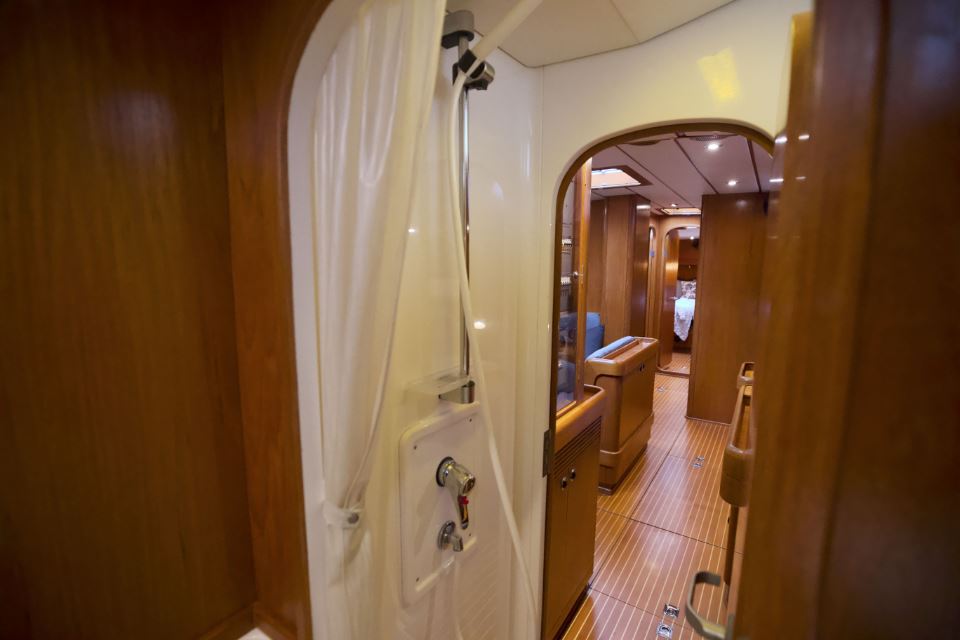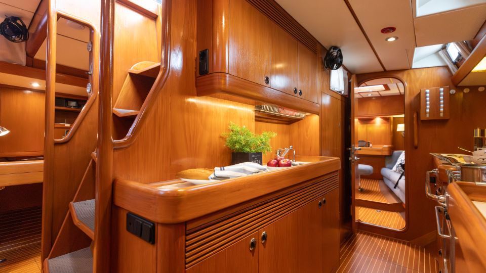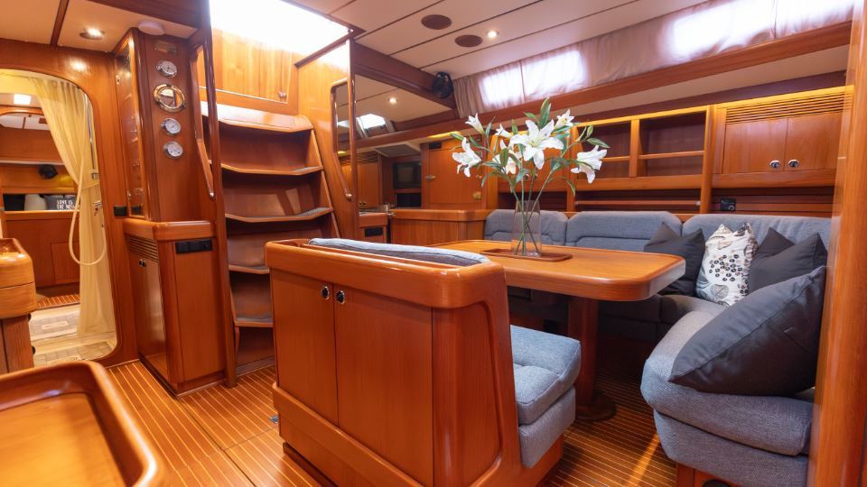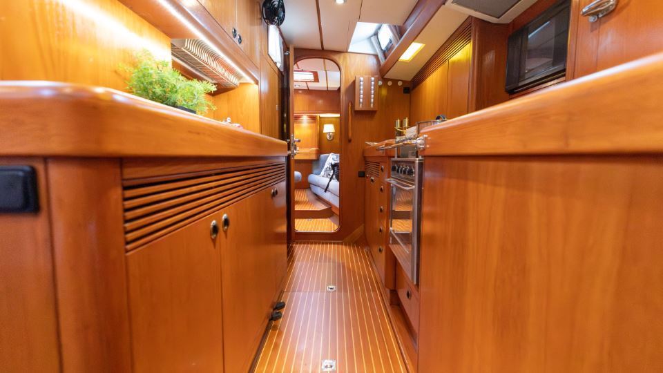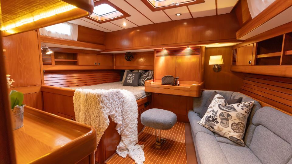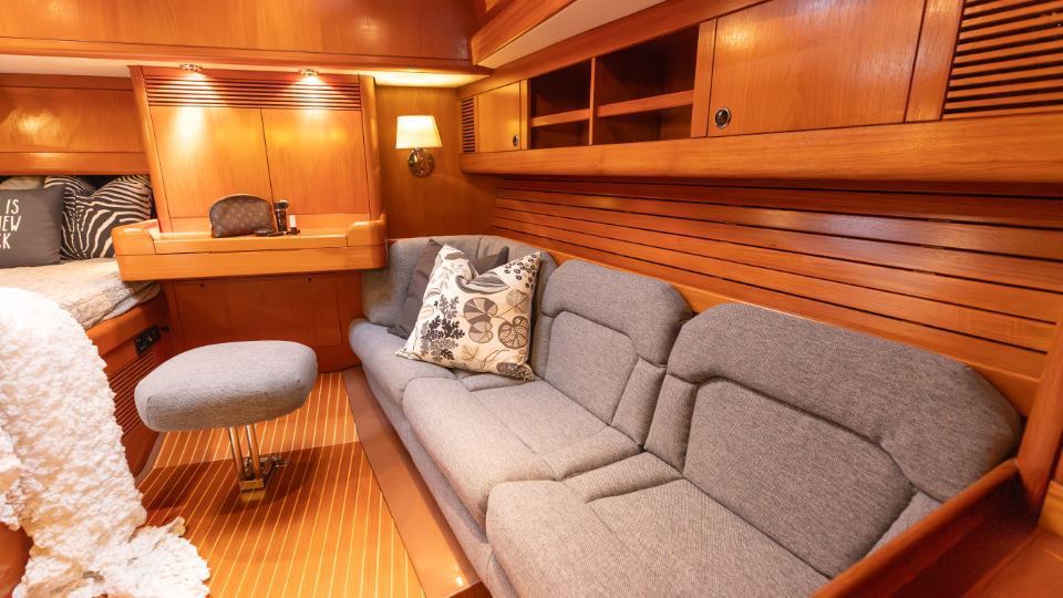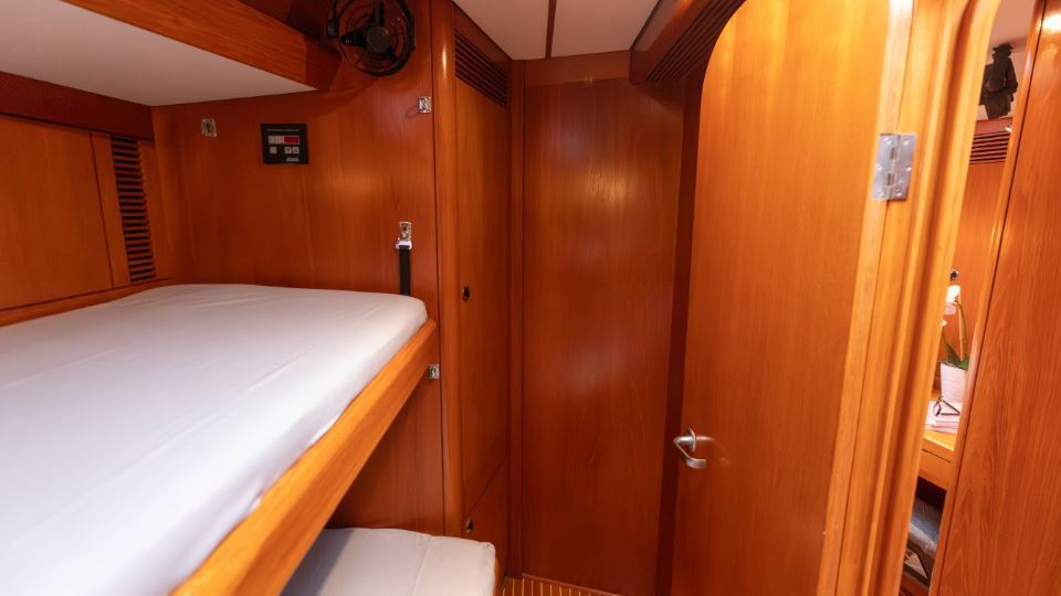 The interior is arranged in the three cabin, two heads Family Cruiser layout. The aft owner’s cabin is well suited for use at sea, with an offset double berth to starboard. Forward is a VIP double cabin, complemented by a guest bunk cabin amidships. Two large heads compartments with separate shower cubicles serve the accommodation, with the aft heads accessible directly from the saloon, creating a practical day heads arrangement. The interior is finished in teak with hand rubbed satin varnish and was refreshed in 2024 with extensive re varnishing and interior joinery work.