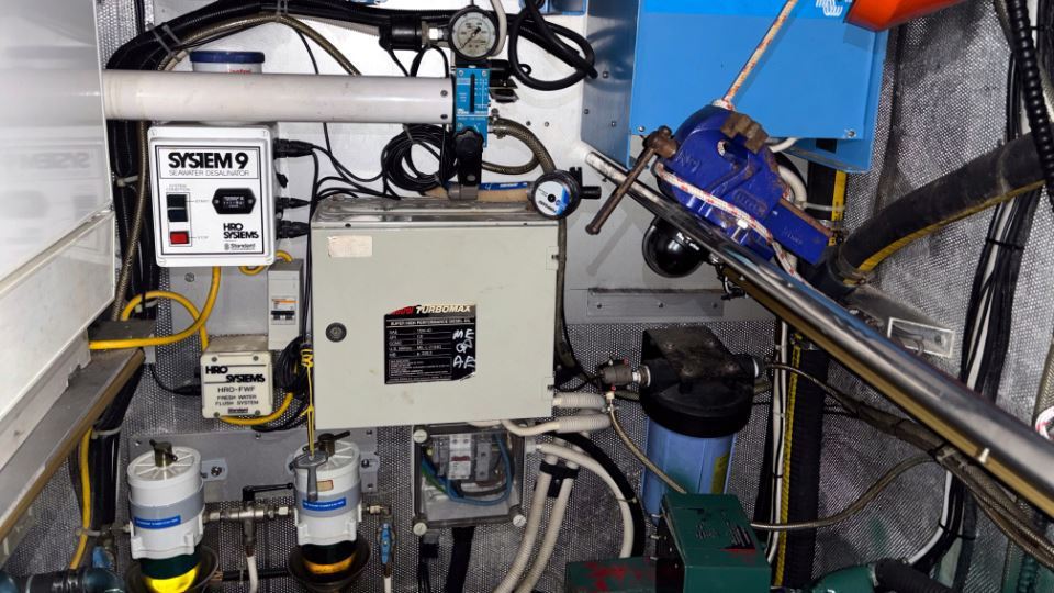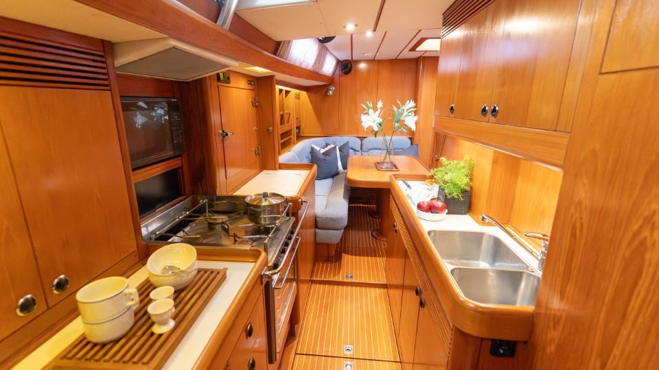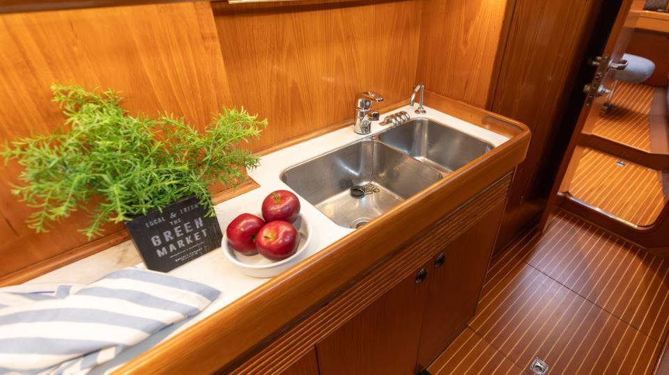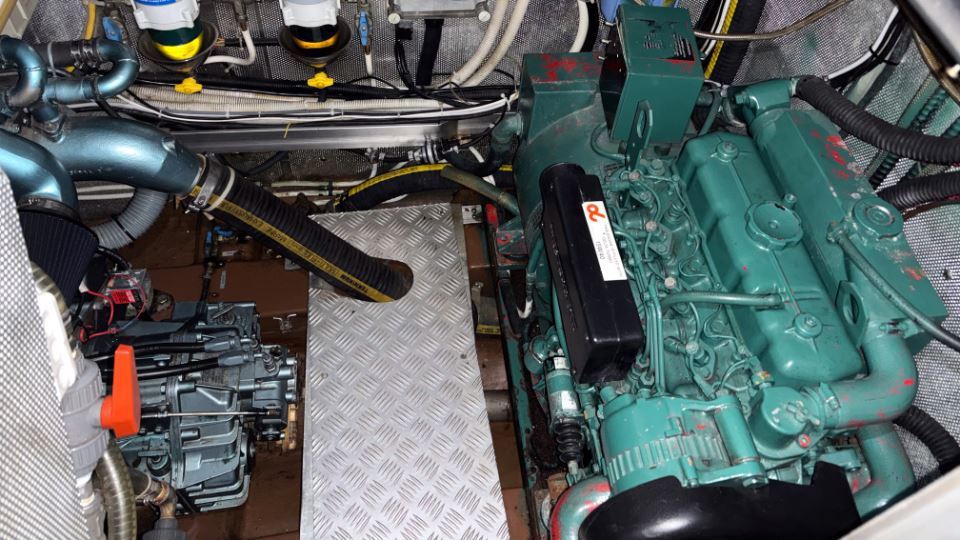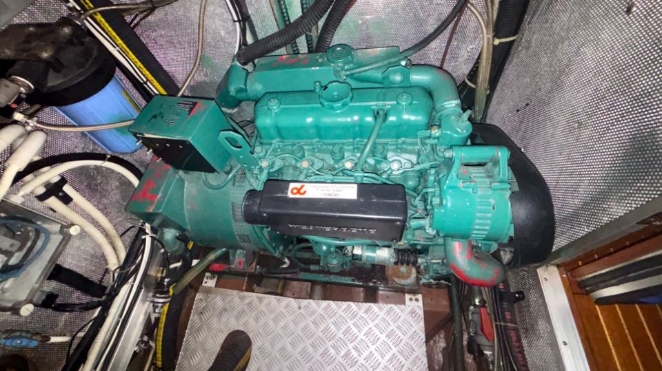 Power is provided by a Perkins 4M135 diesel engine producing 120hp, with low hours for her age. The engine is regularly serviced and fitted with a three bladed MaxProp propeller. A diesel generator, inverter, watermaker, diesel heating and reverse cycle air conditioning contribute to a high level of onboard autonomy. Tankage is generous, with approximately 620 litres of diesel and 880 litres of fresh water distributed in stainless steel tanks.