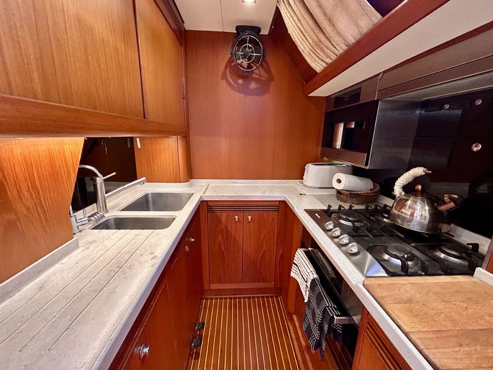 TENACITY comes with smart looking navy blue topsides, replaced teak decks, twin cockpits, push button sail controls and is powered by a 100hp shaft driven Yanmar diesel engine. Her layout consists of three cabins forward with bunk berths, forward head, saloon, galley, chart table, owners cabin aft with central double berth, and ensuite head.