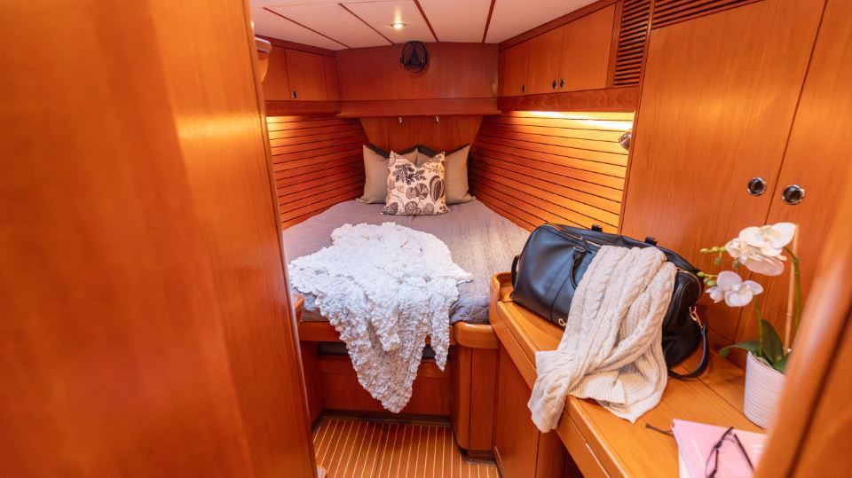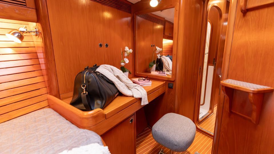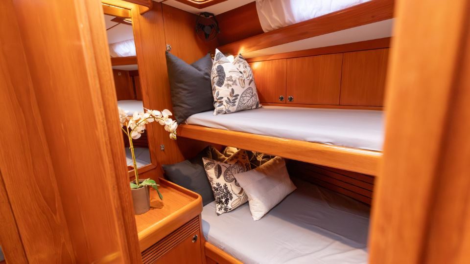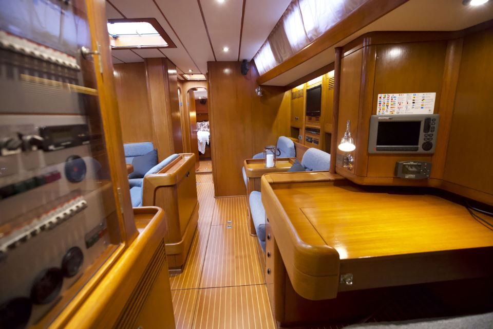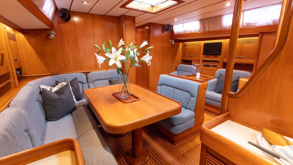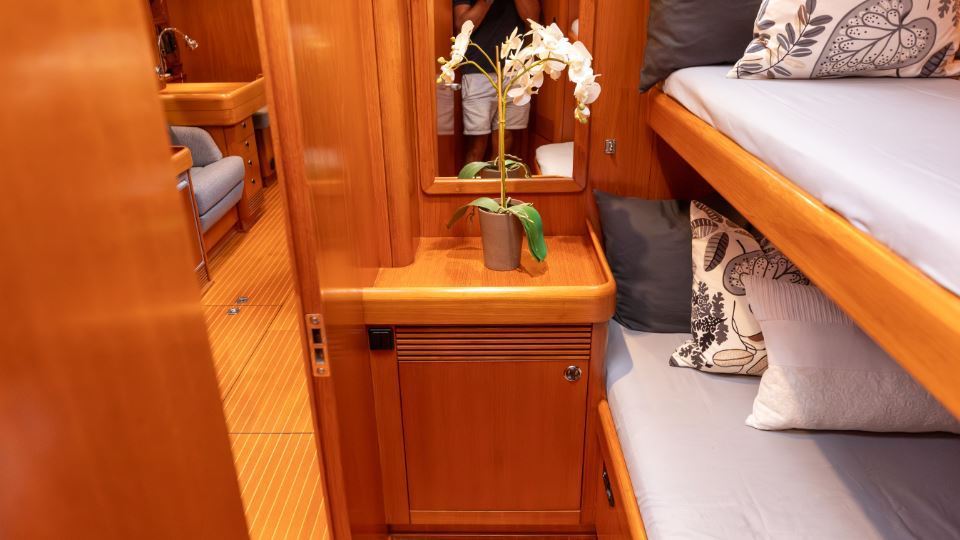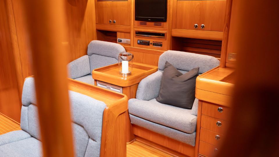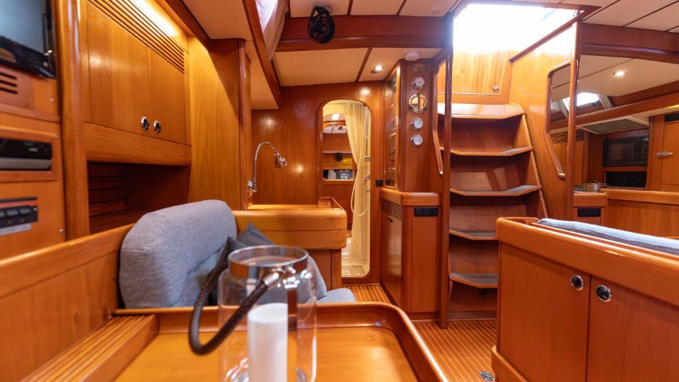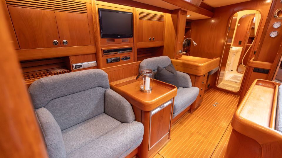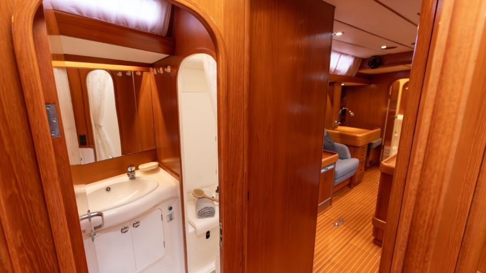 The interior is arranged in the three cabin, two heads Family Cruiser layout. The aft owner’s cabin is well suited for use at sea, with an offset double berth to starboard. Forward is a VIP double cabin, complemented by a guest bunk cabin amidships. Two large heads compartments with separate shower cubicles serve the accommodation, with the aft heads accessible directly from the saloon, creating a practical day heads arrangement. The interior is finished in teak with hand rubbed satin varnish and was refreshed in 2024 with extensive re-varnishing and interior joinery work.