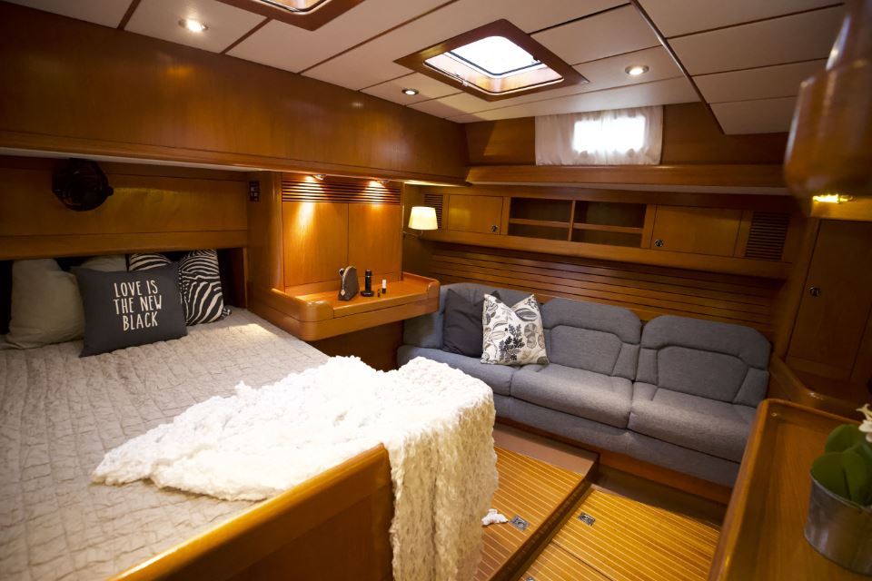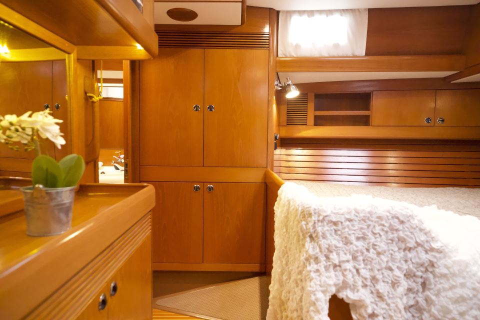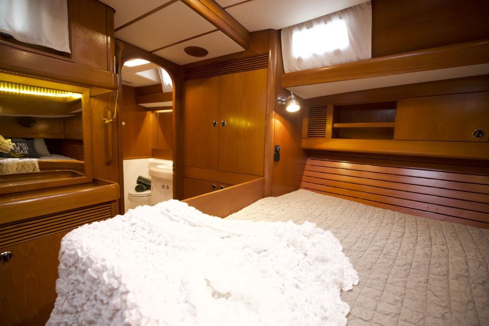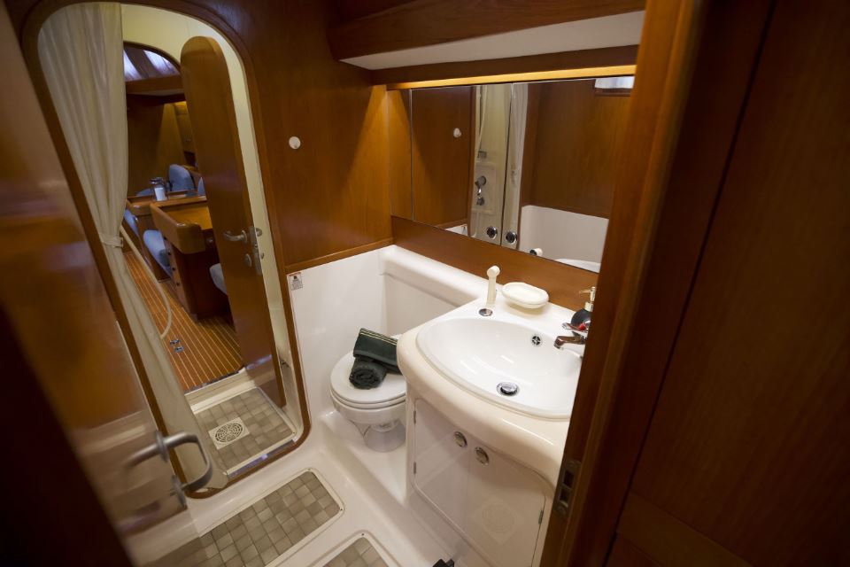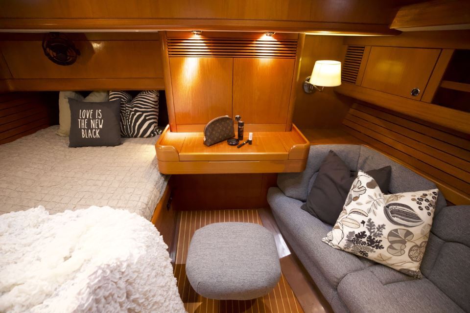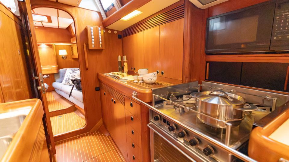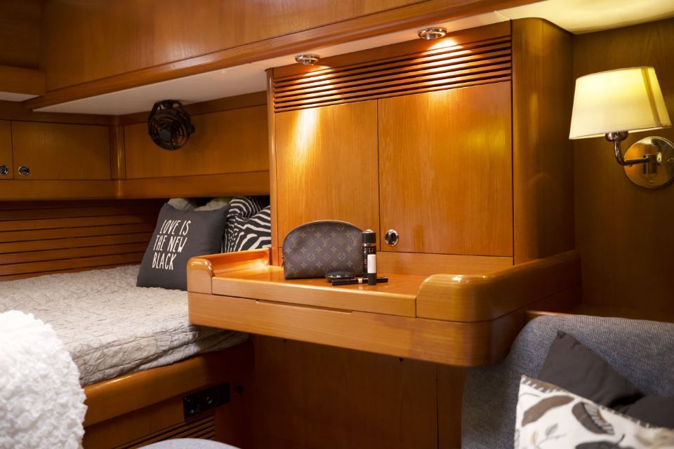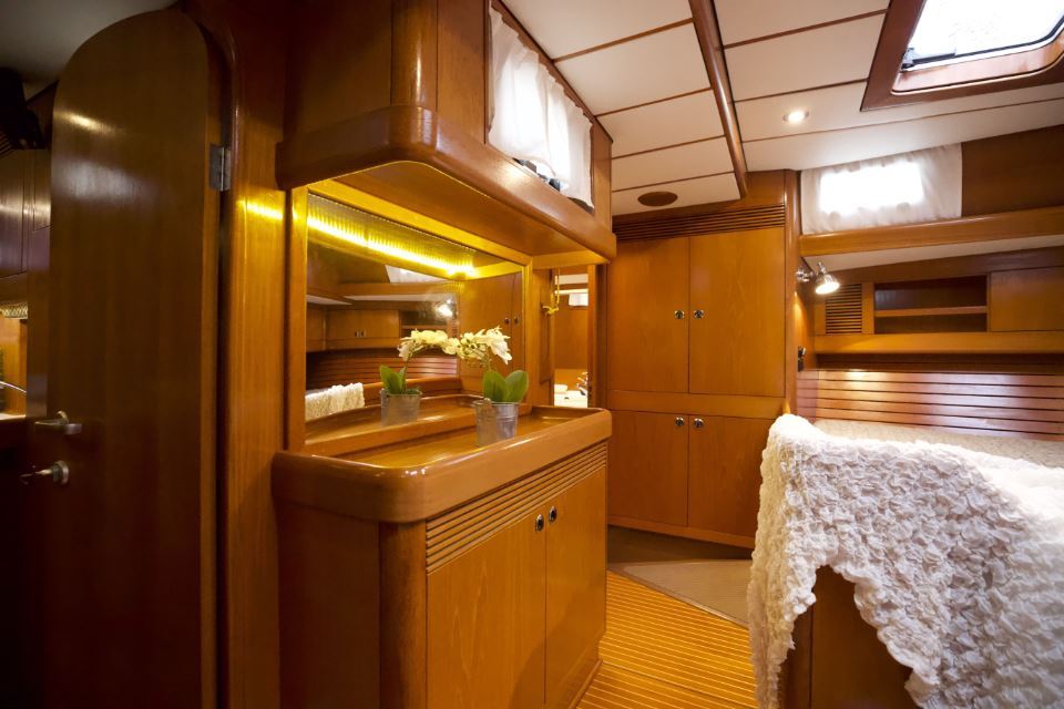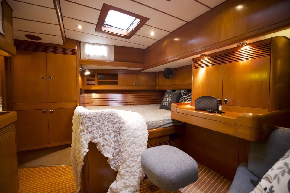 The interior is arranged in the three cabin, two heads Family Cruiser layout. The aft owner’s cabin is well suited for use at sea, with an offset double berth to starboard. Forward is a VIP double cabin, complemented by a guest bunk cabin amidships. Two large heads compartments with separate shower cubicles serve the accommodation, with the aft heads accessible directly from the saloon, creating a practical day heads arrangement. The interior is finished in teak with hand rubbed satin varnish and was refreshed in 2024 with extensive re-varnishing and interior joinery work.