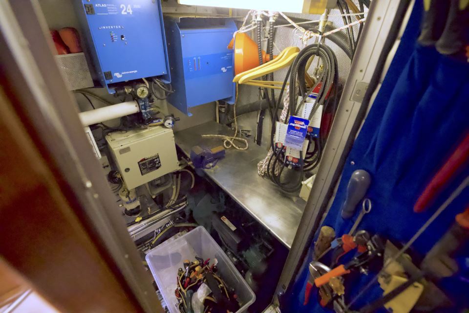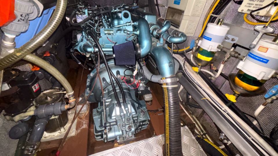 Power is provided by a Perkins 4M135 diesel engine producing 120hp, with low hours. The engine is regularly serviced and paired with a three bladed MaxProp propeller. A diesel generator, inverter, watermaker, diesel heating and reverse cycle air conditioning contribute to a high level of onboard autonomy. Tankage is generous, with approximately 620 litres of diesel and 880 litres of fresh water distributed from stainless steel tanks.