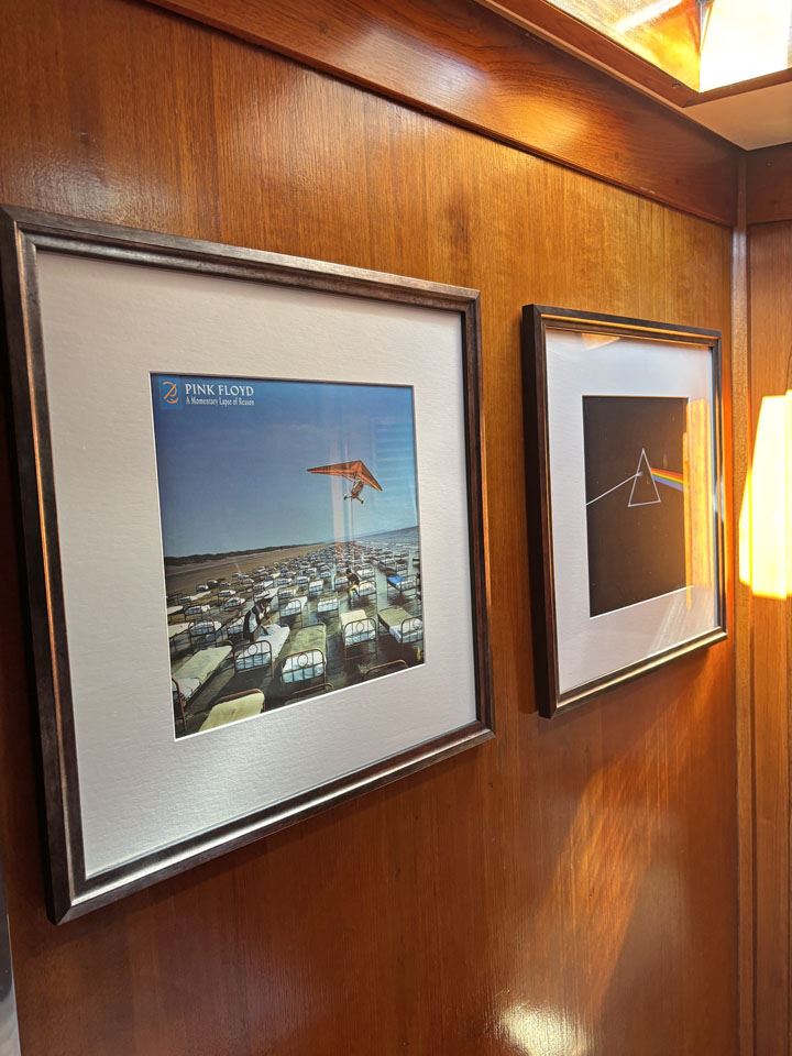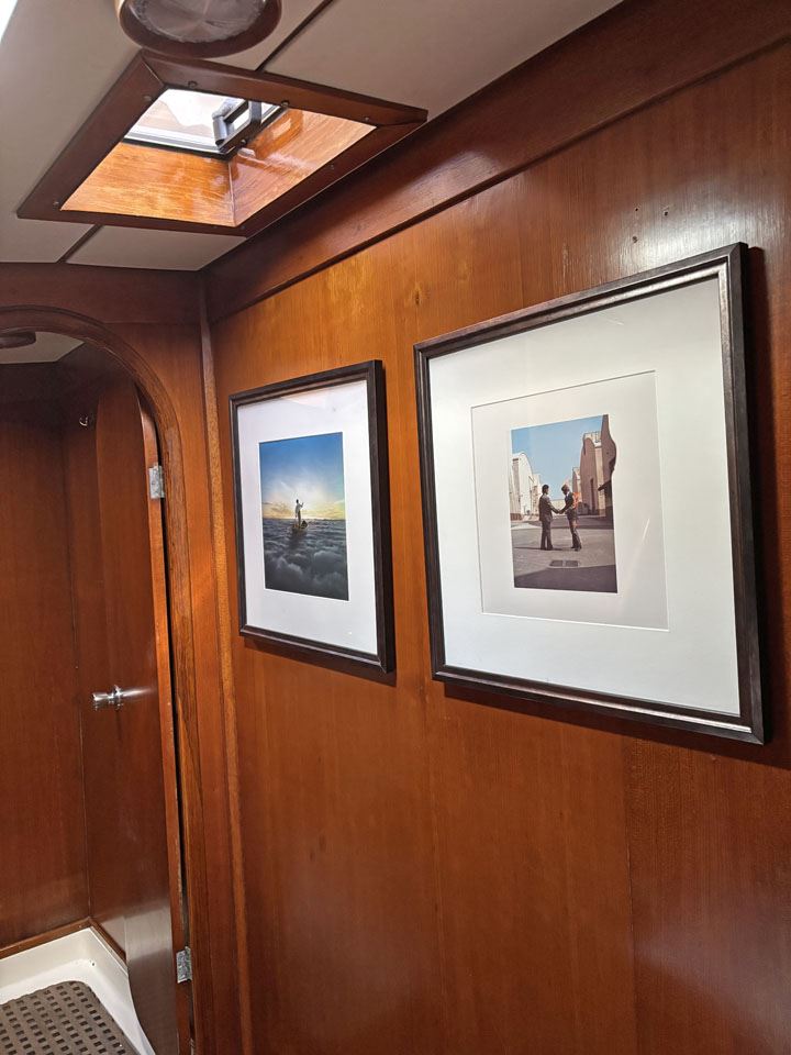 There is still onboard an original “promotional not for sale” collection of CD-ROM of the Pink Floyd group, as well as four Pink Floyd albums framed on the walls of the forward cabin.