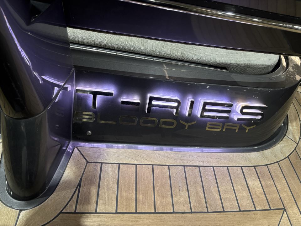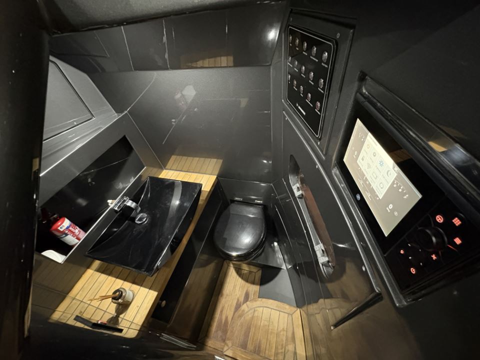 T/T RIES features teak decking throughout, with convertible teak tables that transform the social seating into sunpads forward and aft. Three facing forward at the helm, protected by the opening windscreen and T-top providing shade. The open walk-around deck, teak boarding steps, and stainless steel handholds make boarding and moving around effortless. There is also a fresh water flush electric head installed, enhancing practicality for guests on board. Bow and stern sunshades, removable cushions, and protective covers combine luxury with practicality.
